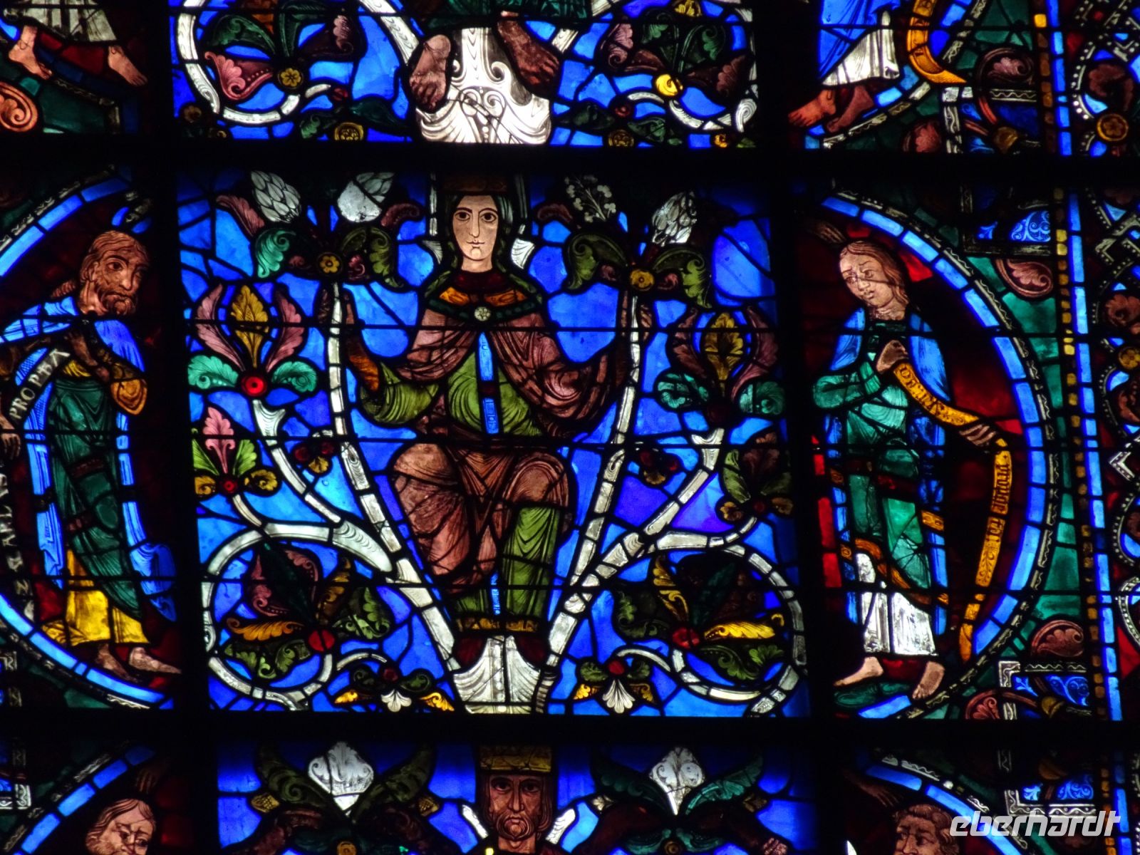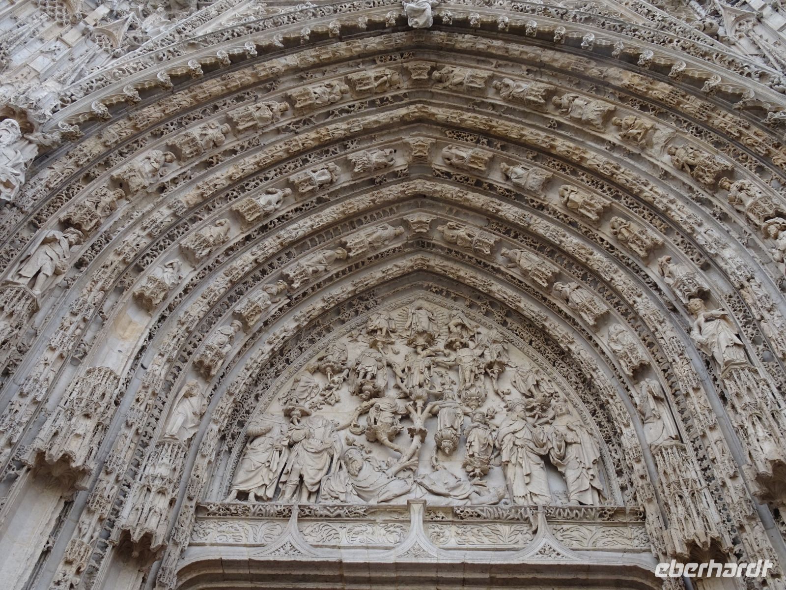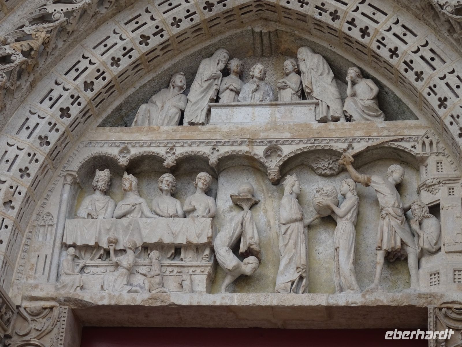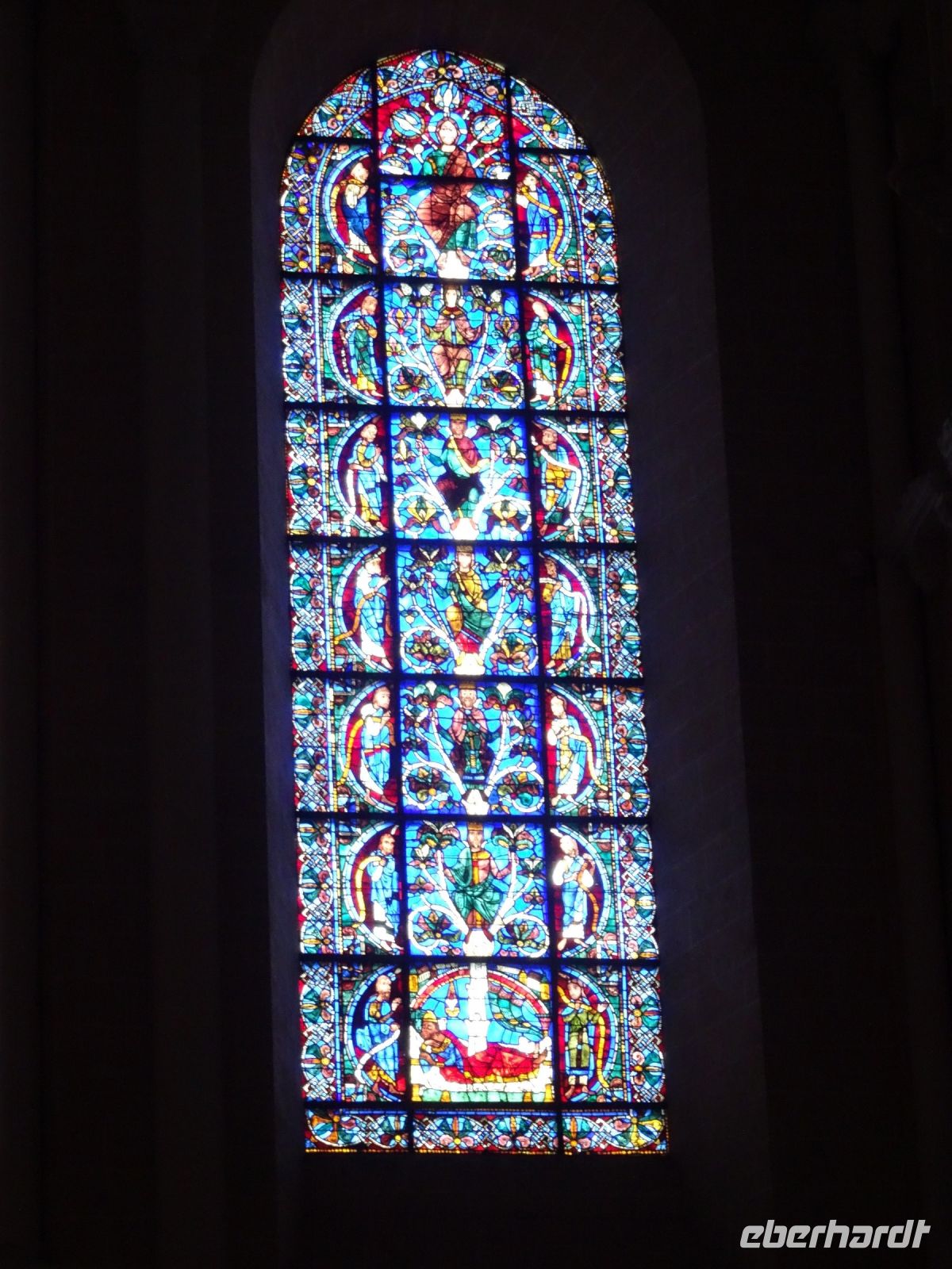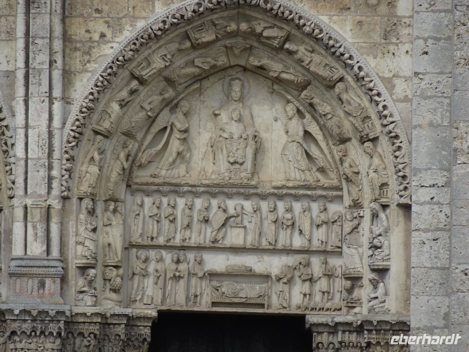 Wir betreten die Kathedrale durch das Mittelportal. Das Tympanon, so wird der mit Figuren geschmückte Giebel über dem Eingang genannt, ist mit einer Wurzel Jesse geschmückt. Hierbei wird der Lebensbaum von Jesu in Abstammung aus dem Hause David dargestellt.