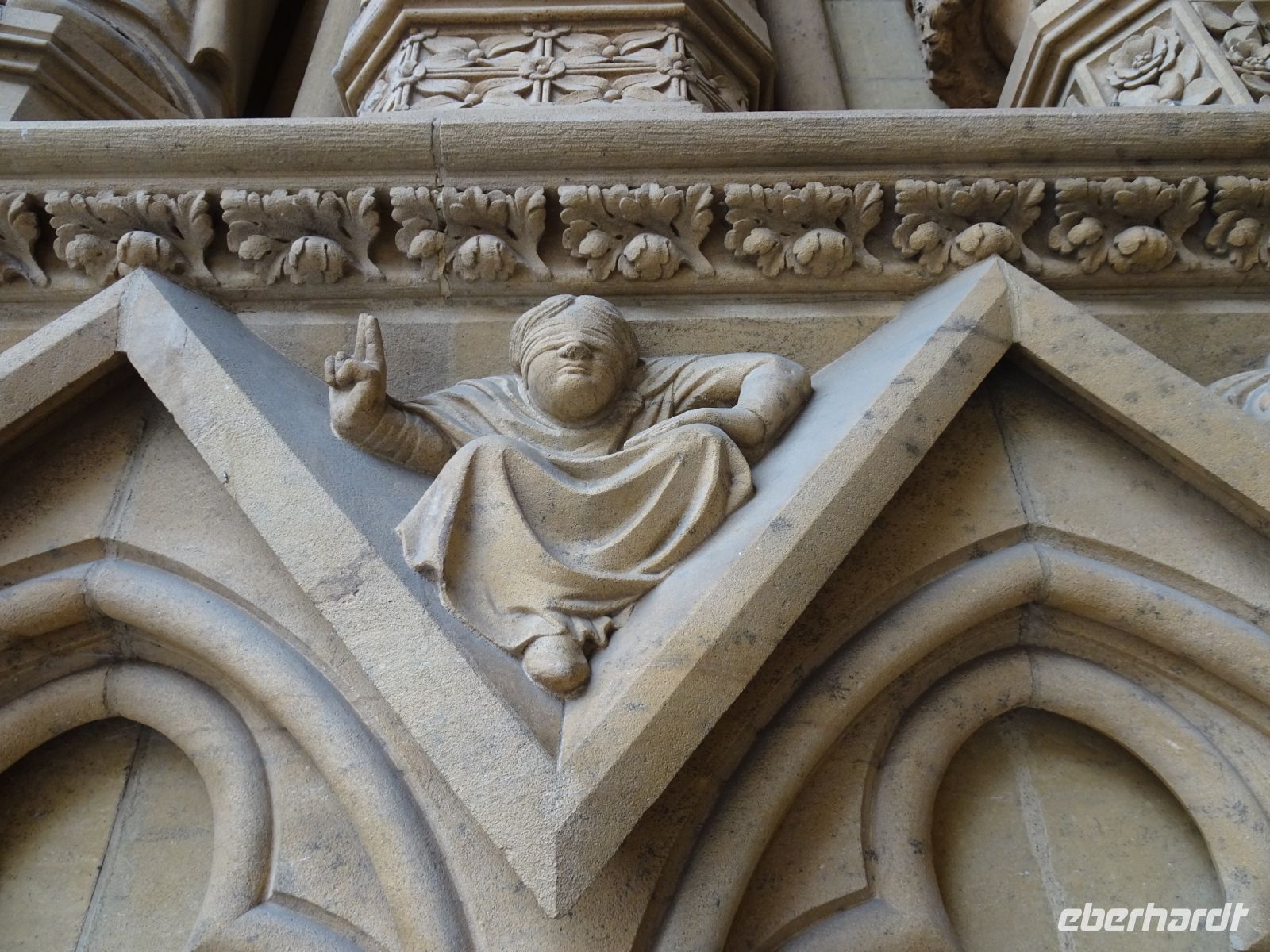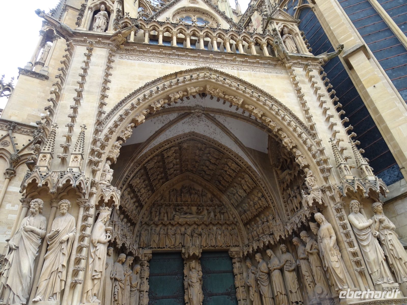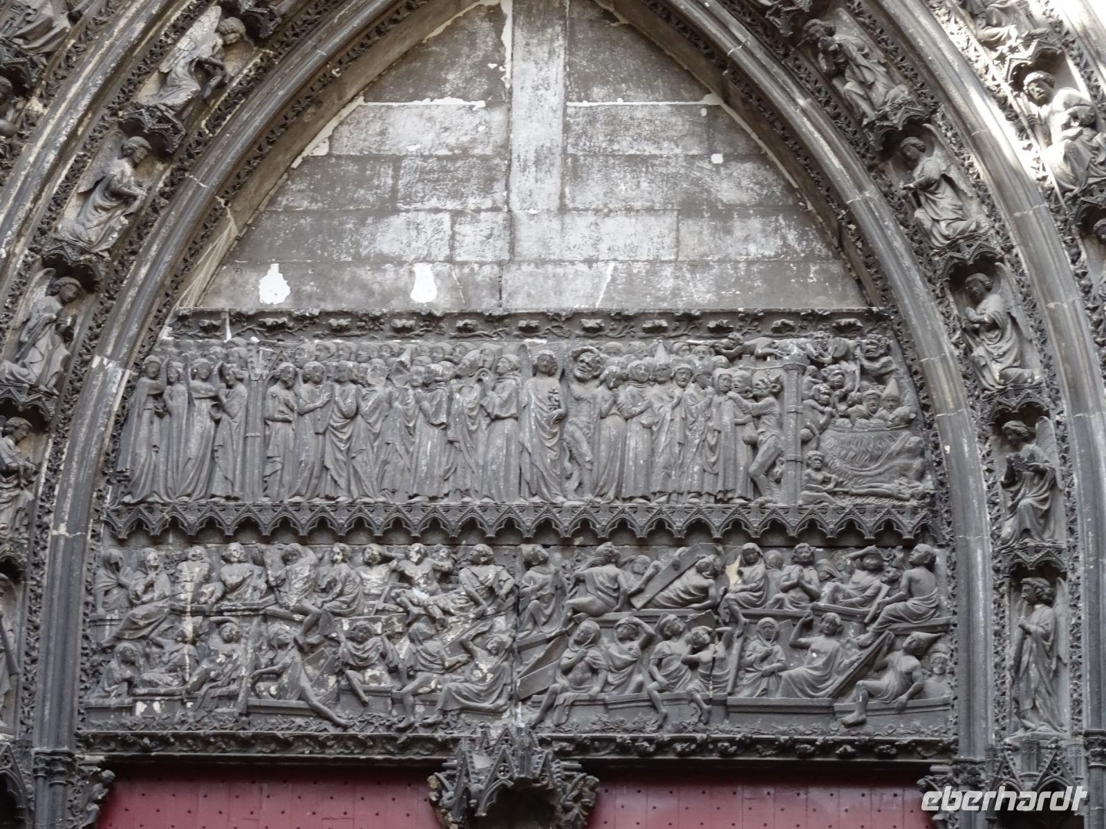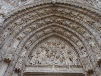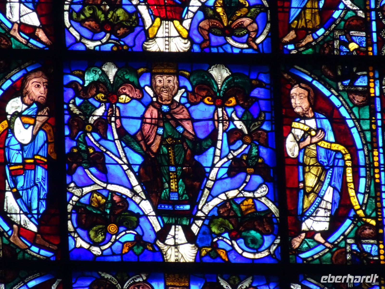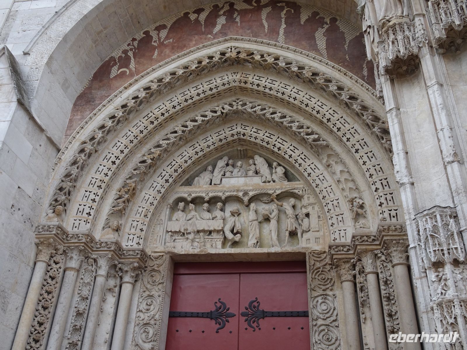 Wir betreten die Kathedrale durch das Mittelportal. Das Tympanon, so wird der mit Figuren geschmückte Giebel über dem Eingang genannt, ist mit einer Wurzel Jesse geschmückt. Hierbei wird der Lebensbaum von Jesu in Abstammung aus dem Hause David dargestellt.
