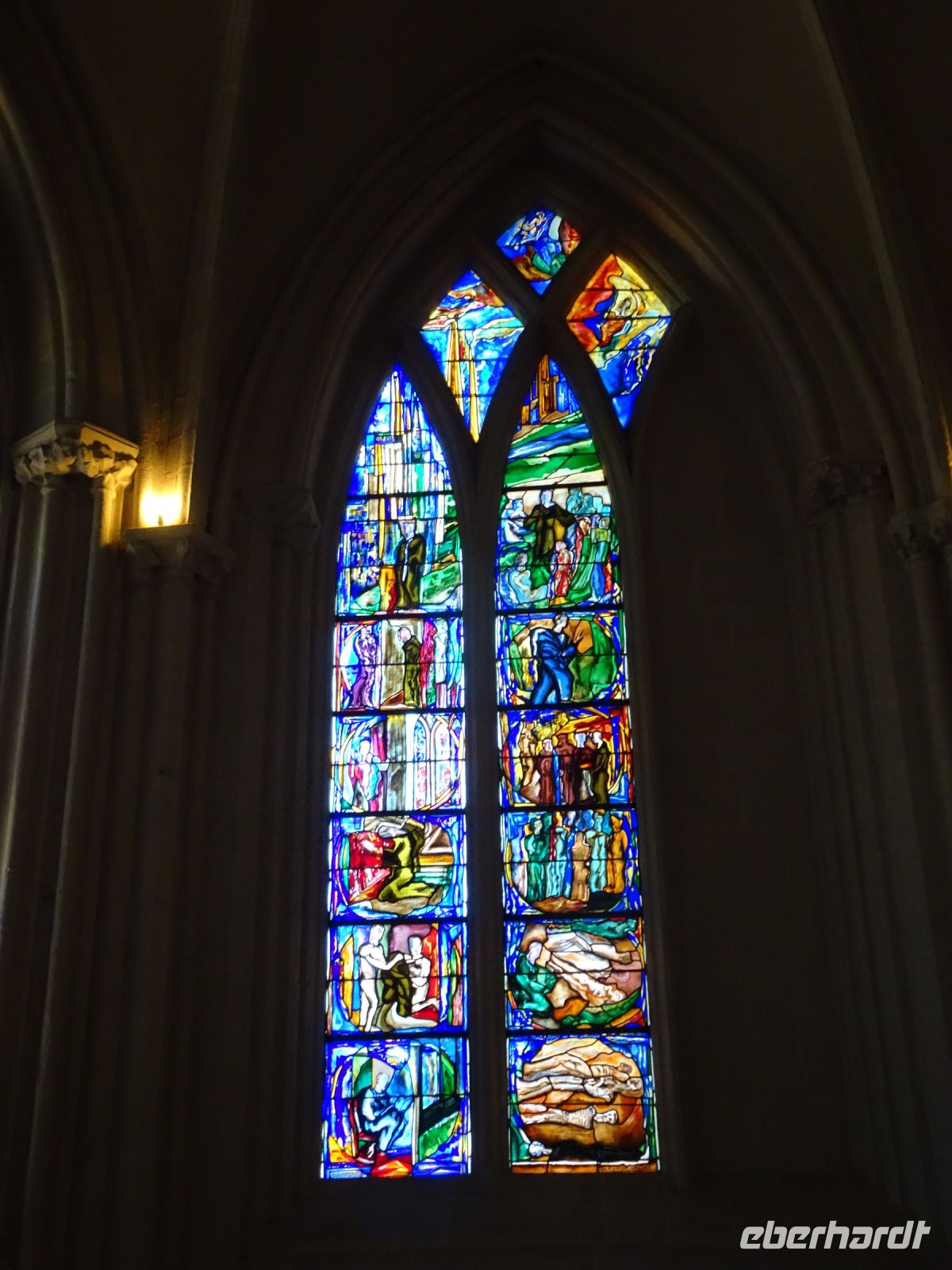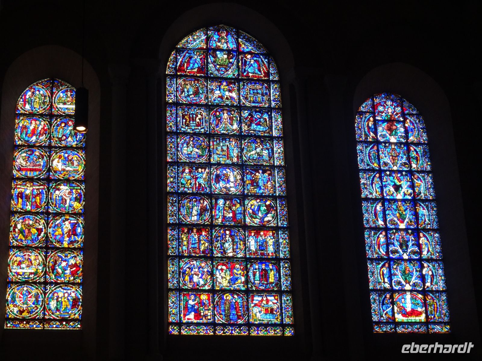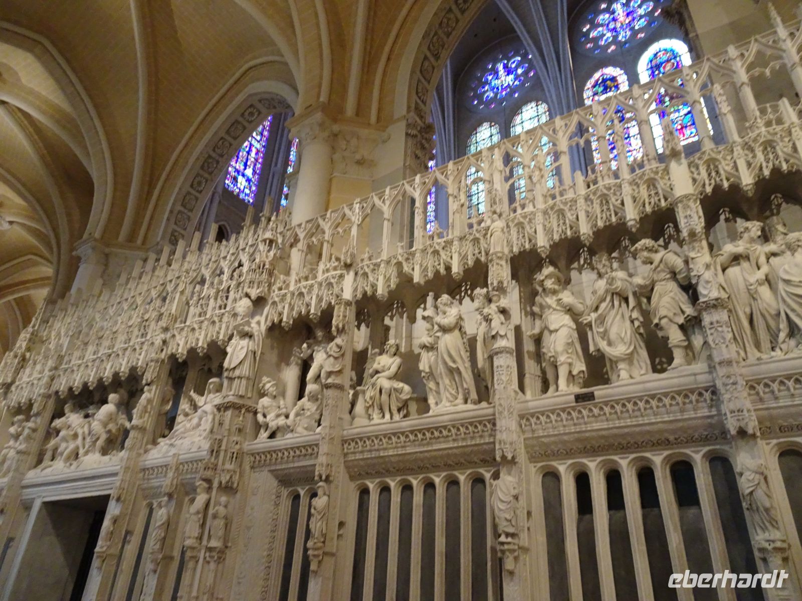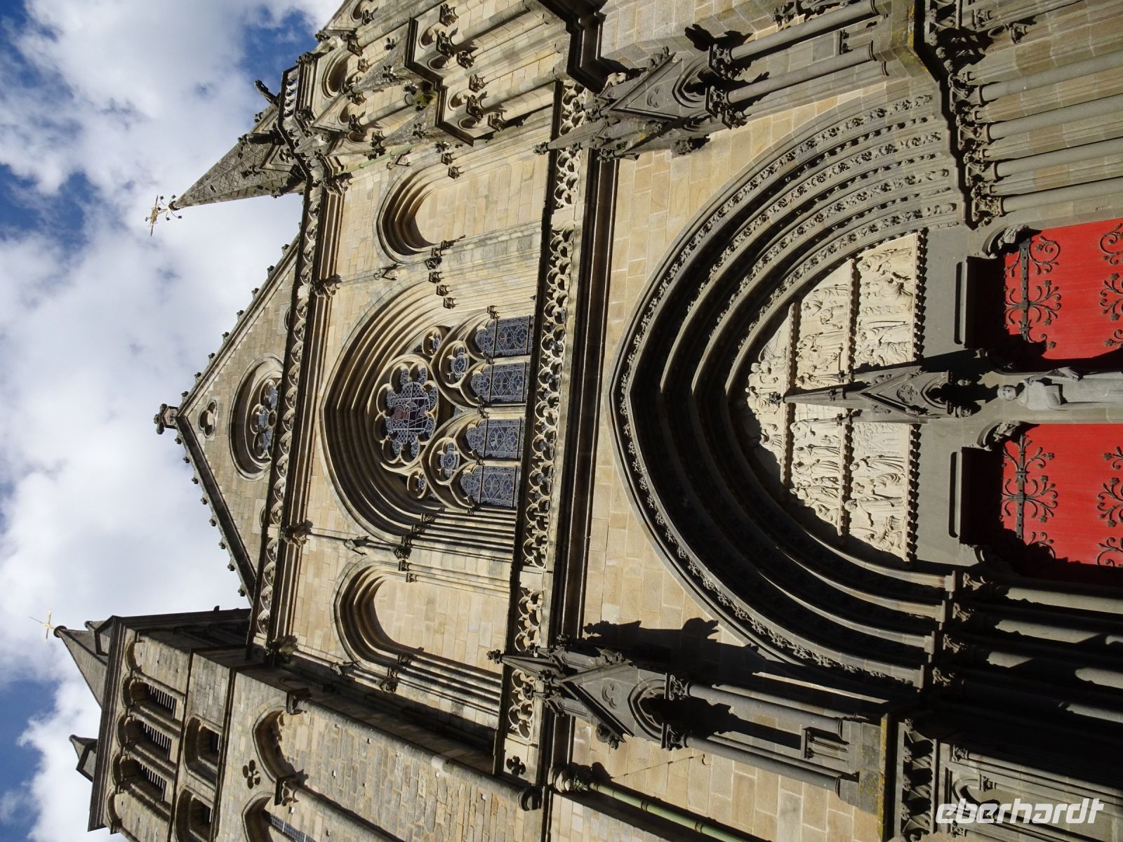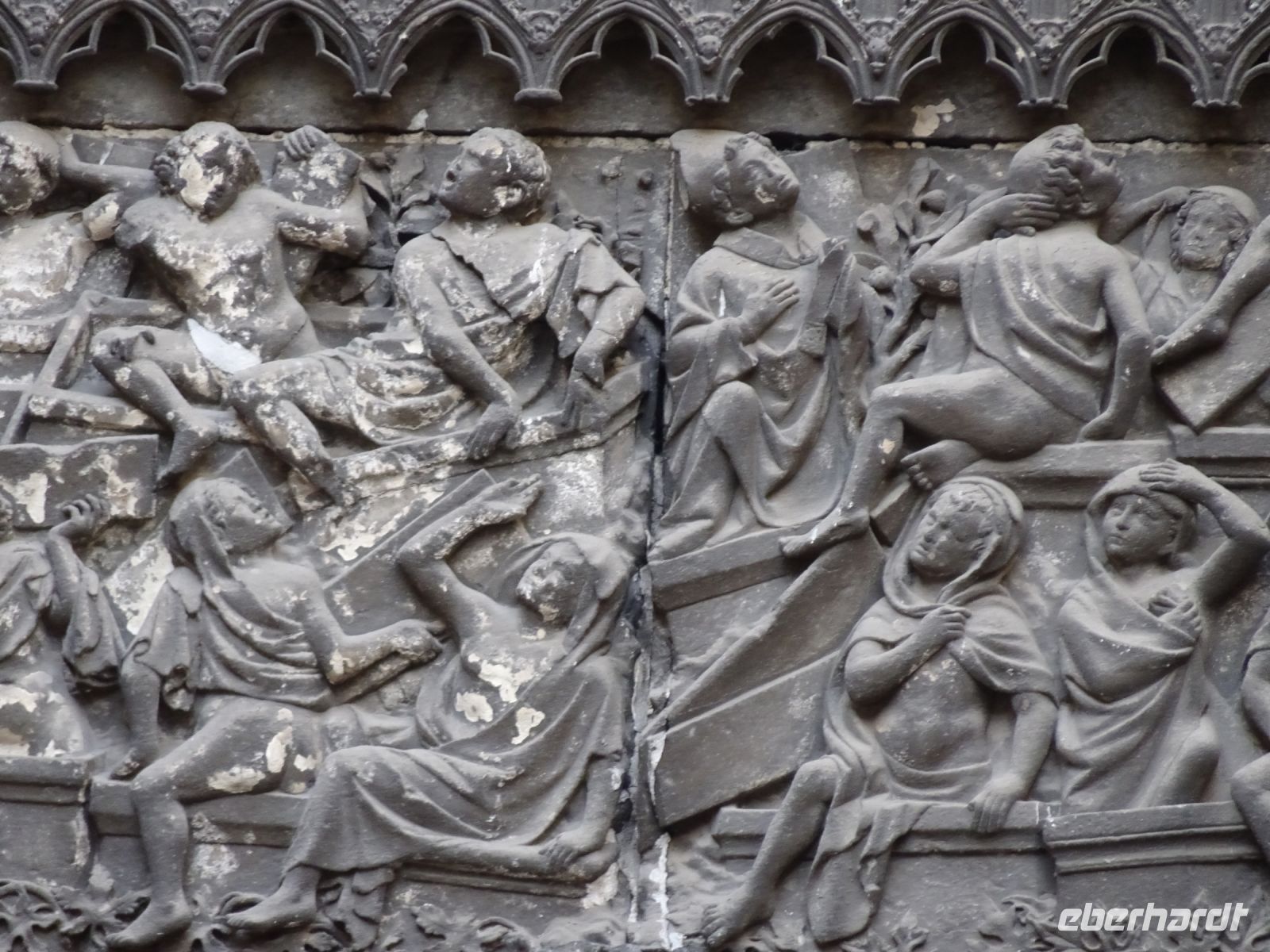 Wir betreten die Kathedrale durch das Mittelportal. Das Tympanon, so wird der mit Figuren geschmückte Giebel über dem Eingang genannt, ist mit einer Wurzel Jesse geschmückt. Hierbei wird der Lebensbaum von Jesu in Abstammung aus dem Hause David dargestellt.