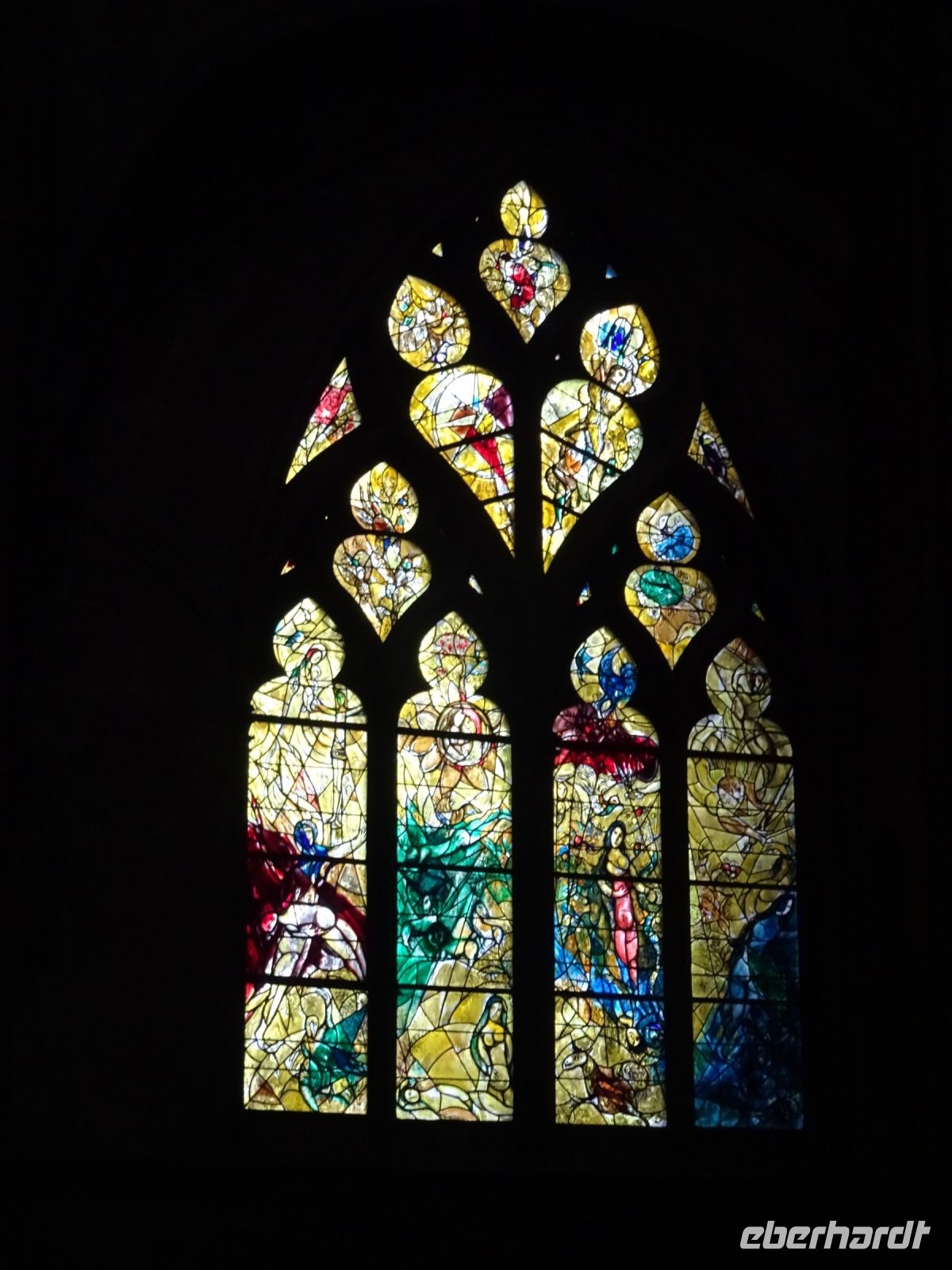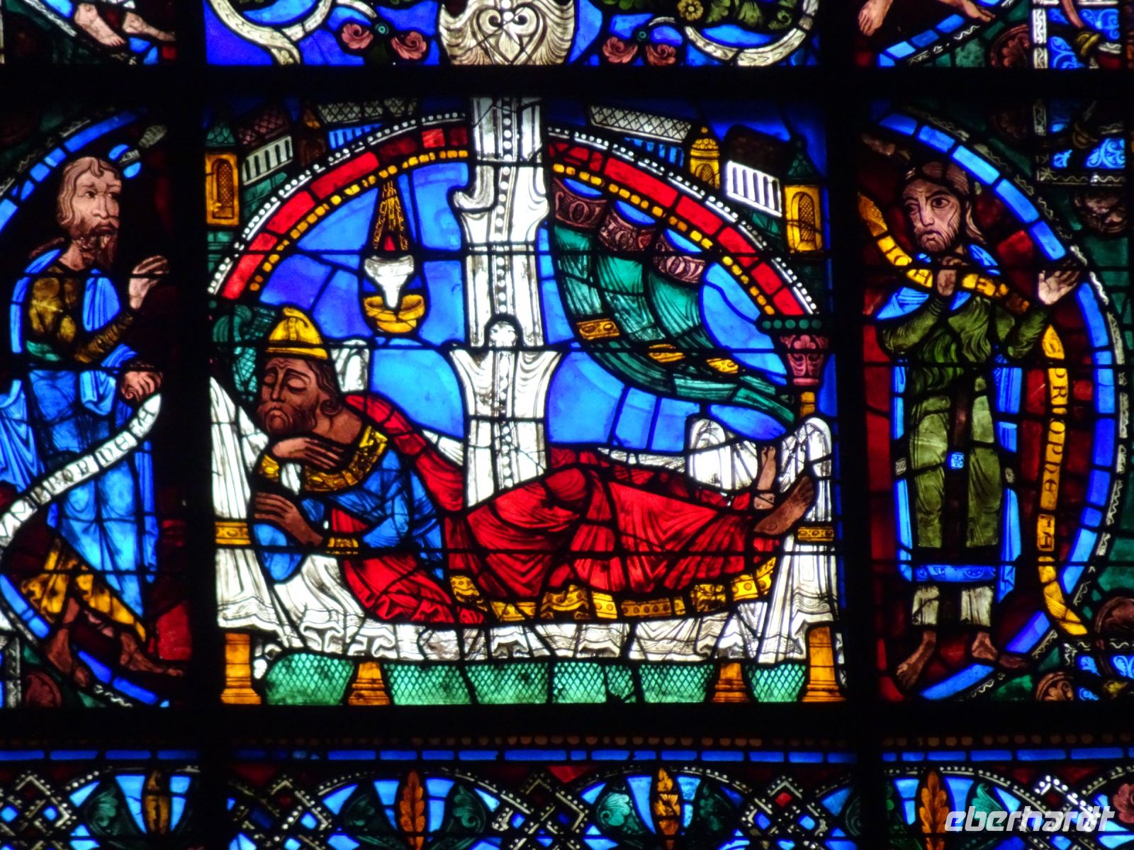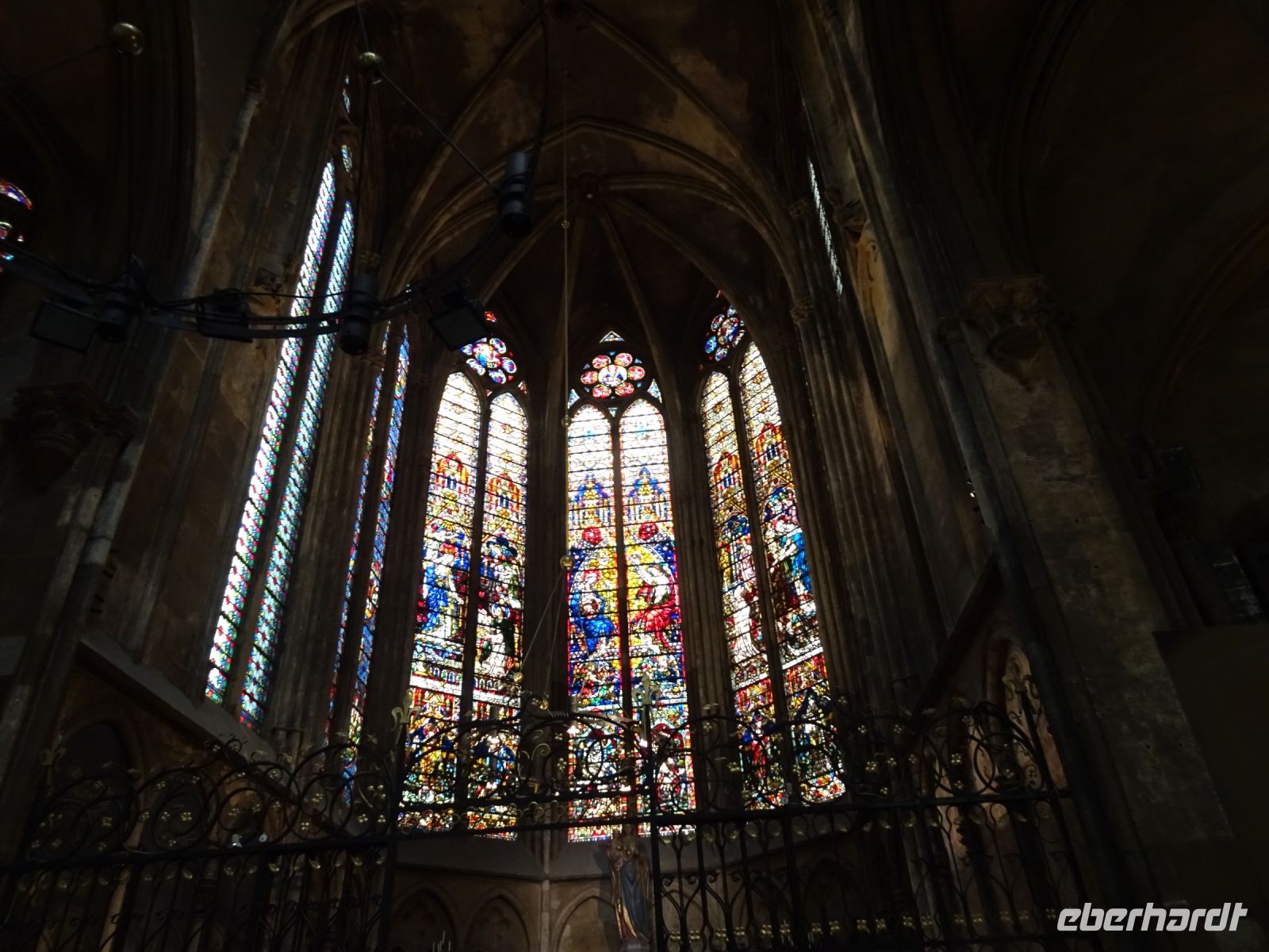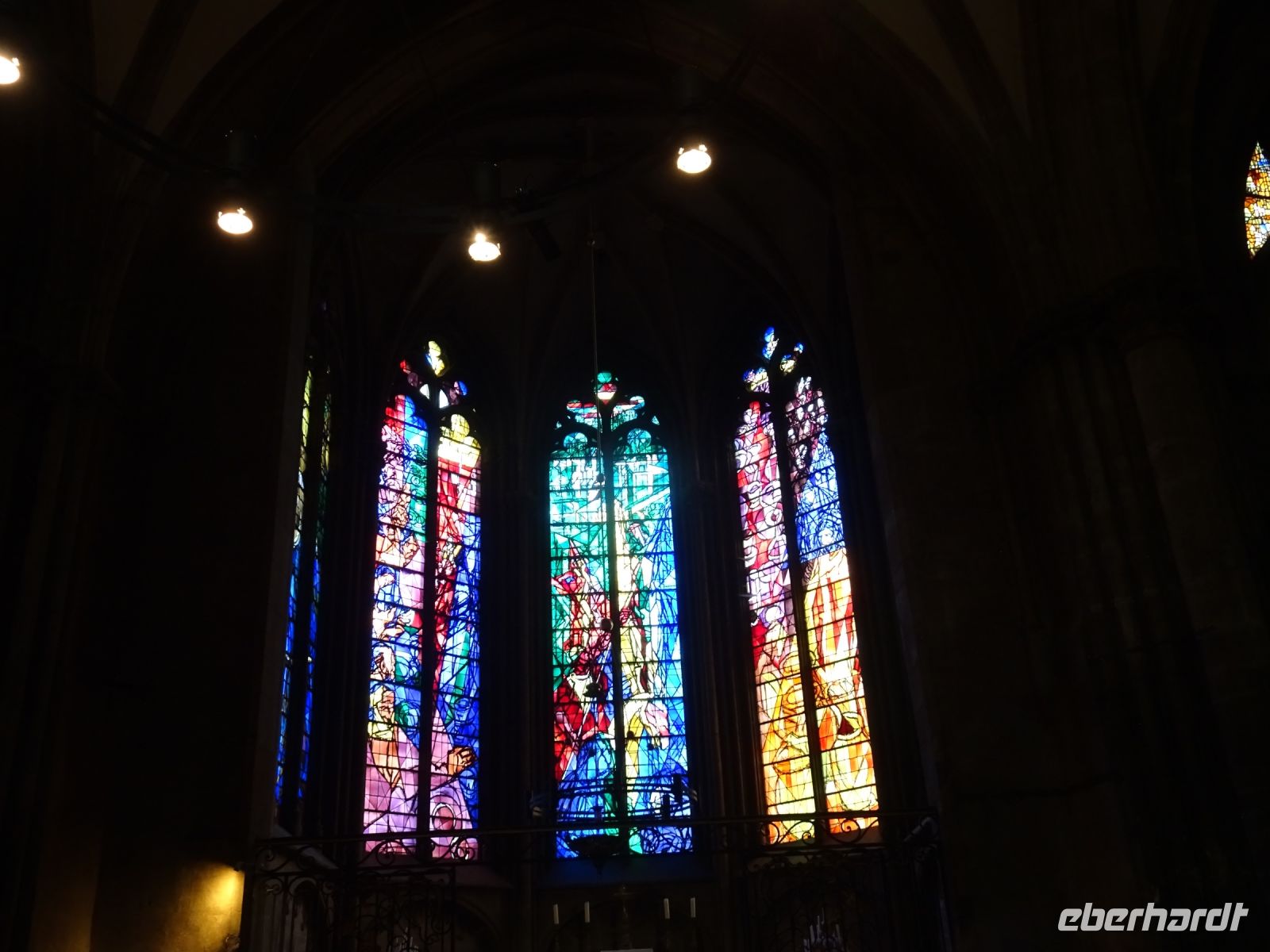 Nachmittags besuchen wir ein letztes Mal eine beeindruckende Kathedrale, diesmal in Chartres. Natürlich heißt auch diese Notre Dame, das kennen wir ja schon. Das Besondere an dieser Kathedrale sind die Fenster aus dem 13. Jahrhundert, die fast ausschließlich im Original erhalten sind. Darüber hinaus gibt es 181 Darstellungen der Jungfrau Maria und über 3500 Skulpturen, deren Anblick überwältigend ist. Auf dem Boden ist ein Labyrinth abgebildet, heute leider mit Stühlen zugestellt. 176 farbige Fenster, die dem „Chartres-Blau“ seinen Namen gaben.