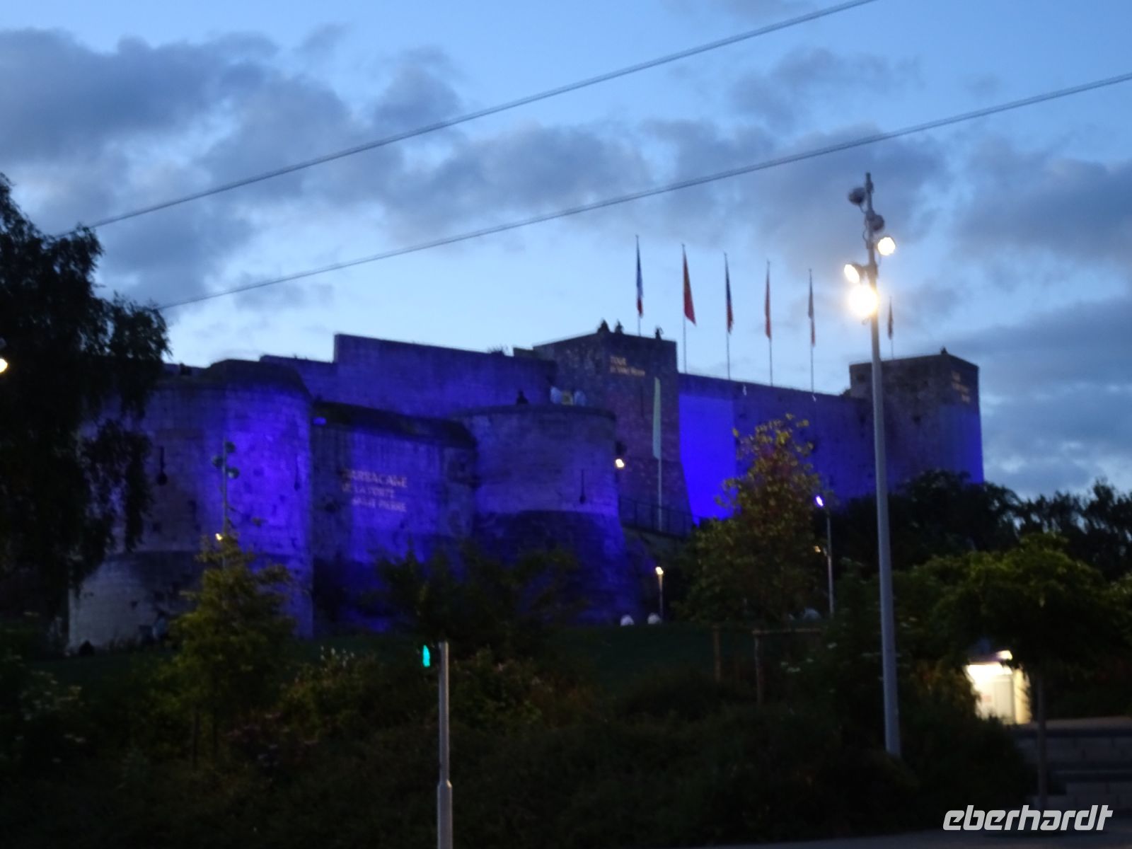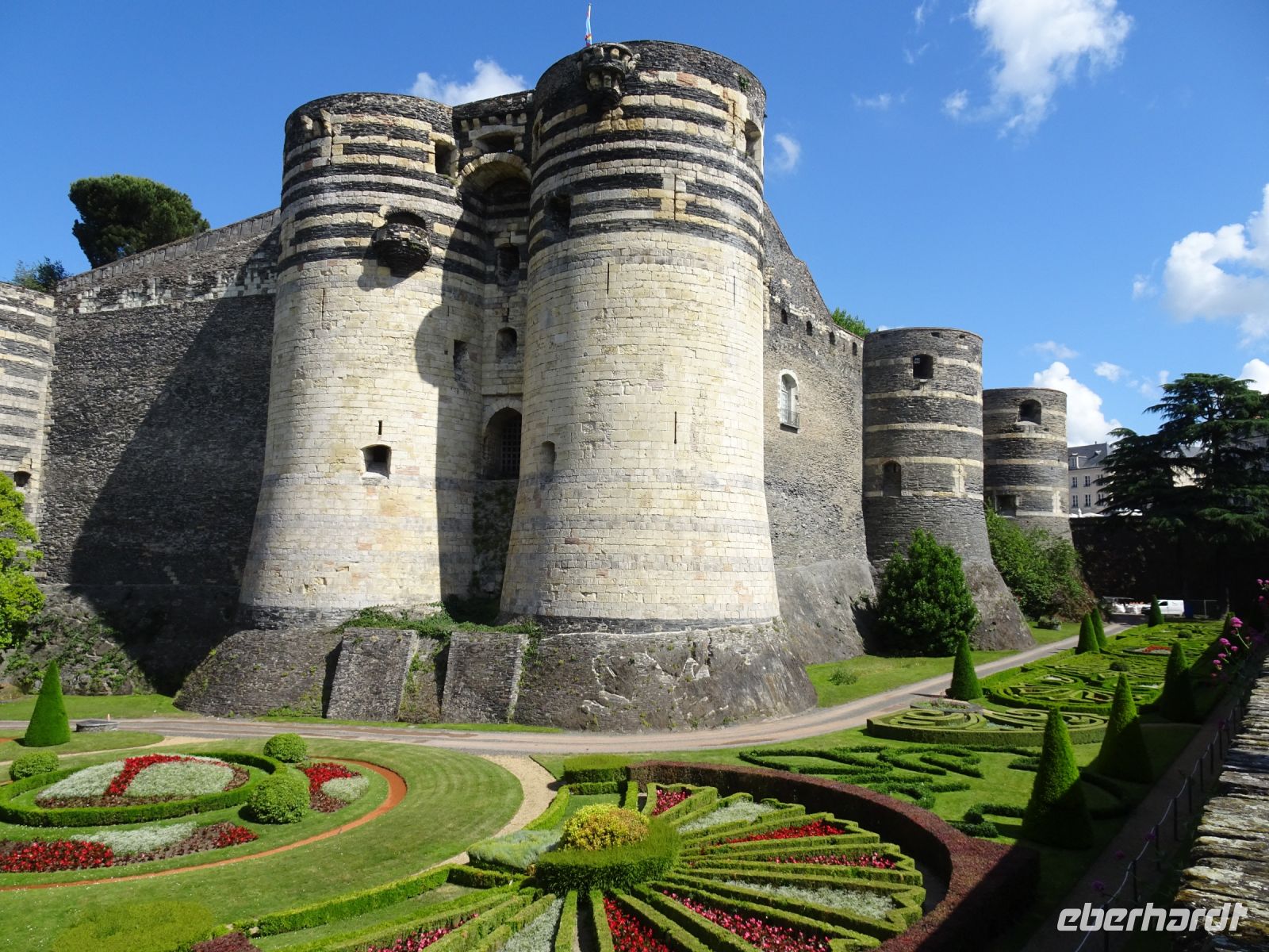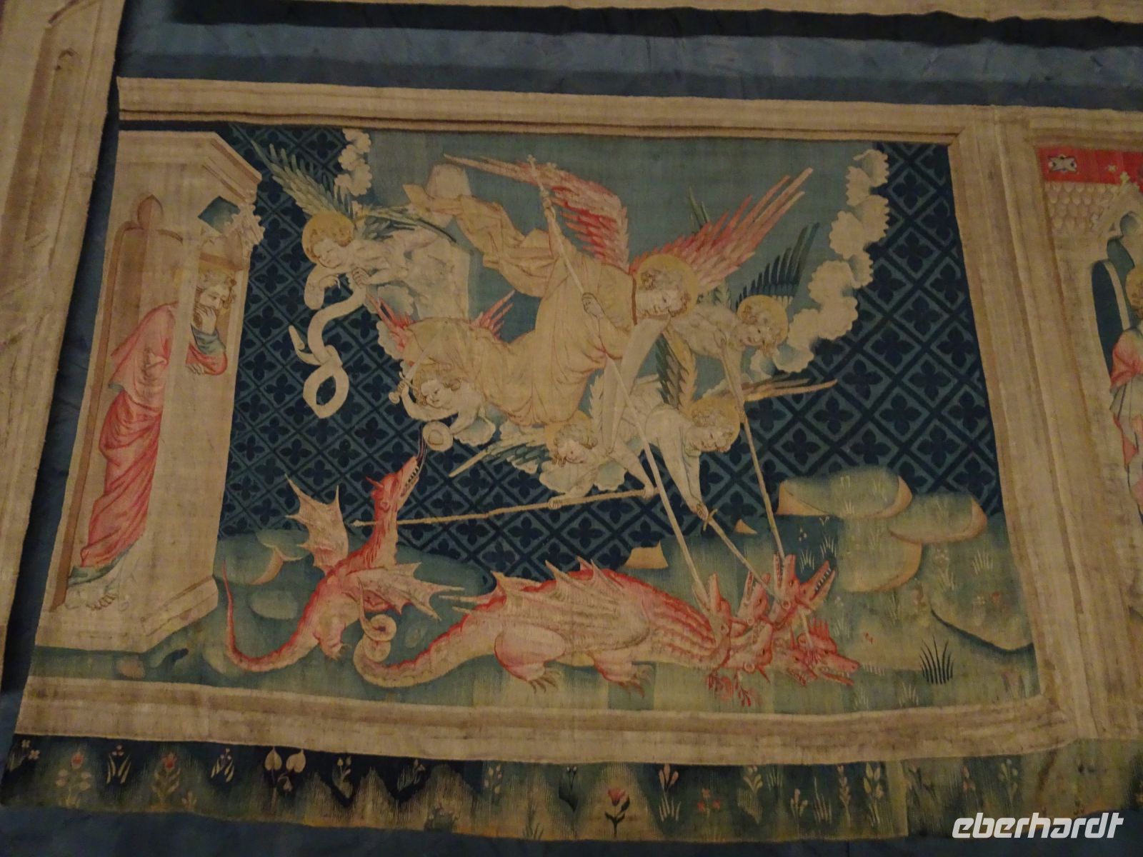 Zum Schluss kommts nochmal dicke. Im wahrsten Sinne des Wortes und in Form der dicken Mauern von Schloss Angers. Dicht an dicht reihen sich schwarze Türme entlang der Schlossmauer und jagen dem sich Nähernden Respekt ein. Doch der Blick von außen trügt. So soll sich doch an einigen Zeiten hier ein reges Hofleben abgespielt haben, auf dem man den leiblichen Genüssen nicht abgetan war. Nun, das ist lange her. Dennoch birgt das Schloss noch heute einen wertvollen Schatz – den Teppich der Apokalypse. Zwischen 1373 und 1380 ist dieses Kunstwerk entstanden. Ursprünglich waren es 6 Teile, jeweils 23,5 Meter lang und 6 Meter hoch. Jeder dieser Teile umfasste 14 Bilder der biblischen Geschichte. Insgesamt war der Teppich 140 Meter lang. Die übrig gebliebenen Reste, die wir heute bewundern können, zeugen aber immer noch von diesem gewaltigen Werk.