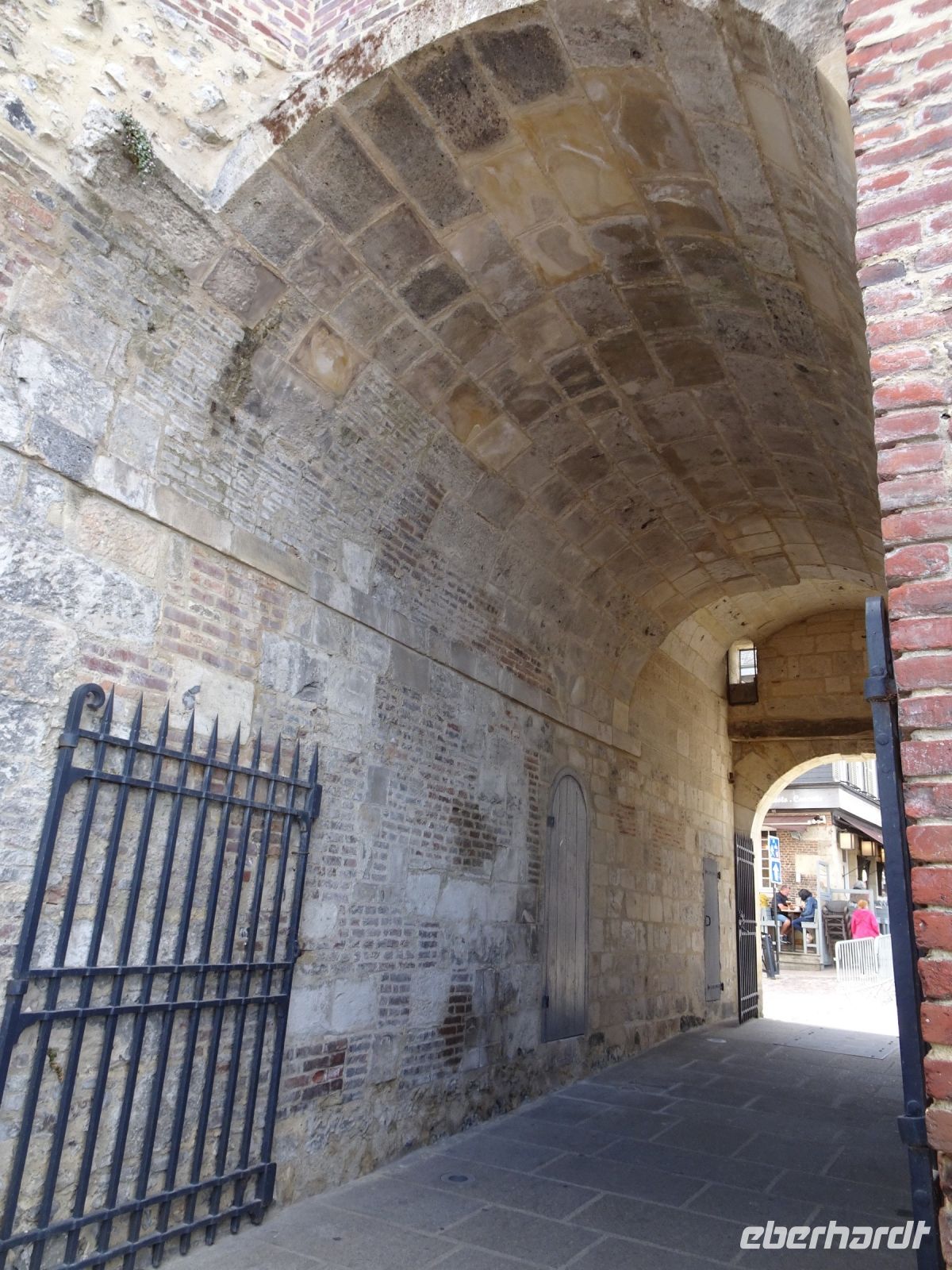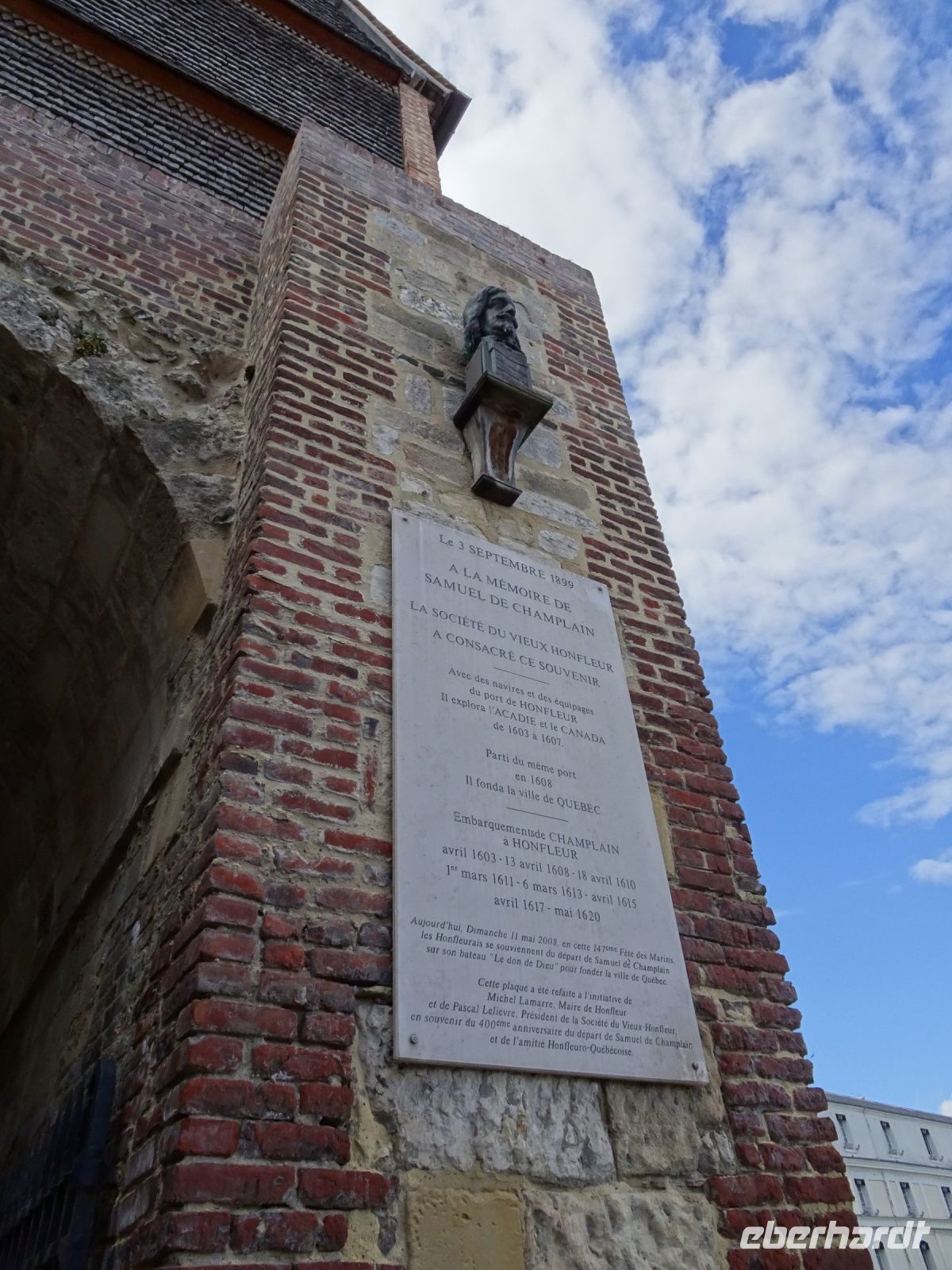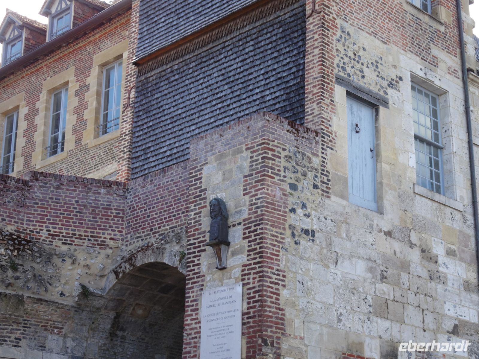 Im Bogen des Stadttors ist ein kleines Denkmal für Samuel de Champlain angebracht. Champlain war ein französischer Forschungsreisender und Kolonisator. Er entstammte einer Familie von Seefahrern und erforschte ab 1603 die Ostküste Nordamerikas. Am 13. April 1608 verließ er mit einer Flotte von drei Schiffen Honfleur. Dort, wo sich heute die kanadische Stadt Quebec befindet, bauten er und seine Männer eine Festung und gründeten damit die erste dauerhafte französische Kolonie in Nordamerika.