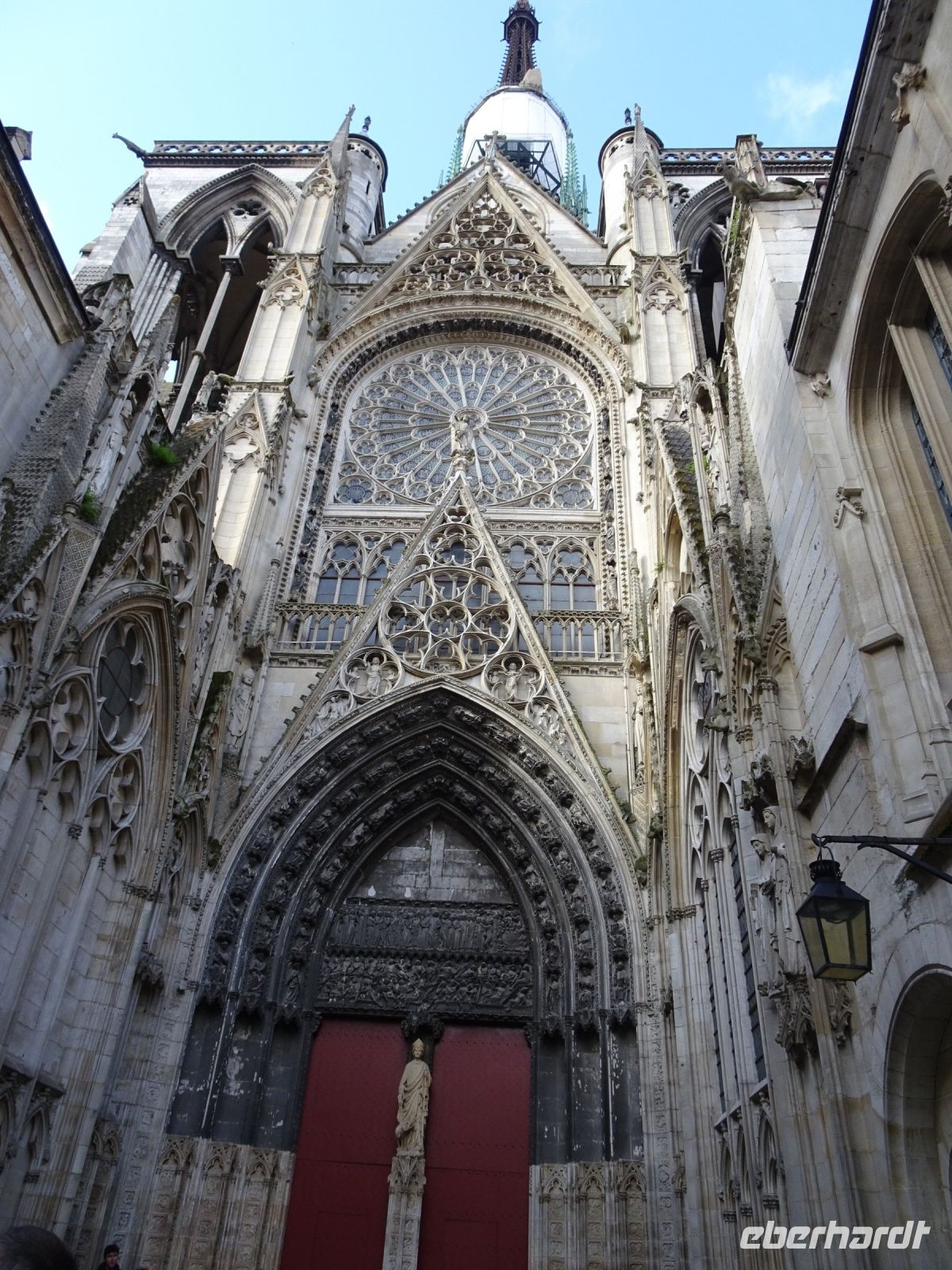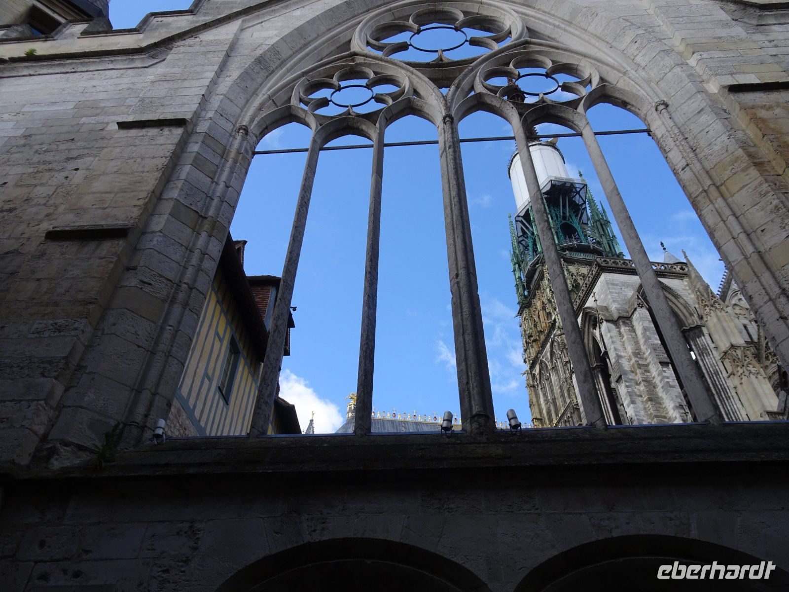Rouen war lange Zeit die zweitgrößte Stadt Frankreichs und im Mittelalter auch die Hauptstadt des Landes. Rouen war eine sehr reiche Stadt, deren Einwohner ihren Reichtum auch zeigen wollten, wovon wir uns noch heute überzeugen können. Den Mittelpunkt der mittelalterlichen Stadt bildete die Kathedrale mit ihren prunkvollen Verzierungen. Die Fassade ist reich geschmückt mit Figuren und ein Zeugnis der Baukunst von der Früh- bis zur Spätgotik. Im 12. Jahrhundert wurde mit dem Bau der Kathedrale begonnen, an einer Stelle, an der sich zuvor bereits eine romanische Kathedrale befand. Zuerst wurde der Nordturm gebaut, der Romanus Turm, der über dreihundert Jahre der einzige Turm der Kathedrale war. Ende des 15. Jahrhunderts war man dann der Meinung, dass die Kathedrale asymmetrisch wirke und es wurde ein zweiter Turm geplant. Bedauerlicherweise war der Steinvorrat, aus dem die Kathedrale gebaut wurde, erschöpft, so dass man auf ein anderes Steinvorkommen zurückgreifen musste. Dies ist deutlich an der unterschiedlichen Farbe des zweiten Turmes zu erkennen. Und dann ging auch noch das Geld aus. Aber dafür hatte die Kirche im Mittelalter ja einen altbekannten Trick – den Ablasshandel. Mit dem Erwerb von Ablassbriefen konnten sich Gläubige von Sünden befreien und die Kirche ihren Turm finanzieren. Eine Besonderheit in Rouen war das Verbot, Fett zu konsumieren, auch Butter. Dieses Verbot bestand zur Fastenzeit und an den sogenannten mageren Tagen, was fast ein Drittel des Jahres ausmachte. Die Kirche zeigte sich aber bereit, ein Auge zuzudrücken und großzügig zu sein, wenn die Bürger einen Fastenalmosen entrichteten. Zack – Problem gelöst. Der Turm konnte gebaut werden und bekam aufgrund seiner Finanzierung und seiner Farbe den Namen Butterturm.