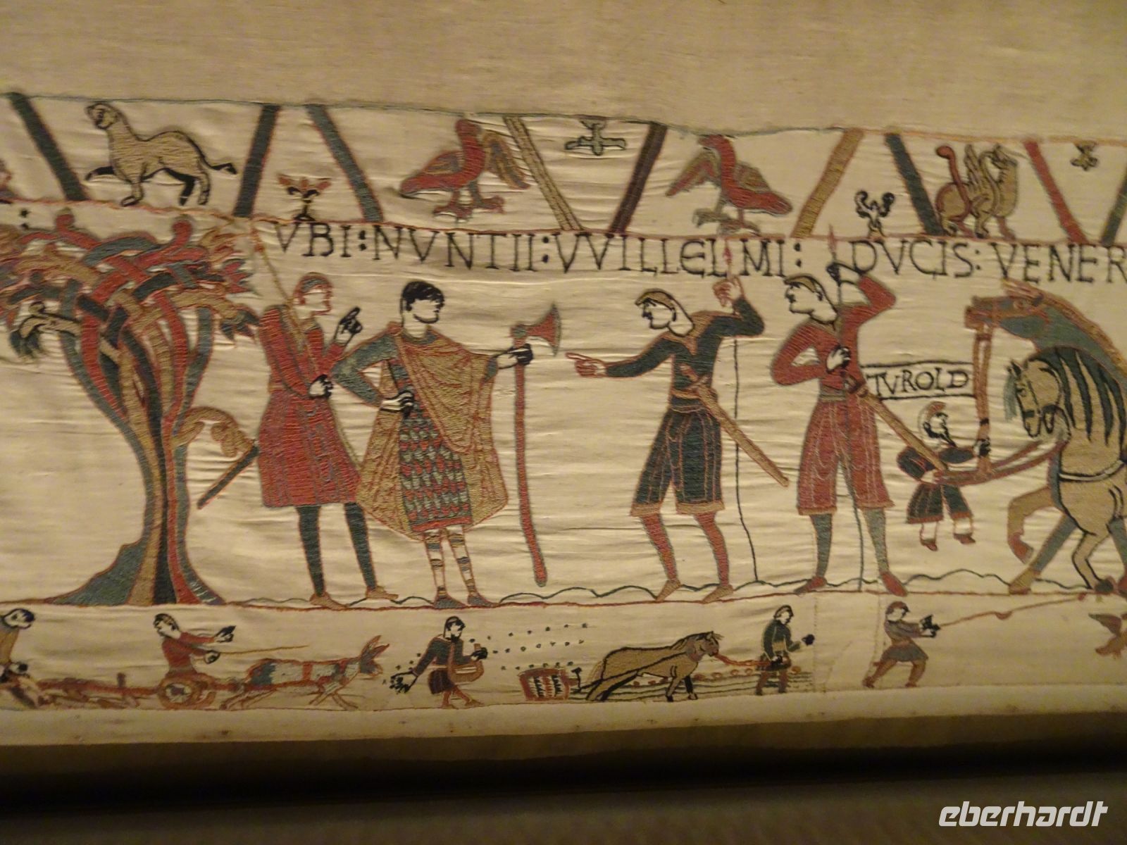 Unsere Mittagspause legen wir in Bayeux ein. Im Mittelpunkt der hübschen Altstadt befindet sich die Kathedrale Notre-Dame mit einem bemerkenswerten Hauptaltar und einem Chorgitter aus dem Barock. Die eigentliche Perle des Städtchens aber ist der Teppich von Bayeux, den Bischof Odo, der Bruder von Wilhelm der Eroberer, um 1080 anfertigen ließ. Hierbei handelt es sich um einen circa 70 Meter langen und 50 Zentimeter breiten gestickten Fries, der in 58 teils beschrifteten Szenen mit hunderten menschlichen und tierischen Figuren, zig Gebäuden und Schiffen die Eroberung Englands 1066 bis zur Krönung Wilhelm des Eroberers darstellt. Mittels Audioguides wird uns Szene für Szene erklärt und die ausdrucksstarken gestickten Figuren scheinen lebendig zu werden.