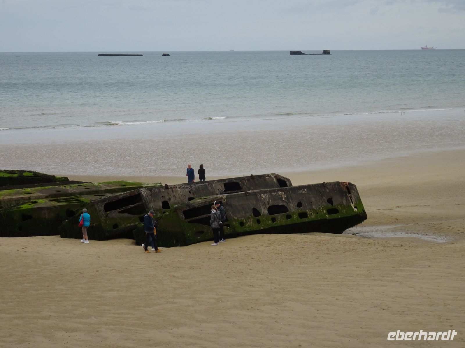 Wir durchqueren die Orte Lion-sur-Mer und Luc-sur-Mer. Überall wird mit Gedenktafeln, Fotos von gefallenen Soldaten oder alten Panzern an das Ereignis erinnert. In Arromanches halten wir uns länger auf. Hier gibt es einen langen Sandstrand und steil abfallende Klippen. Im Juni 1944 wurde diesem Abschnitt der Codename Gold Beach gegeben. Zu sehen sind heute noch Überreste der sogenannten Mulberrys, Molen aus Betonfertigteilen, die im Meer versenkt wurden und dem Transport von schwerem Gerät und Material dienten. Wer möchte, kann im Museum seinen Eindruck von dem damaligen Geschehen vertiefen.