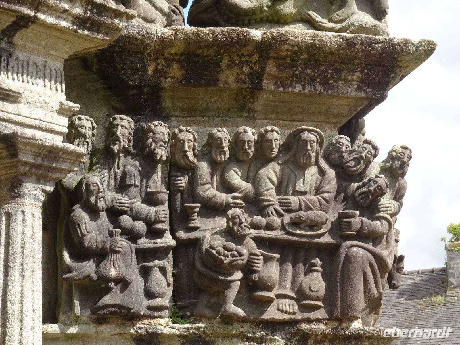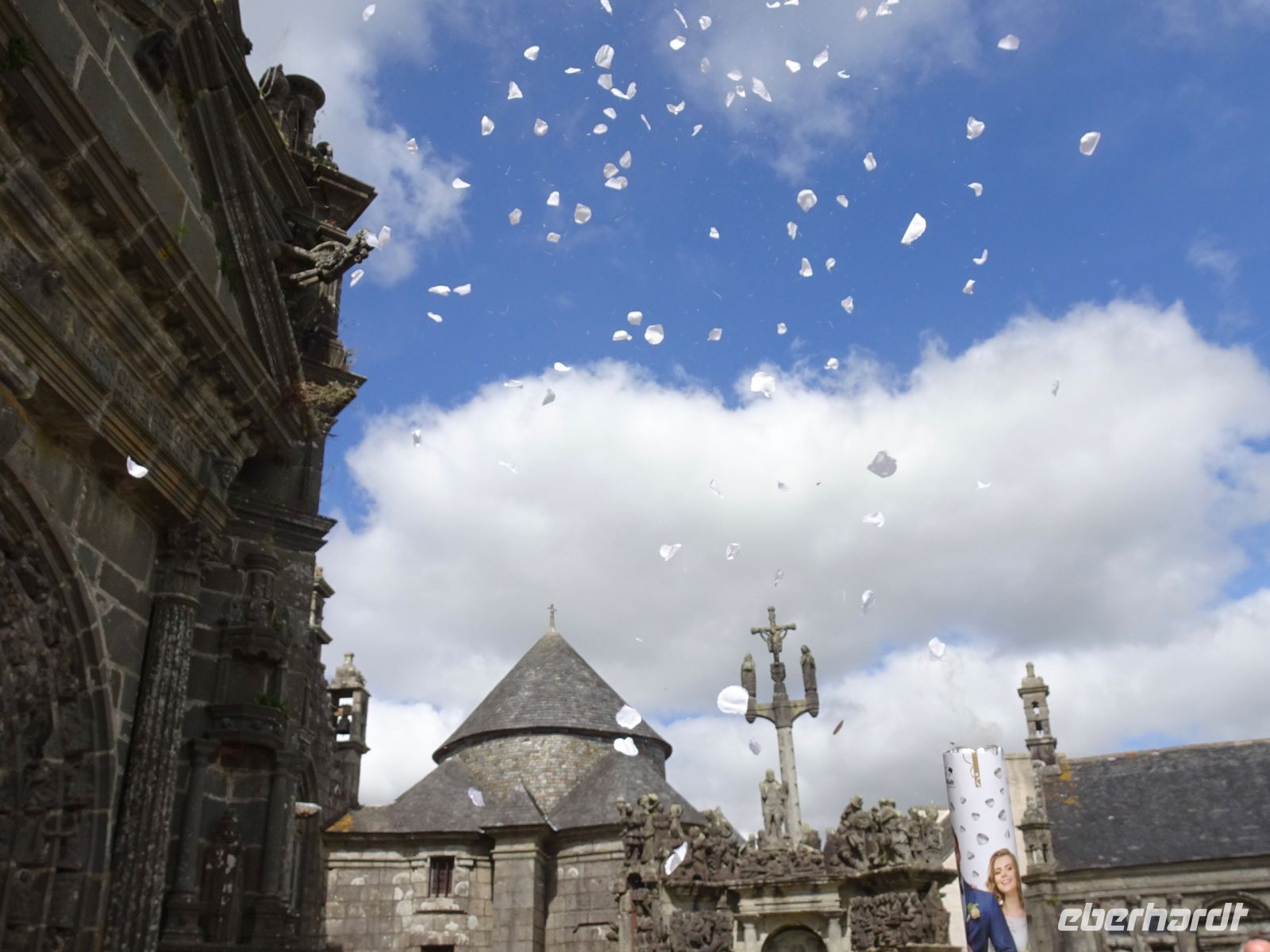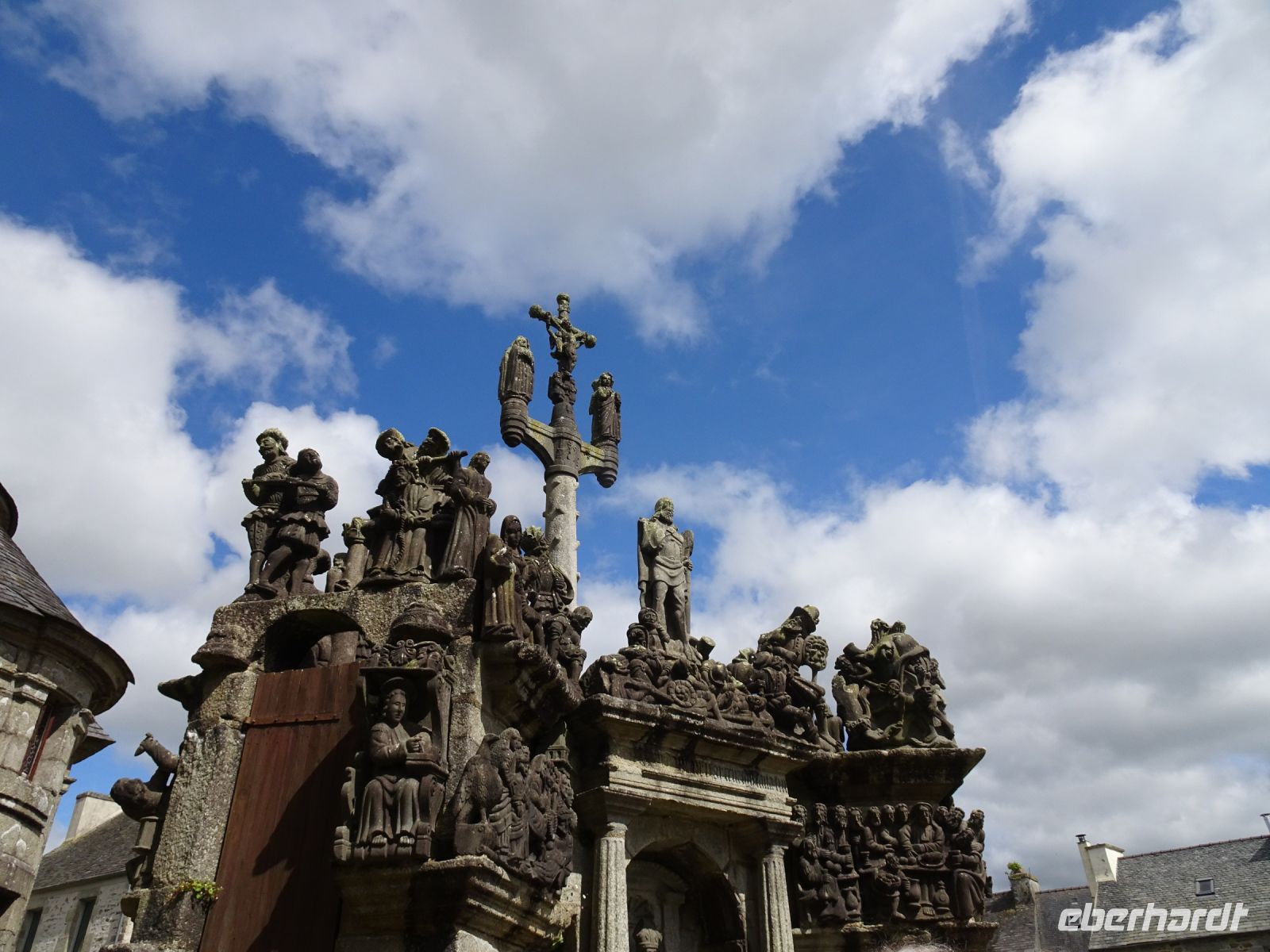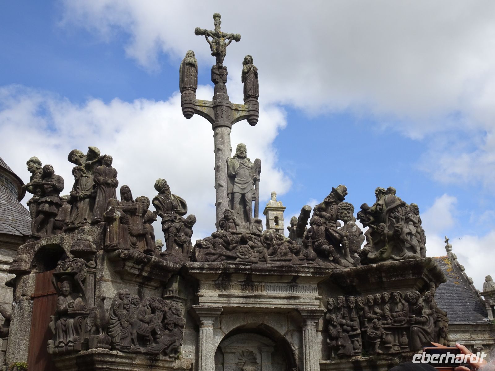 Wir fahren weiter und kommen nach Guimiliau. Wir besuchen den Umfriedeten Pfarrbezirk. Hierbei handelt es sich um ein typisch bretonisches architektonisches Ensemble und eine weltweit einmalige kirchliche Baukunst. Zu einem Pfarrbezirk gehören die Kirche, das Beinhaus und der Kalvarienberg, umgeben (umfriedet) von einer Mauer. Diese Mauer trennt symbolisch das Reich der Toten vom Reich der Lebenden. Ein Kalvarienberg ist eine Darstellung des Leidens Christi in vollplastischen Figuren. In der Bretagne gibt es noch heute sieben große Kalvarienberge, aber der in Guimiliau mit seinen 200 Figuren ist der schönste. Und was wir für ein Glück haben! In der Kirche wird heute geheiratet. Wir erleben wie Braut und Bräutigam die Kirche verlassen und von ihren Familienangehörigen und Hochzeitsgästen begrüßt werden. Dazu scheint die Sonne von einem strahlend blauen Himmel.