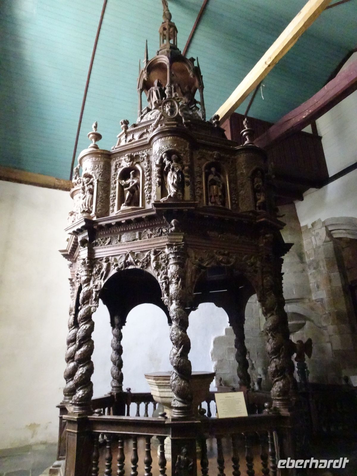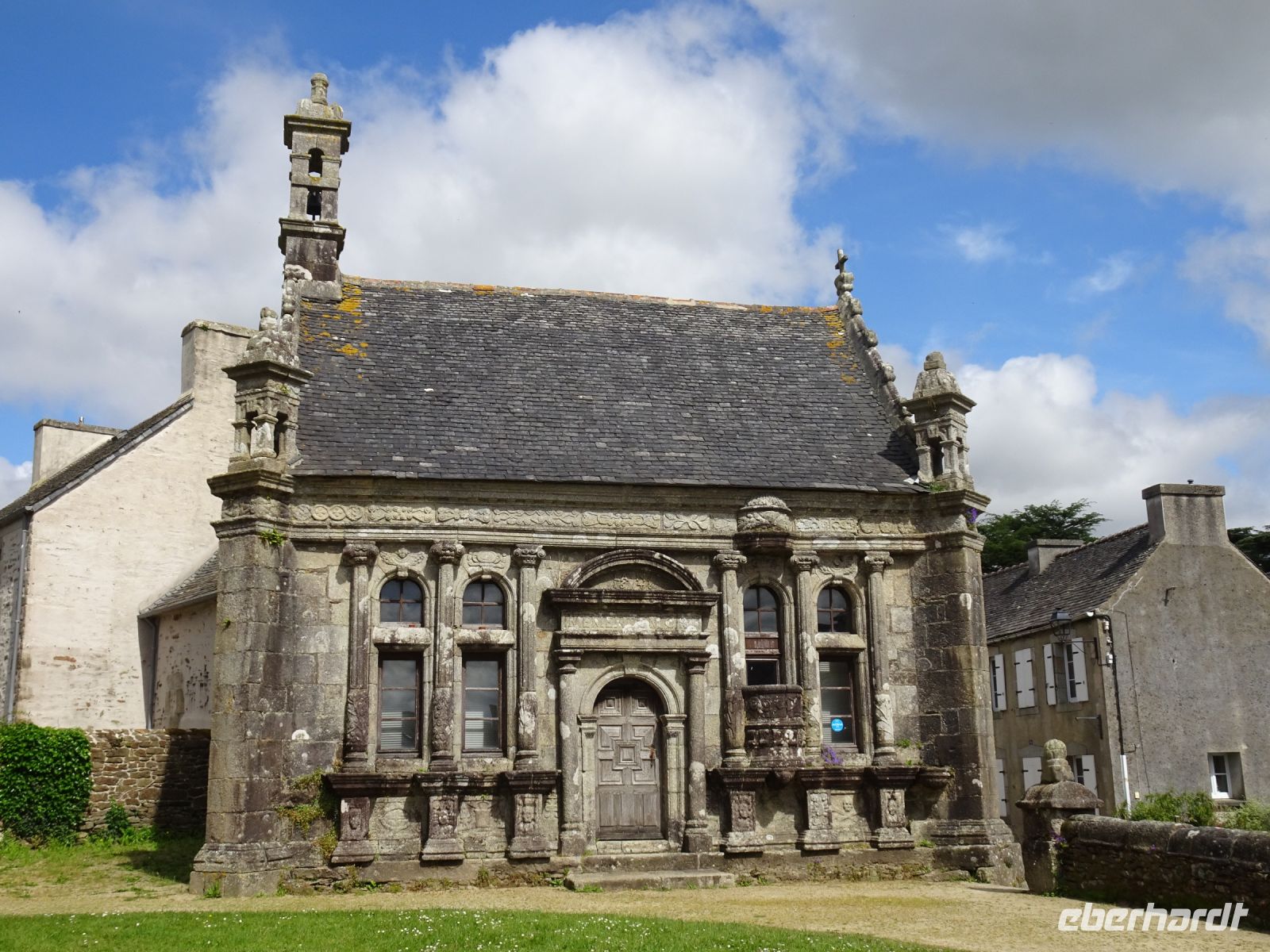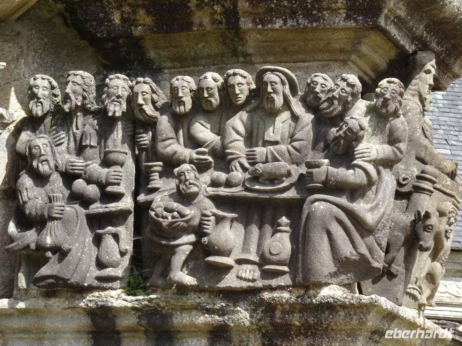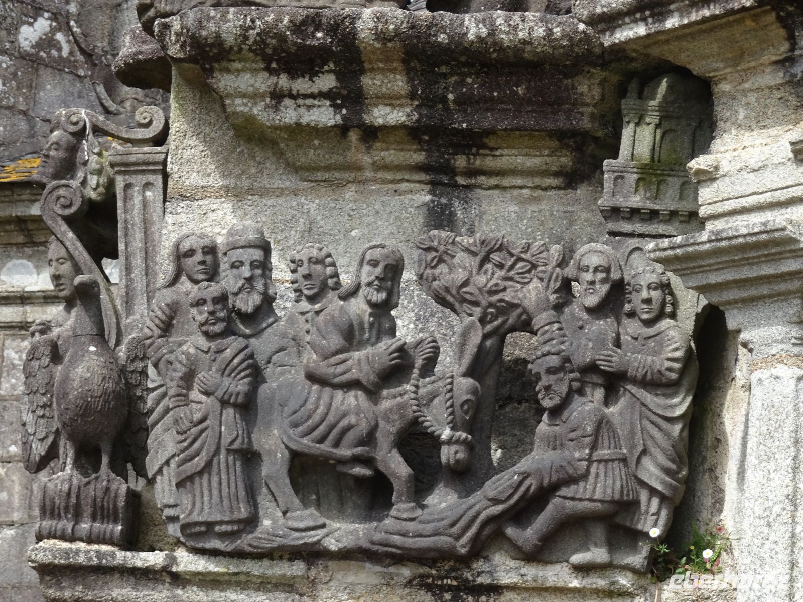 Wir fahren weiter und kommen nach Guimiliau. Wir besuchen den Umfriedeten Pfarrbezirk. Hierbei handelt es sich um ein typisch bretonisches architektonisches Ensemble und eine weltweit einmalige kirchliche Baukunst. Zu einem Pfarrbezirk gehören die Kirche, das Beinhaus und der Kalvarienberg, umgeben (umfriedet) von einer Mauer. Diese Mauer trennt symbolisch das Reich der Toten vom Reich der Lebenden. Ein Kalvarienberg ist eine Darstellung des Leidens Christi in vollplastischen Figuren. In der Bretagne gibt es noch heute sieben große Kalvarienberge, aber der in Guimiliau mit seinen 200 Figuren ist der schönste. Und was wir für ein Glück haben! In der Kirche wird heute geheiratet. Wir erleben wie Braut und Bräutigam die Kirche verlassen und von ihren Familienangehörigen und Hochzeitsgästen begrüßt werden. Dazu scheint die Sonne von einem strahlend blauen Himmel.