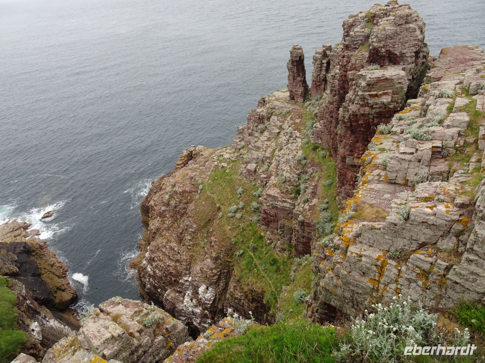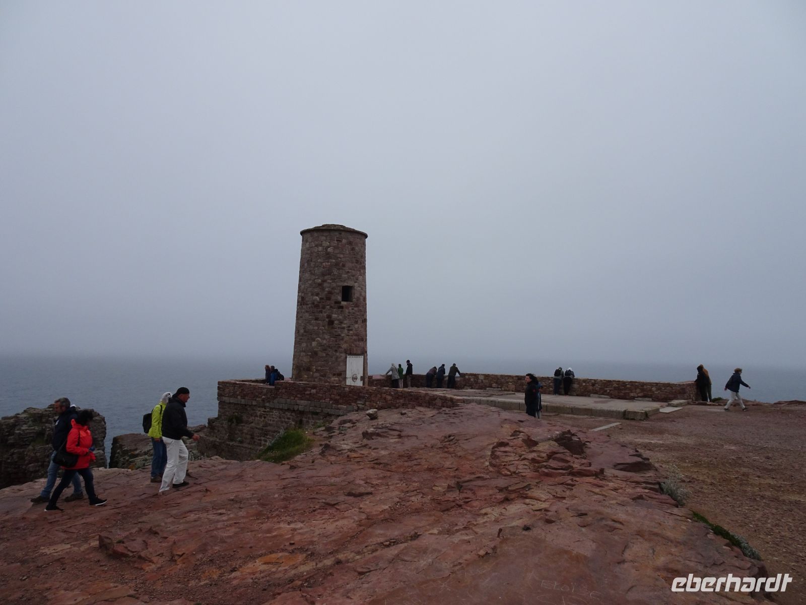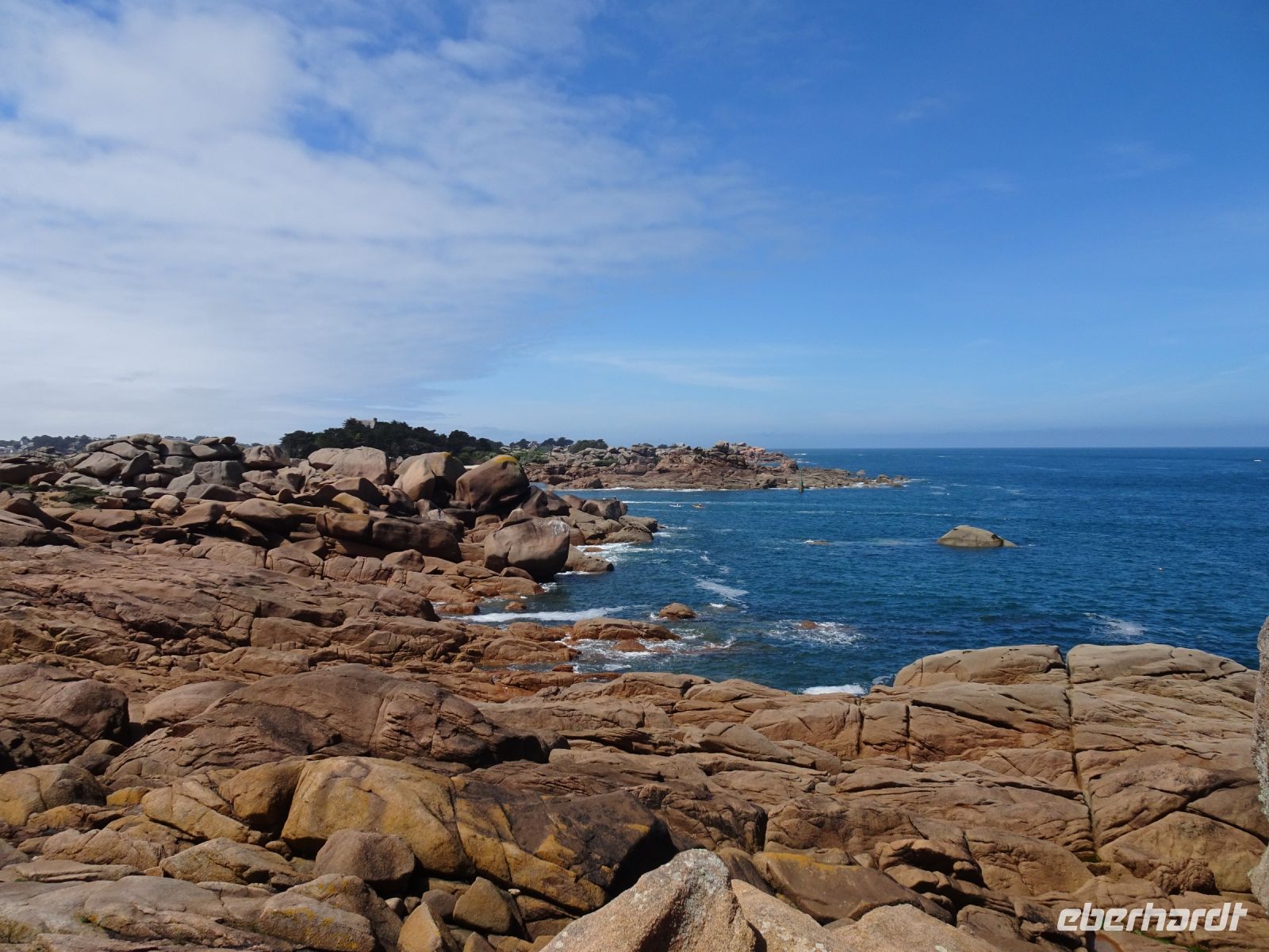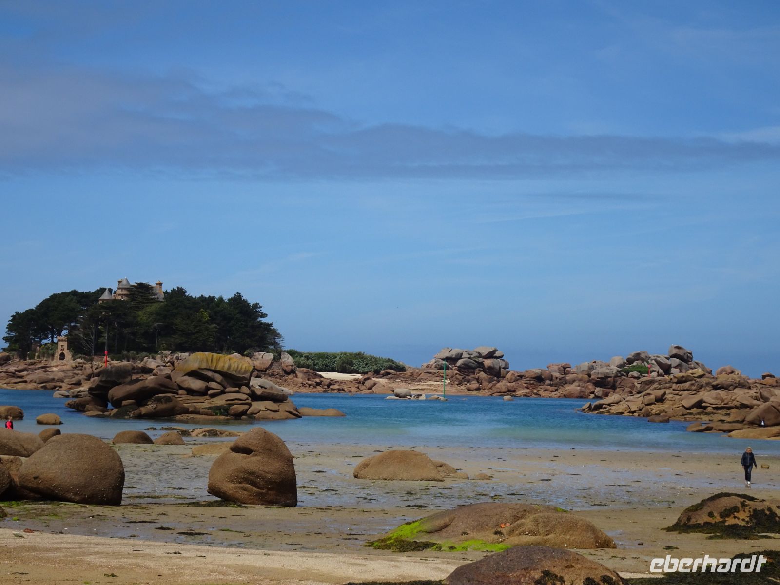 Gegen 10 Uhr erreichen wir das Cap Frehel. Entlang des tosenden Meeres und steil abfallender Klippen spazieren wir Richtung Leuchtturm. Rosarot und dunkelschwarz sind die vorherrschenden Farben, Und natürlich das tiefe Blau des Ozeans und weiß schäumende Brandung. Von den vielen Vögeln, die hier nisten sollen, ist leider nichts zu sehen, aber einige von uns entdecken in der Ferne Delphine oder kleine Wale. Als wir uns auf den Rückweg machen, zieht Nebel auf. Ruck zuck und nichts ist mehr zu sehen. Mittags erreichen wir den kleinen Hafenort Ploumanach. Bekannt ist dieser durch seine außergewöhnlichen Steinformationen aus rotem Granit. Die Kapelle des Heiligen Guirec können wir, dank Ebbe, zu Fuß erreichen. Guirec soll im 6. Jahrhundert mit einem Trog aus Granit von Wales aus hier herüber geschwommen sein. Die Figur, die sich heute in der kleinen Kapelle befindet, ist aus Stein. Die Vorgängerin aus Holz musste ersetzt werden, da eine Legende besagt, das Mädchen, dessen Nadel in der Figur stecken bleibt, heiratet noch im selben Jahr. Offensichtlich gab und gibt es hier viele heiratswillige Mädchen, denn auch die neue Figur sieht schon wieder ganz schön mitgenommen aus. Die Umgebung ist wirklich schön und bei dem Licht könnte man sich fast auf den Seychellen wähnen.