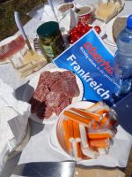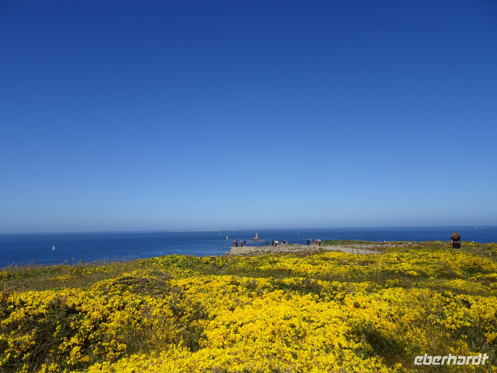 Und wieder scheint die Sonne und der Himmel ist strahlend blau. Genau richtig für uns, denn wir fahren ans westliche Ende der Welt zum Pointe du Raz. Nun ja, vor der Entdeckung Amerikas dachte man wohl, hier sei die Welt zu Ende. Wie auch immer. Genau wie im Reiseführer beschrieben, leuchten Ginster, Heide und Gräser in der Sonne. Vom Besucherzentrum am Parkplatz laufen wir bis hin zum Leuchtturm und der Statue Notre Dame des Naufrages (von 1904). Überall sitzen Besucher, so wie wir, auf den Steinen und genießen die traumhafte Landschaft. Als wir zum Parkplatz zurückkommen, haben Michael und Daniel ein Picknick vorbereitet. Der Tisch ist gedeckt mit lauter bretonischen Köstlichkeiten und der Wein wird in Strömen fließen. Fast wie im Schlaraffenland. Auf unserem Weg, den wir frohgemut fortsetzen, besuchen wir Confort-Meilars mit einem kleinen Kalvarienberg. Etwas Einzigartiges jedoch verbirgt sich im Innern der Kirche Notre Dame: ein radförmiges Glockenspiel aus dem 16. Jahrhundert, das einem Wünsche erfüllt, sofern man es schafft, daran zu drehen. Keine Frage, dass wir das ausprobieren.
