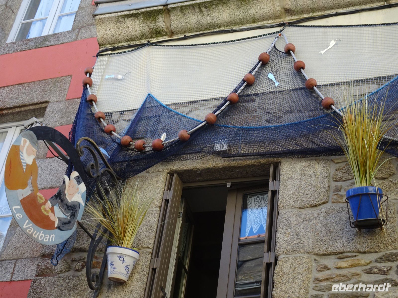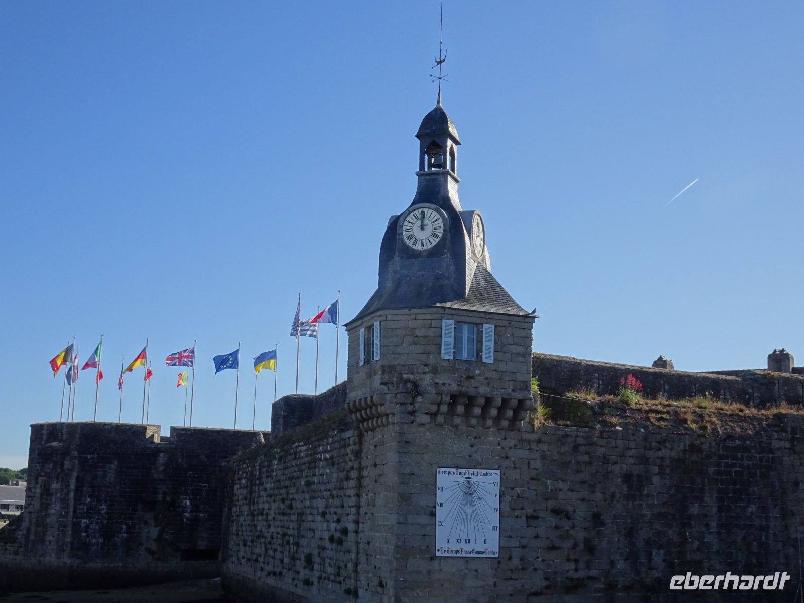 Über eine mittelalterliche Brücke gelangen wir in die Altstadt von Concarneau. Die Stadtmauer ist ebenfalls noch gut erhalten, betreten darf man den vorderen Teil allerdings erst ab 10 Uhr und so spät ist es noch nicht. Nun ja, am Ende der kleinen Einkaufsstraße, die wir entlang bummeln, gibt es dann doch einen Zugang auf die Stadtmauer. Bekannt ist dieses Städtchen auch durch Kommissar Dupin, der in seinen Krimis hier ermittelt. Heute sind noch alle Läden geschlossen und so beenden wir recht schnell unseren Besuch. Übrigens, nur hier habe ich in einem Schaufenster die ungewöhnliche Kopfbedeckung der Bigouden entdeckt. Allerdings war dieser Laden auch zu.