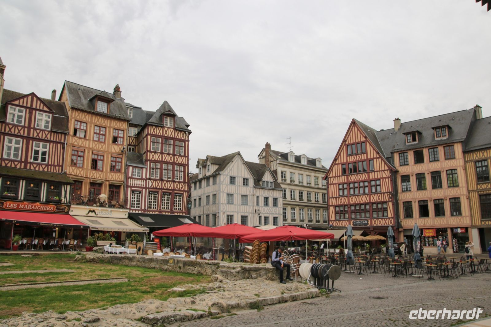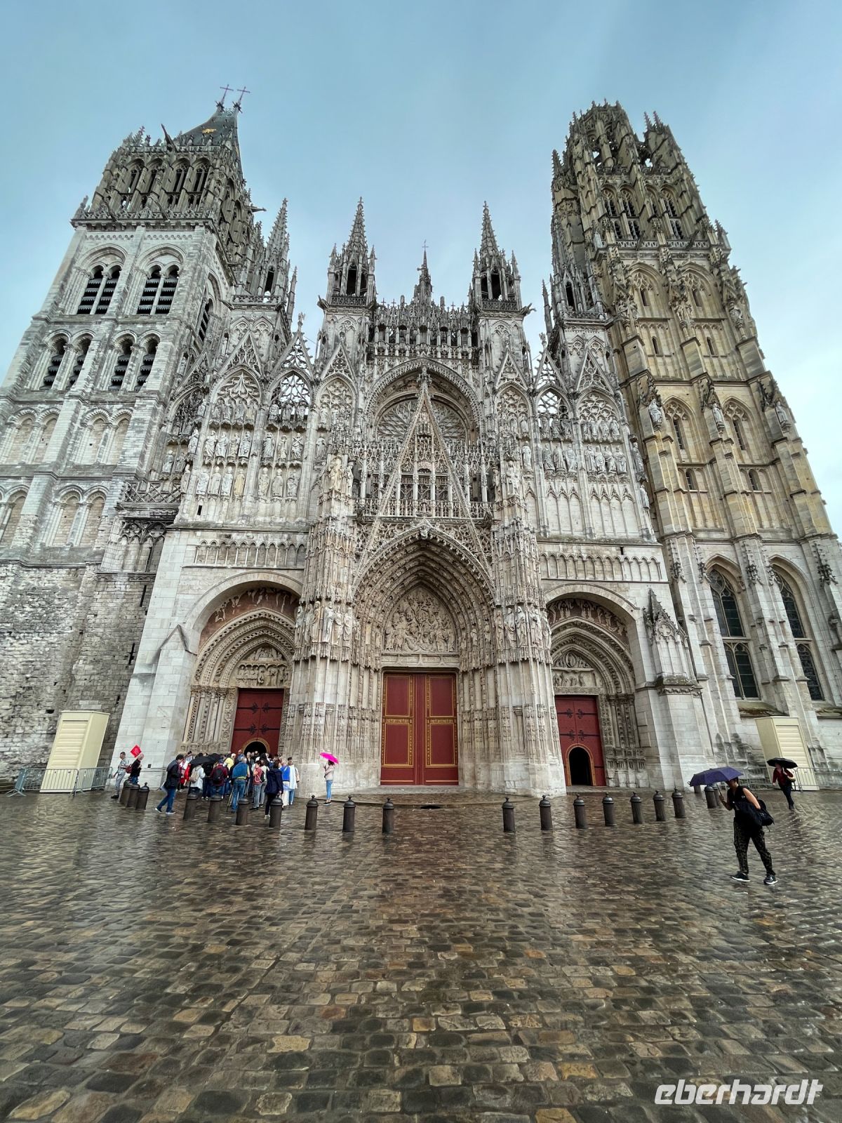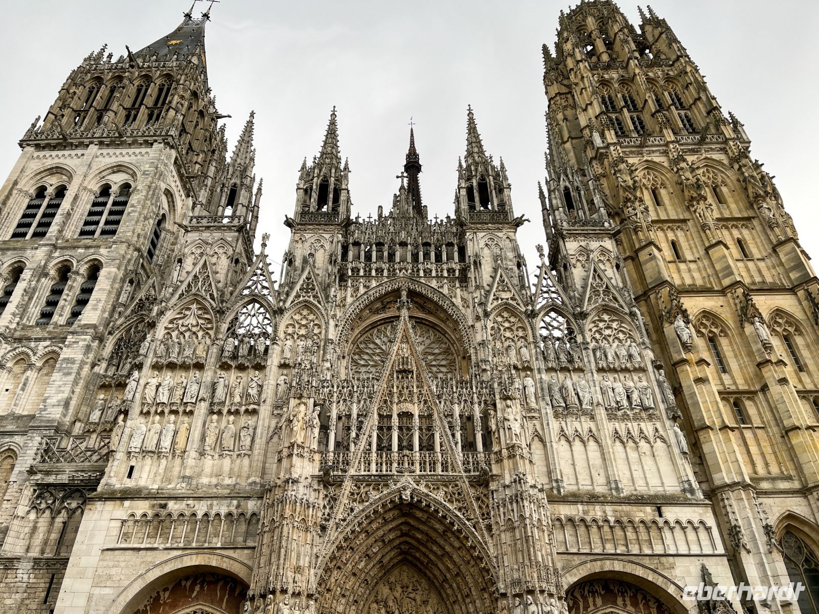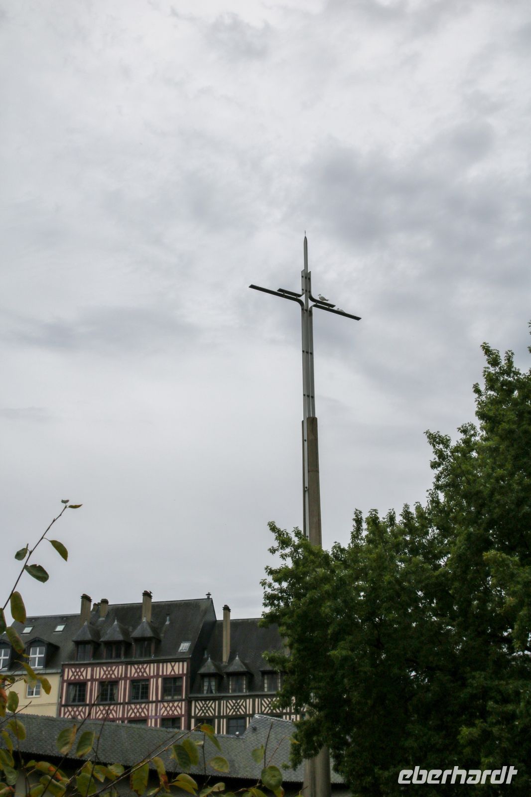 Eine Stadtführung durch die wunderschöne Altstadt von Rouen markierte den Beginn des Tages. Zusammen mit unserer Stadtführerin trotzten wir dem anfänglich regnerischen Wetter und machten einen Rundgang durch die Stadt. Zuerst sahen wir uns die Kathedrale Notre-Dame aus dem 12. Jahrhundert an, die wohl zu den schönsten gotischen Kathedralen im ganzen Land zählt. Dabei erfuhren wir viel wissenswertes über die Fassade, die auch Claude Monet bewunderte und in seinen Bildern verewigte. Von da aus zogen wir durch die historischen Straßen und entlang bunter Fachwerkhäuser. Als nächstes wartete die Astronomische Uhr auf uns. Die aufwändig gestaltete Uhr aus dem 14. Jahrhundert zeigt nicht nur die Zeit, sondern auch die Wochentage und sogar die Mondphasen. Nun widmeten wir uns der legendären Geschichte von Jean d´Arc, auch Jungfrau von Orleans genannt. Sie verhalf im Hundertjährigen Krieg den Franzosen zu einem Sieg und wurde dafür, nach ihrer Gefangennahme, von den Engländern verurteilt und im Zentrum von Rouen auf dem Scheiterhaufen verbrannt. Heute befindet sich an dieser Stelle ein riesiges Kreuz und eine im Jahr 1979 errichtete Kathedrale. Das moderne Designe der Kirche wird mit großen Buntglasfenstern abgerundet, die vor dem Ausbruch des Zweiten Weltkriegs aus anderen Kirchen entfernt wurden, um diese vor Beschädigungen zu schützen.