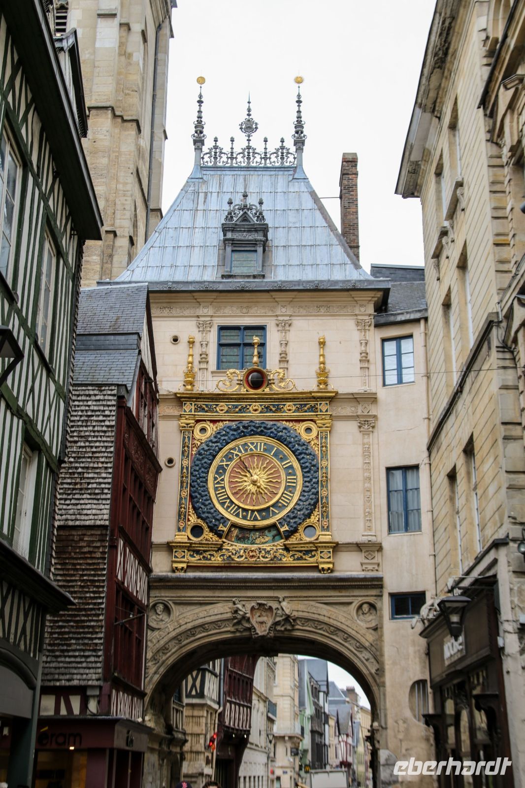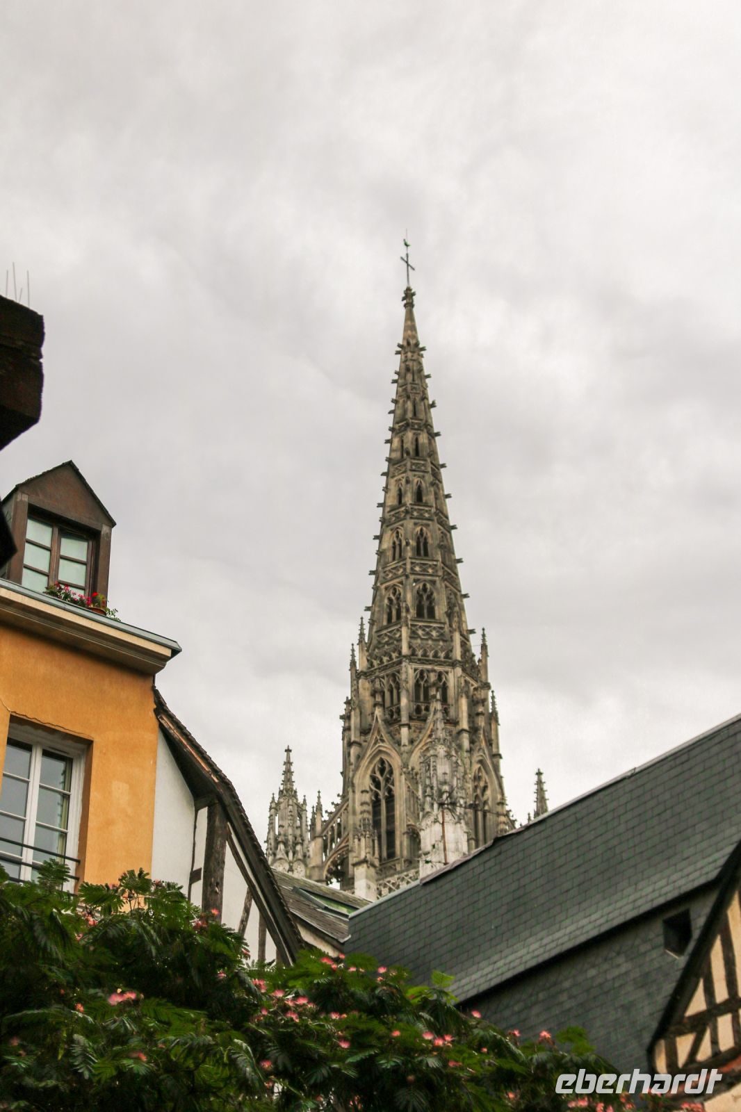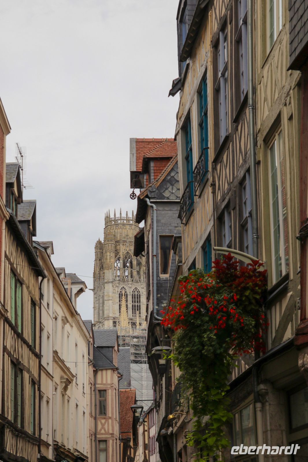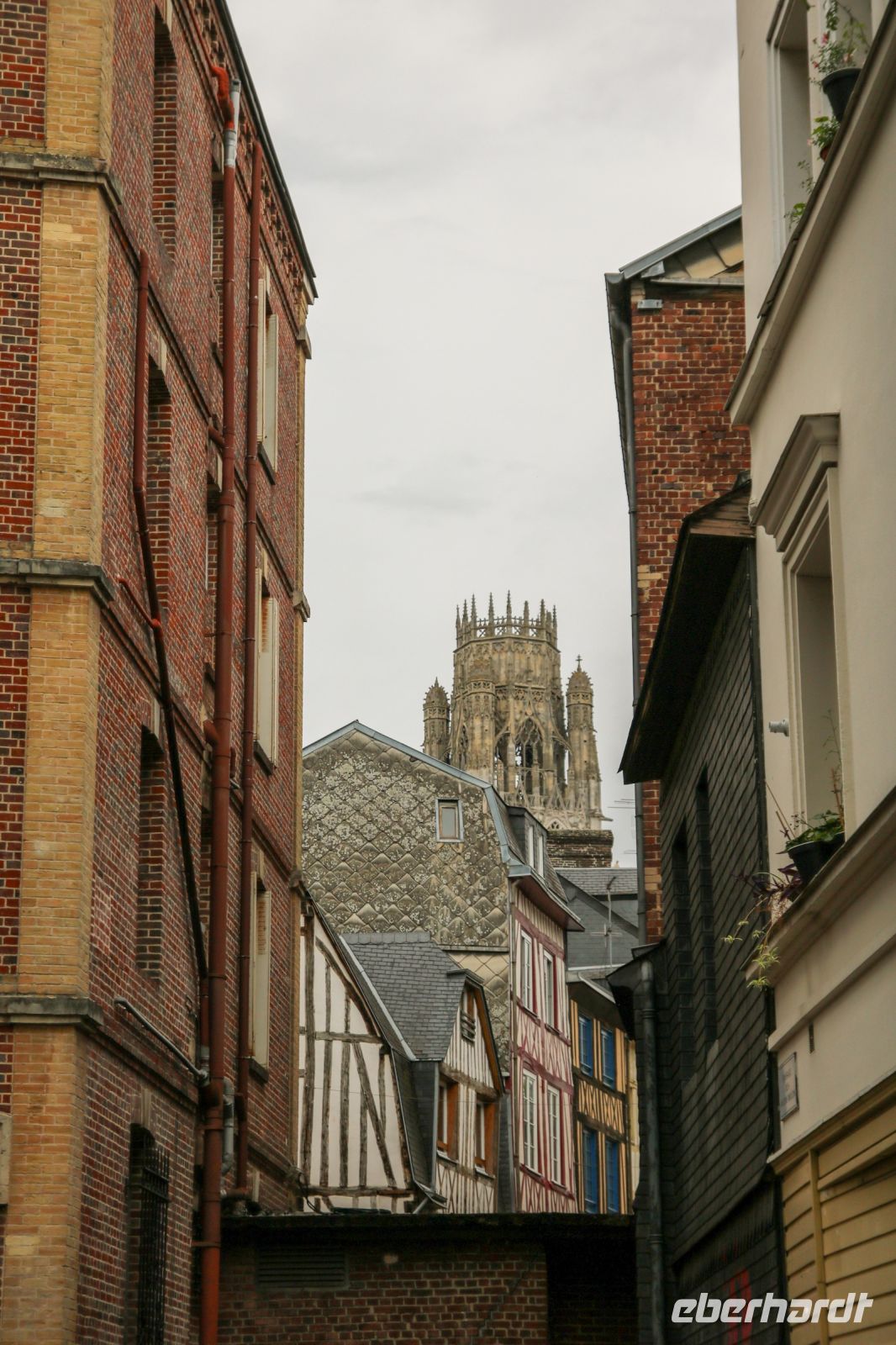 Eine Stadtführung durch die wunderschöne Altstadt von Rouen markierte den Beginn des Tages. Zusammen mit unserer Stadtführerin trotzten wir dem anfänglich regnerischen Wetter und machten einen Rundgang durch die Stadt. Zuerst sahen wir uns die Kathedrale Notre-Dame aus dem 12. Jahrhundert an, die wohl zu den schönsten gotischen Kathedralen im ganzen Land zählt. Dabei erfuhren wir viel wissenswertes über die Fassade, die auch Claude Monet bewunderte und in seinen Bildern verewigte. Von da aus zogen wir durch die historischen Straßen und entlang bunter Fachwerkhäuser. Als nächstes wartete die Astronomische Uhr auf uns. Die aufwändig gestaltete Uhr aus dem 14. Jahrhundert zeigt nicht nur die Zeit, sondern auch die Wochentage und sogar die Mondphasen. Nun widmeten wir uns der legendären Geschichte von Jean d´Arc, auch Jungfrau von Orleans genannt. Sie verhalf im Hundertjährigen Krieg den Franzosen zu einem Sieg und wurde dafür, nach ihrer Gefangennahme, von den Engländern verurteilt und im Zentrum von Rouen auf dem Scheiterhaufen verbrannt. Heute befindet sich an dieser Stelle ein riesiges Kreuz und eine im Jahr 1979 errichtete Kathedrale. Das moderne Designe der Kirche wird mit großen Buntglasfenstern abgerundet, die vor dem Ausbruch des Zweiten Weltkriegs aus anderen Kirchen entfernt wurden, um diese vor Beschädigungen zu schützen.
