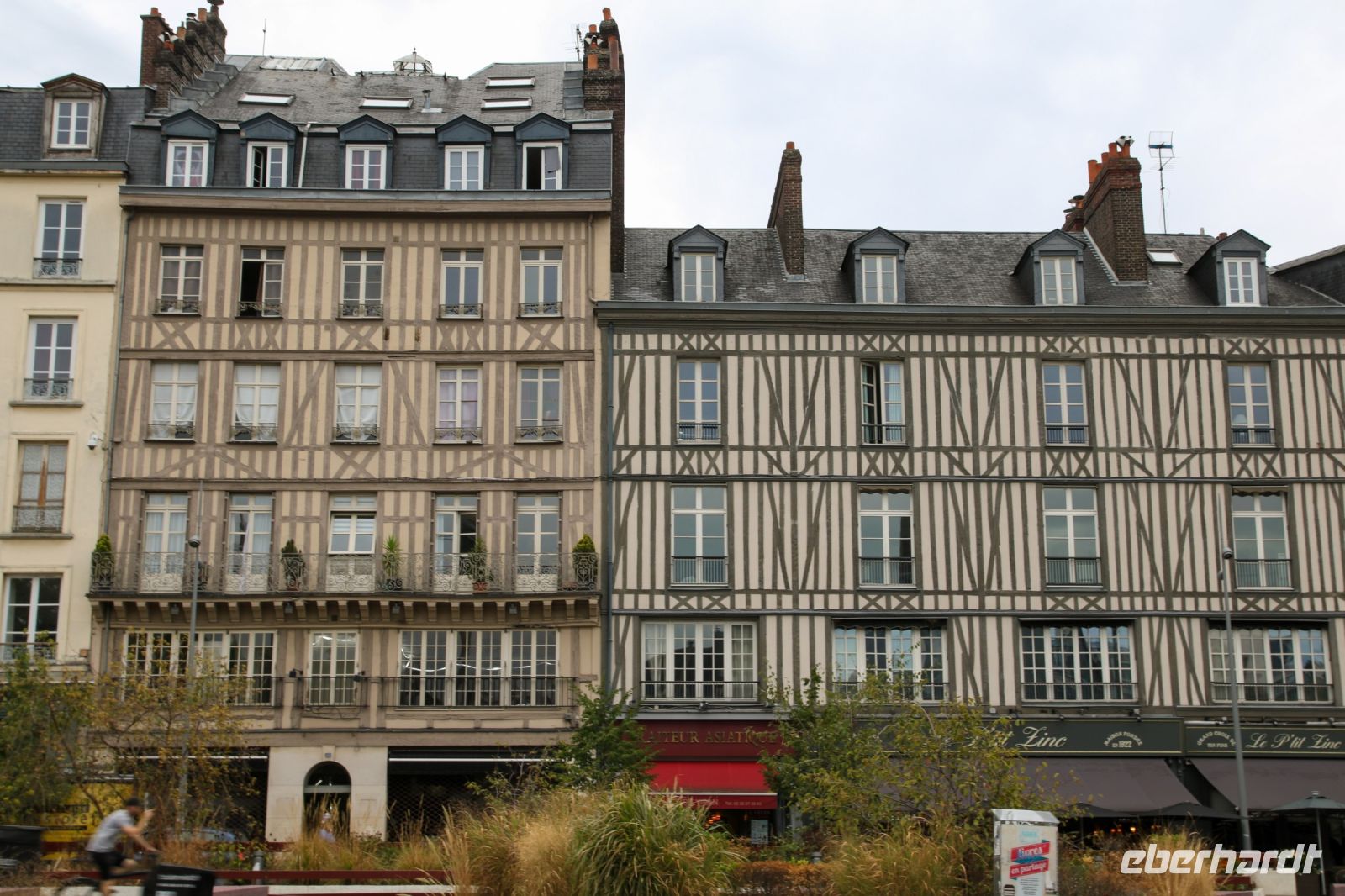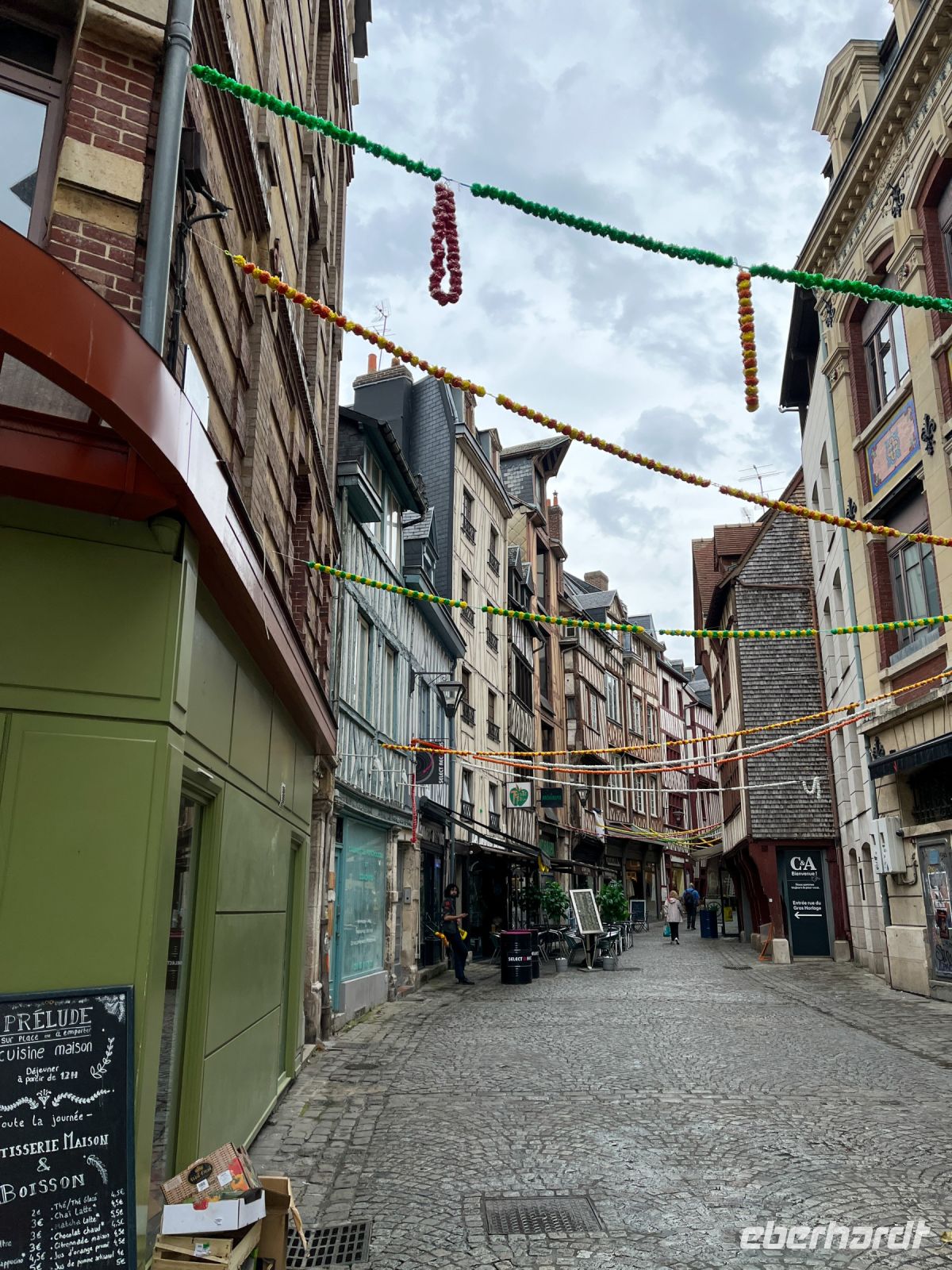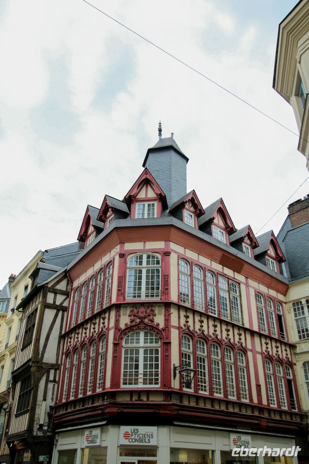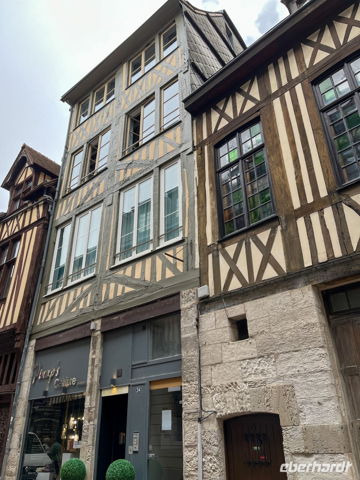 Eine Stadtführung durch die wunderschöne Altstadt von Rouen markierte den Beginn des Tages. Zusammen mit unserer Stadtführerin trotzten wir dem anfänglich regnerischen Wetter und machten einen Rundgang durch die Stadt. Zuerst sahen wir uns die Kathedrale Notre-Dame aus dem 12. Jahrhundert an, die wohl zu den schönsten gotischen Kathedralen im ganzen Land zählt. Dabei erfuhren wir viel wissenswertes über die Fassade, die auch Claude Monet bewunderte und in seinen Bildern verewigte. Von da aus zogen wir durch die historischen Straßen und entlang bunter Fachwerkhäuser. Als nächstes wartete die Astronomische Uhr auf uns. Die aufwändig gestaltete Uhr aus dem 14. Jahrhundert zeigt nicht nur die Zeit, sondern auch die Wochentage und sogar die Mondphasen. Nun widmeten wir uns der legendären Geschichte von Jean d´Arc, auch Jungfrau von Orleans genannt. Sie verhalf im Hundertjährigen Krieg den Franzosen zu einem Sieg und wurde dafür, nach ihrer Gefangennahme, von den Engländern verurteilt und im Zentrum von Rouen auf dem Scheiterhaufen verbrannt. Heute befindet sich an dieser Stelle ein riesiges Kreuz und eine im Jahr 1979 errichtete Kathedrale. Das moderne Designe der Kirche wird mit großen Buntglasfenstern abgerundet, die vor dem Ausbruch des Zweiten Weltkriegs aus anderen Kirchen entfernt wurden, um diese vor Beschädigungen zu schützen.