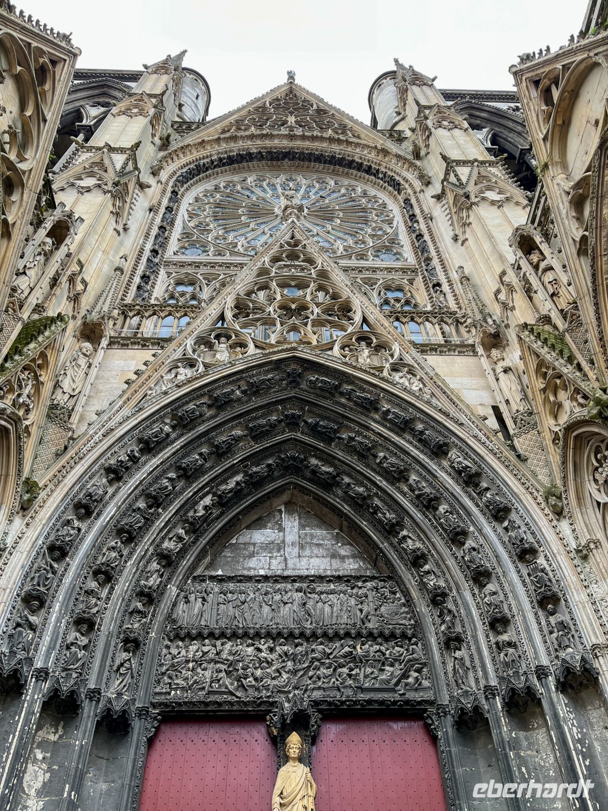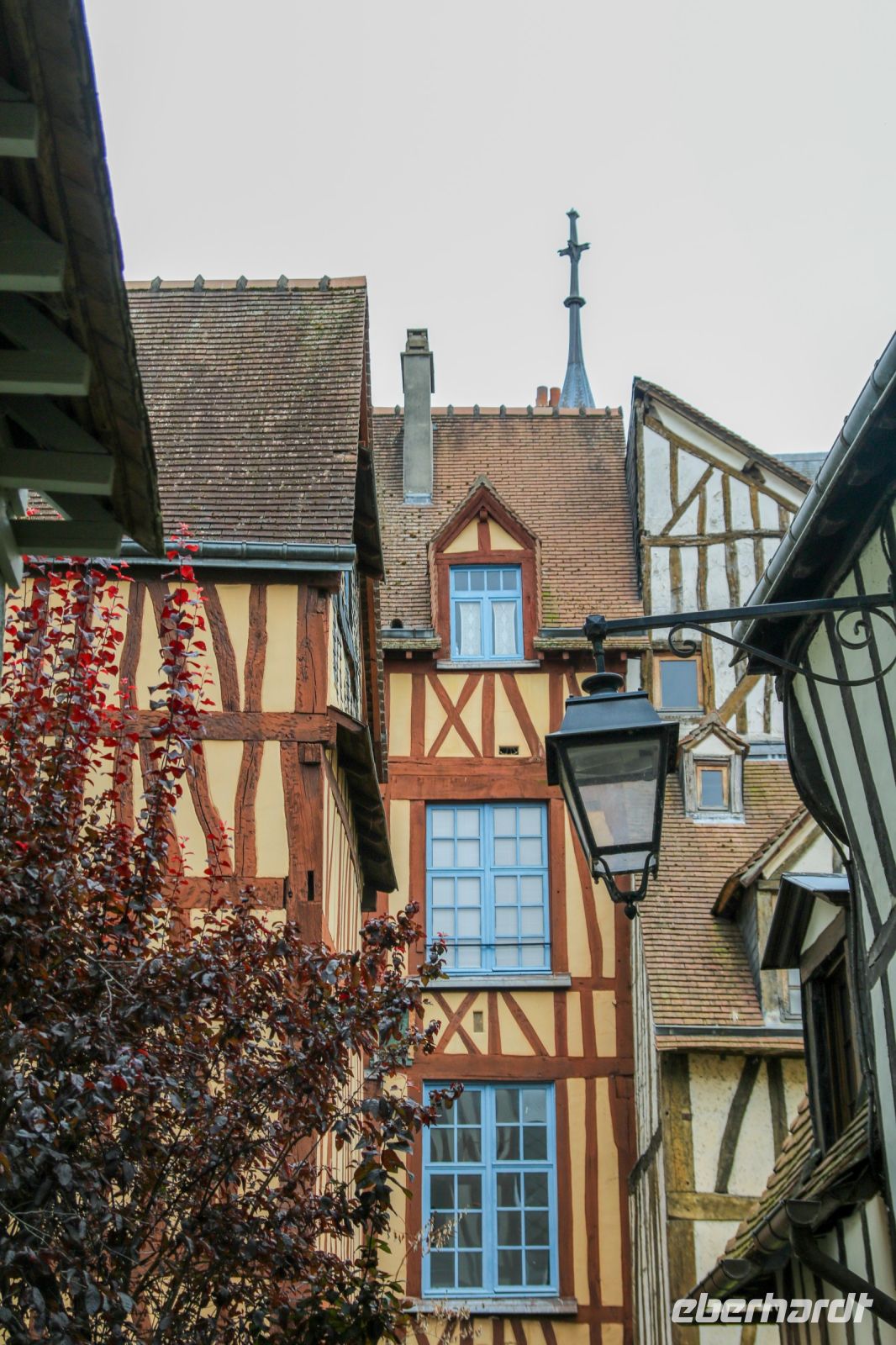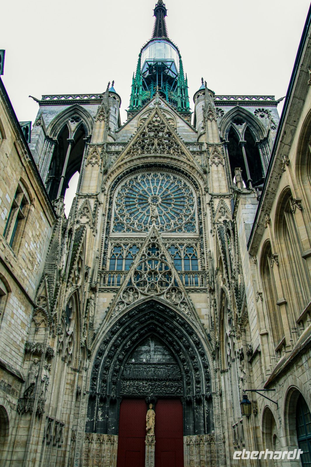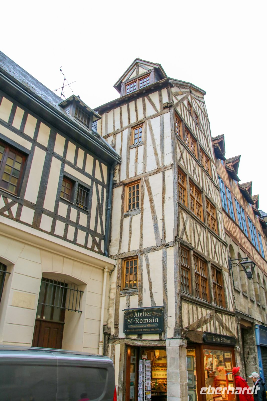 Eine Stadtführung durch die wunderschöne Altstadt von Rouen markierte den Beginn des Tages. Zusammen mit unserer Stadtführerin trotzten wir dem anfänglich regnerischen Wetter und machten einen Rundgang durch die Stadt. Zuerst sahen wir uns die Kathedrale Notre-Dame aus dem 12. Jahrhundert an, die wohl zu den schönsten gotischen Kathedralen im ganzen Land zählt. Dabei erfuhren wir viel wissenswertes über die Fassade, die auch Claude Monet bewunderte und in seinen Bildern verewigte. Von da aus zogen wir durch die historischen Straßen und entlang bunter Fachwerkhäuser. Als nächstes wartete die Astronomische Uhr auf uns. Die aufwändig gestaltete Uhr aus dem 14. Jahrhundert zeigt nicht nur die Zeit, sondern auch die Wochentage und sogar die Mondphasen. Nun widmeten wir uns der legendären Geschichte von Jean d´Arc, auch Jungfrau von Orleans genannt. Sie verhalf im Hundertjährigen Krieg den Franzosen zu einem Sieg und wurde dafür, nach ihrer Gefangennahme, von den Engländern verurteilt und im Zentrum von Rouen auf dem Scheiterhaufen verbrannt. Heute befindet sich an dieser Stelle ein riesiges Kreuz und eine im Jahr 1979 errichtete Kathedrale. Das moderne Designe der Kirche wird mit großen Buntglasfenstern abgerundet, die vor dem Ausbruch des Zweiten Weltkriegs aus anderen Kirchen entfernt wurden, um diese vor Beschädigungen zu schützen.