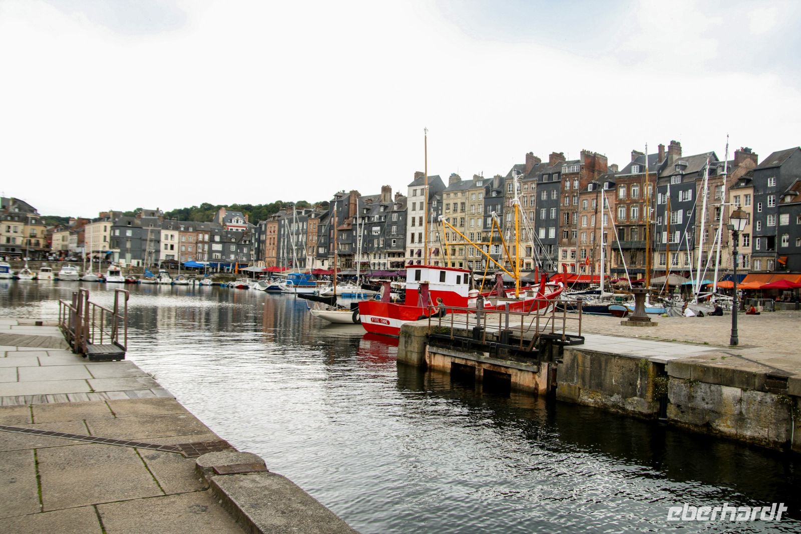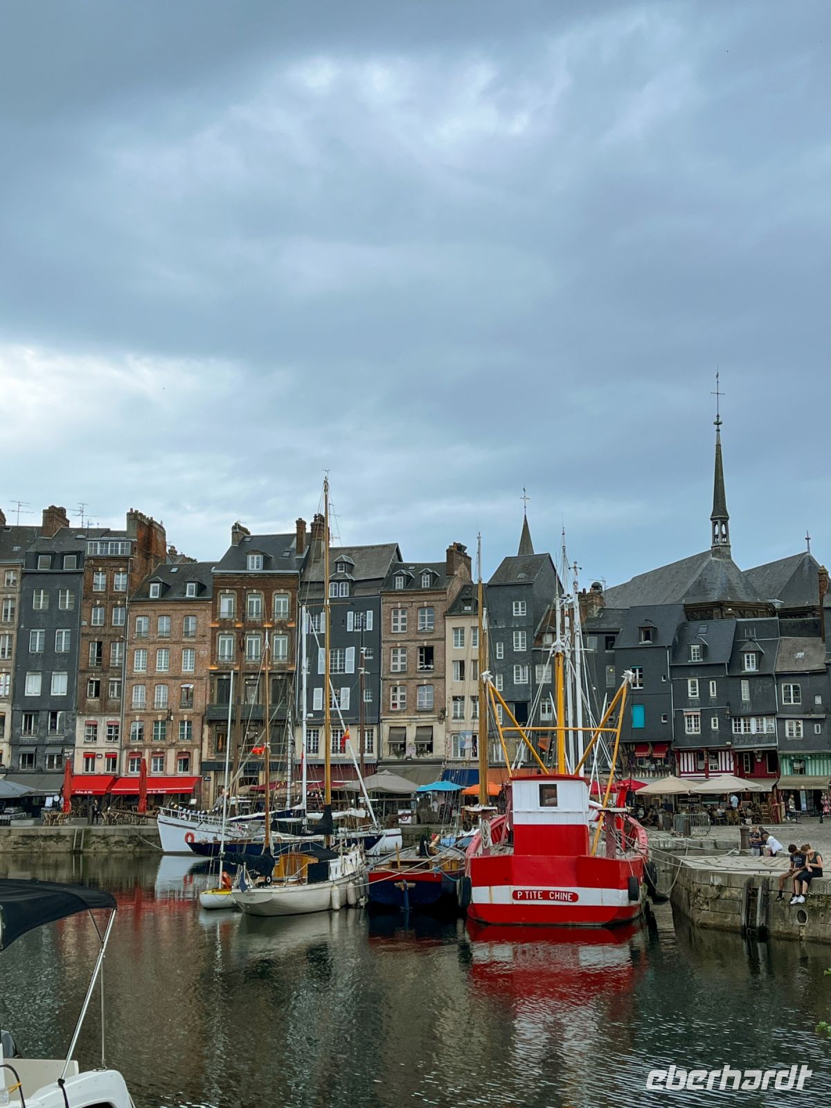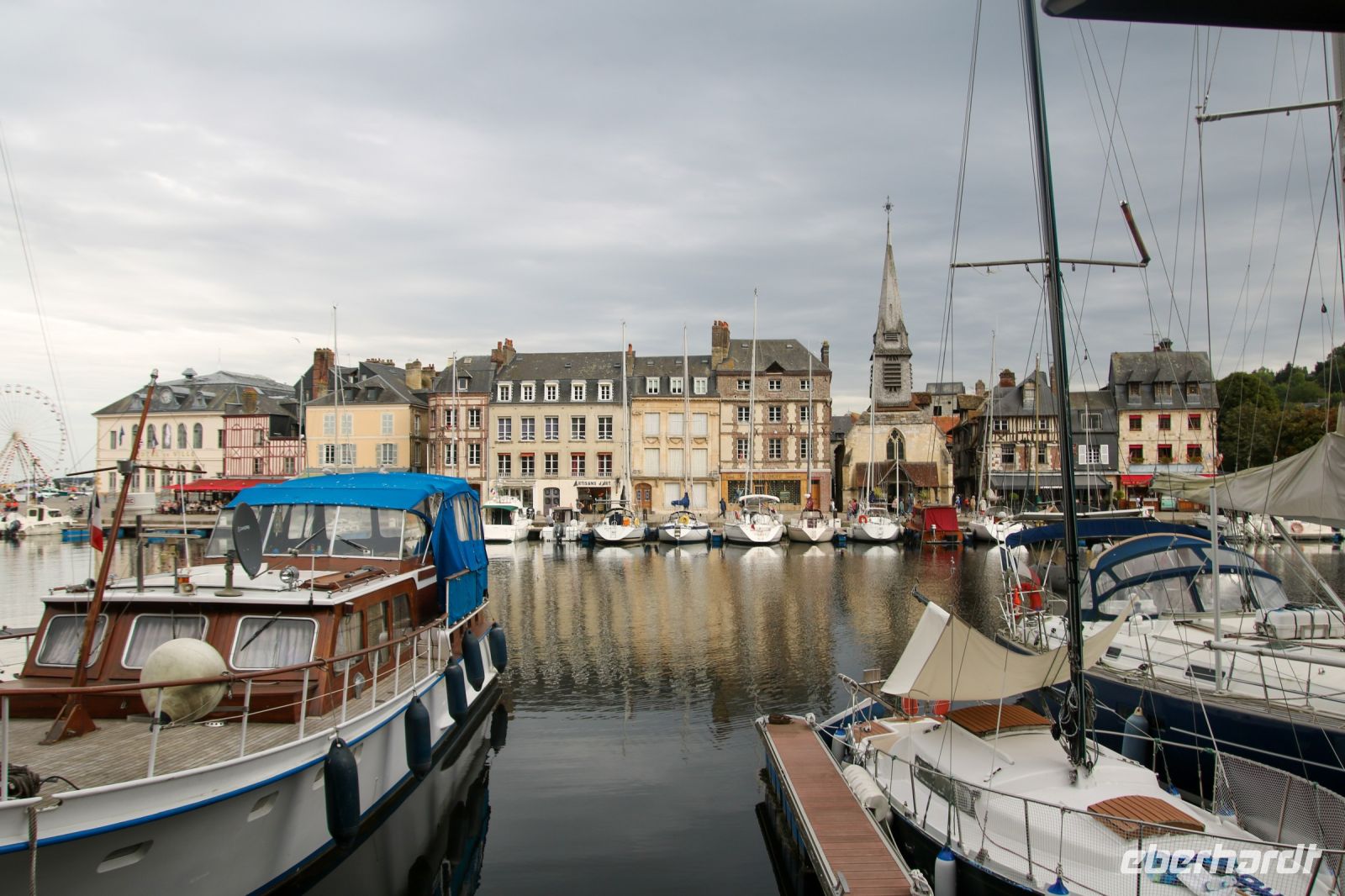 Über die Pont de Normandie, die größte Schrägseilbrücke in ganz Europa, überquerten wir die Seinemündung und erreichten Honfleur für die letzte Besichtigung des Tages. Die Brücke selbst ist über 2400 Meter lang und bis zu 60 Meter hoch. Honfleur lockt mit malerischen Gassen und großartigen Ausblicken, unter anderem auf den von Häusern eingerahmten Hafen. Nicht umsonst gilt die Stadt als eine der schönsten in der ganzen Normandie! Diese Schönheit wussten schon Maler wie Renoir oder Boudin zu schätzen, und so entwickelte sich Honfleur zur Wiege des Impressionismus.