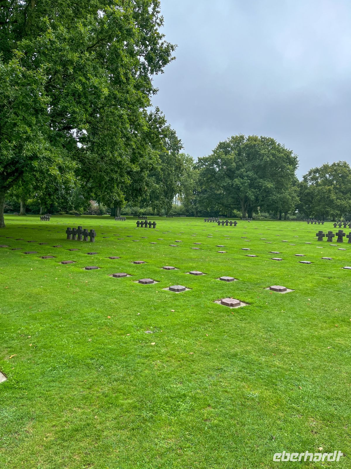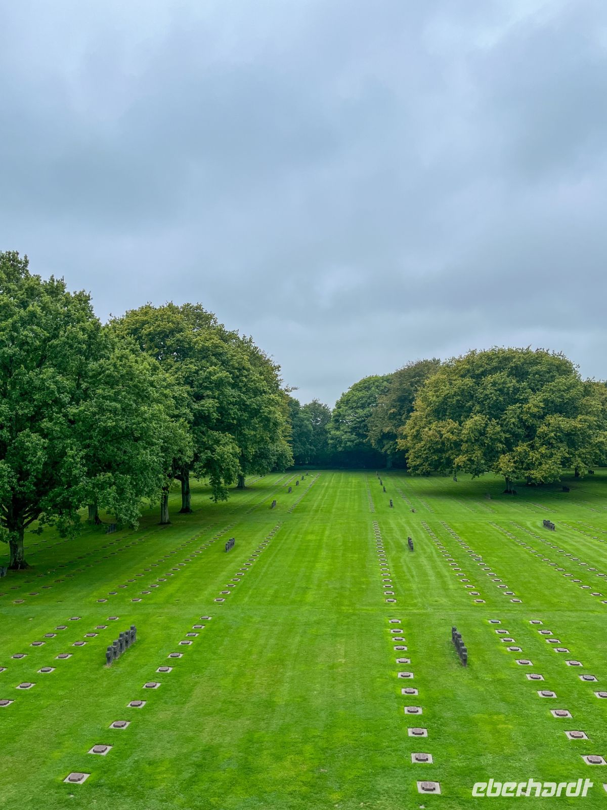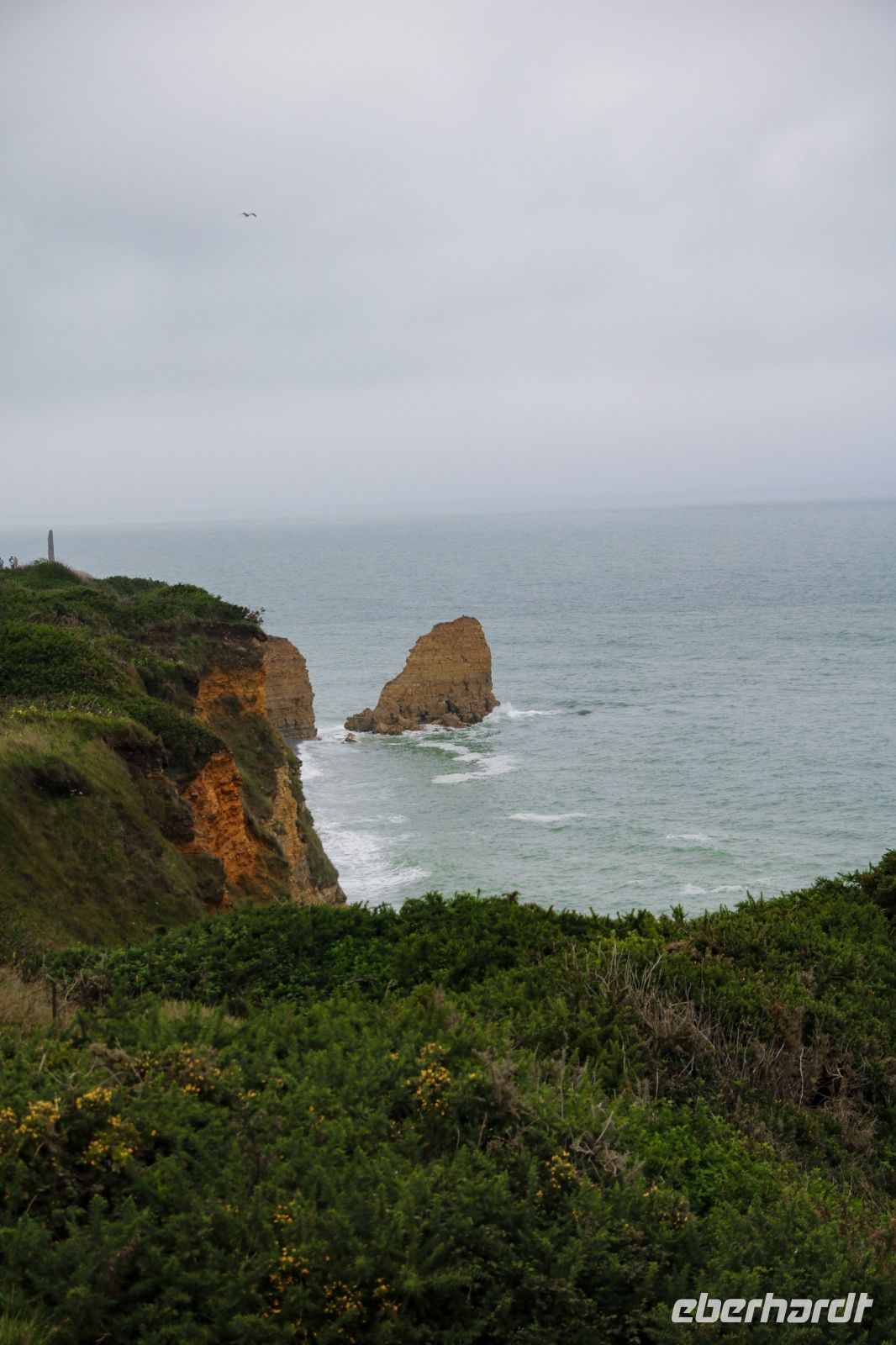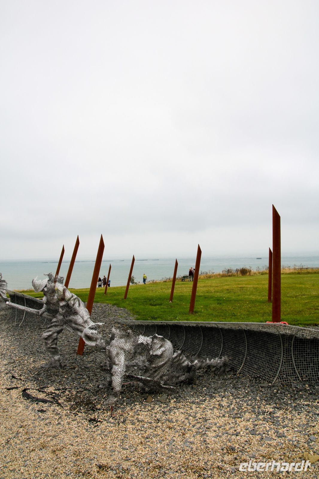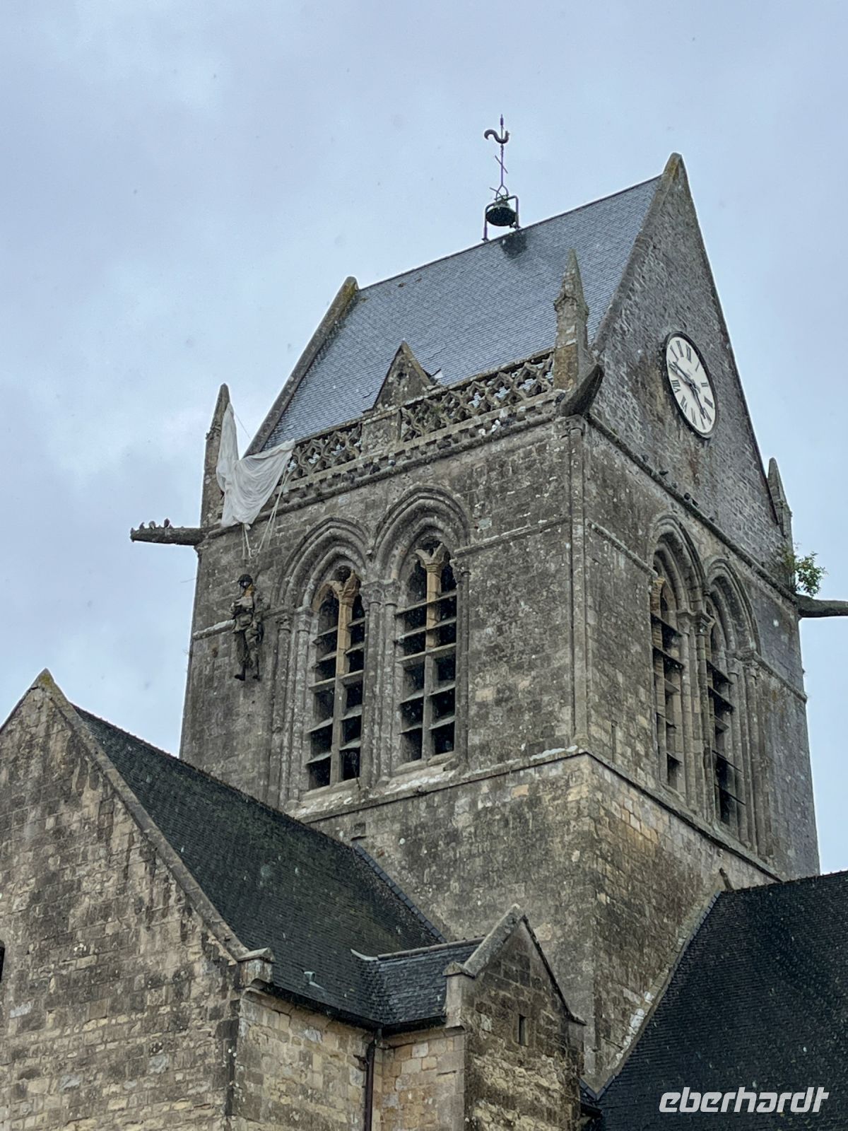 Der 30 Meter hohe Steilküstenabschnitt namens Pointe du Hoc war der nächste Punkt auf unserer Reise. Auf dieser Steilküste befanden sich deutsche Kanonen. Für die Alliierten war es oberste Priorität diese Stellung zu erobern und unschädlich machen, da man von oben uneingeschränkter Sicht auf die gesamte Küste hatte. Hier kletterten mit Leitern ausgestattete Ranger der US-Armee auf die Steilküste und eroberten die deutsche Stellung. Nach dieser beeindruckenden Besichtigung begaben wir uns langsam in Richtung unserem Hotel für die kommenden Nächte. Zunächst aber schauten wir uns die Deutsche Kriegsgräberstätte von La Cambe an. Auf diesem Friedhof fanden über 21.000 deutsche Soldaten der Marine und Luftwaffe ihre letzte Ruhestätte. Im Zentrum der Anlage befindet sich ein begehbarer, knapp 6 Meter hoher Tumulus, eine Art Hügelgrab. Von oben erlangt man einen guten Überblick über das Gelände. Schlussendlich stand die Kirche Sainte-Mère-Église auf dem Plan. Hier landeten 1944 amerikanische Fallschirmjäger. Einer von ihnen war John Steele, der sich bei seiner Landung am Kirchturm verfing und nach einigen Stunden von deutschen Soldaten gefangen genommen wurde, er konnte dann aber entkommen. Noch heute erinnert eine Puppe, die samt Fallschirm am Kirchturm hängt, an diese skurrile Situation vom 6. Juni 1944. Auch diese Szene wird im Film „Der längste Tag“ aufgegriffen und verarbeitet.