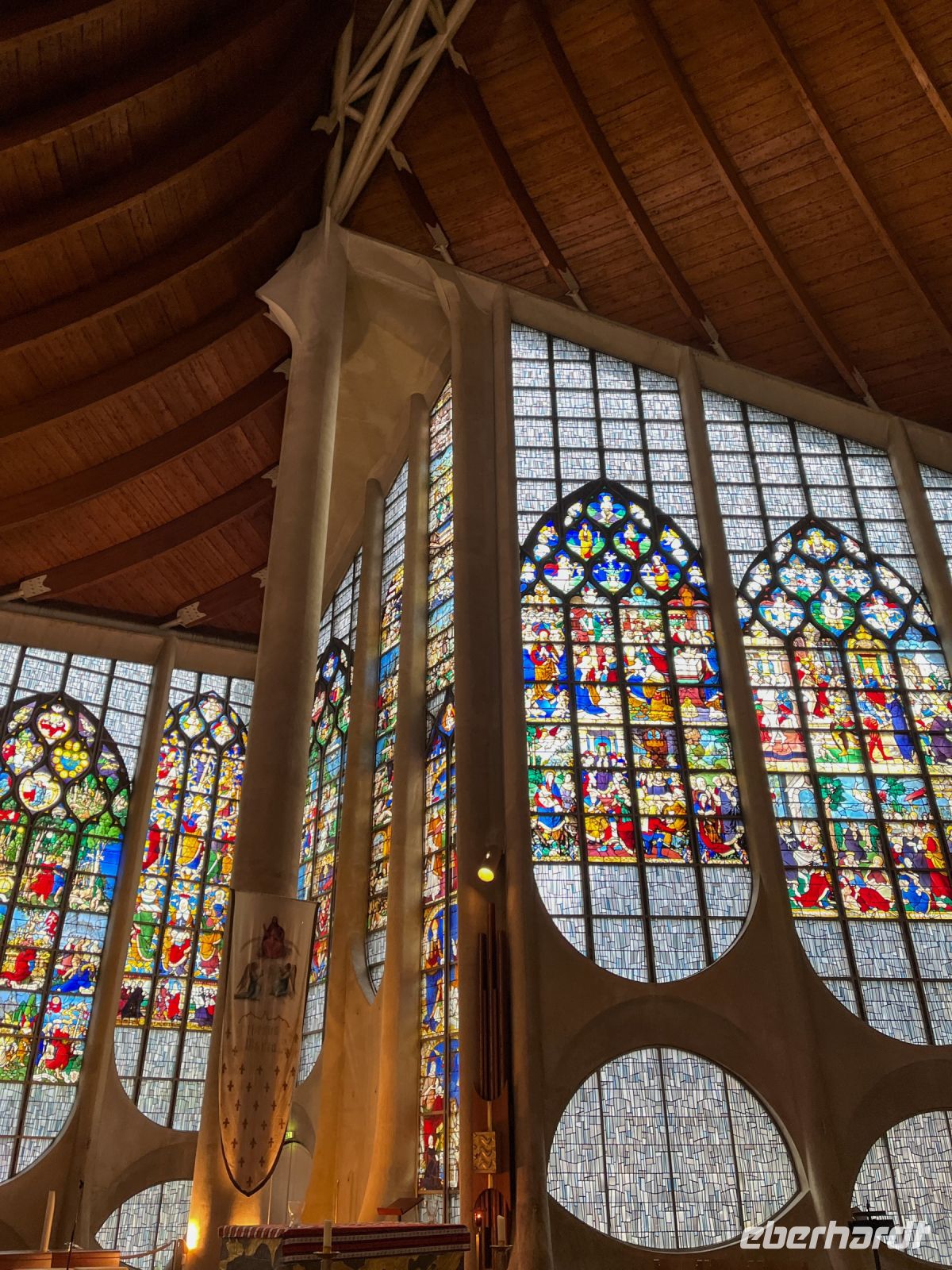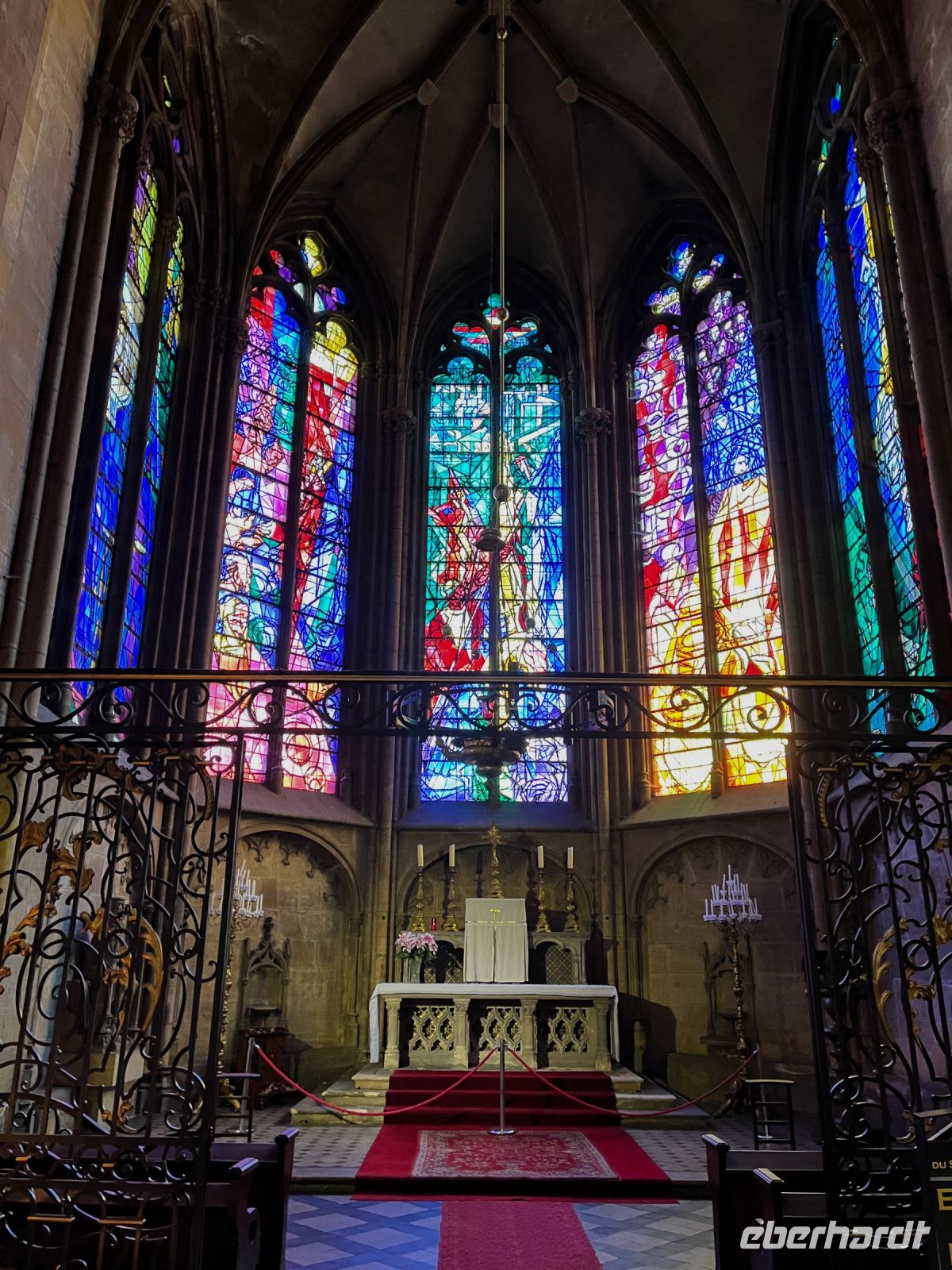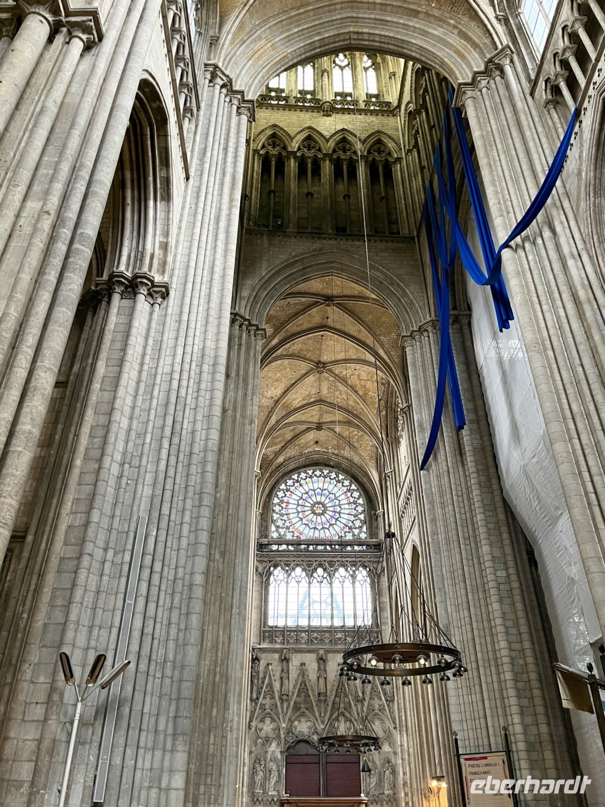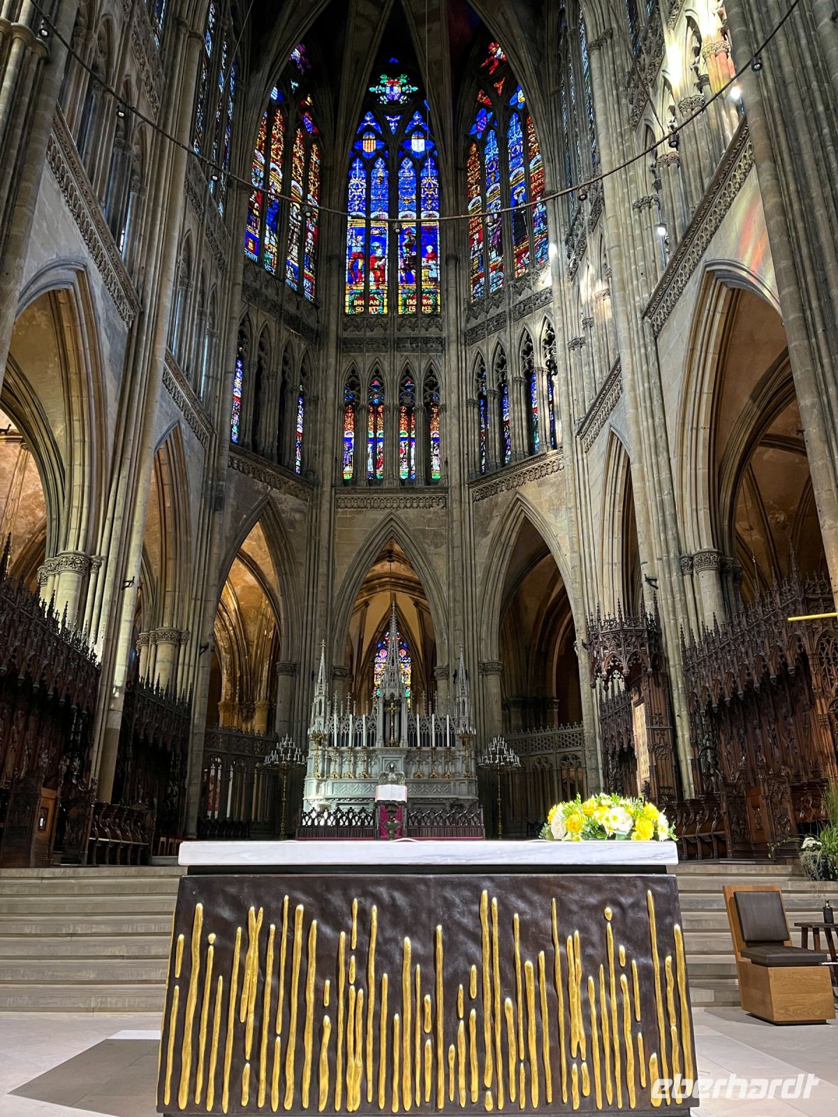 Als nächstes erwartete uns kein Schloss – sondern eine Kathedrale, die Kathedrale von Chartres. Schon von weitem kann man die Silhouette erkennen, die die umliegende Stadt überragt. Ganze 113 Meter ist der sakrale Bau hoch! Auffällig ist neben der Größe auch die beiden unterschiedlich gestalteten Türme. In das Innere der Kathedrale, die 1260 fertiggestellt wurde, gelangt man über 3 unterschiedliche Eingangsportale, die jeweils Szenen aus dem Leben Jesus darstellen. Drinnen angekommen überrascht die Kathedrale mit vielen Eigenheiten. Die großen Fenster fallen hier direkt ins Auge. Diese sind seit dem Mittelalter unzerstört und für sie wurde extra eine neue Glasfarbe entwickelt, die Chartres-Blau genannt wird. Die Reinheit der Farbe macht sie zu etwas ganz Besonderem. Wenn der Boden nicht mit Stühlen vollgestellt ist, kann man hier ein Labyrinth aus dem 13. Jahrhundert entdecken. Es hat einen Durchmesser von mehr als 12 Metern und bedeckt einen großen Abschnitt des Bodens.