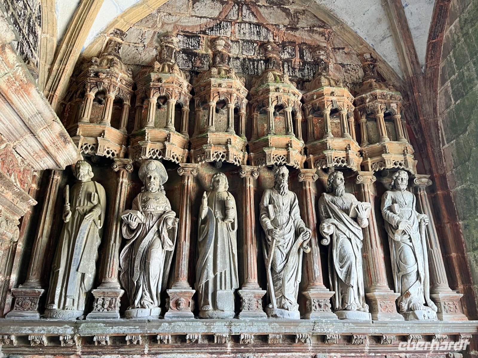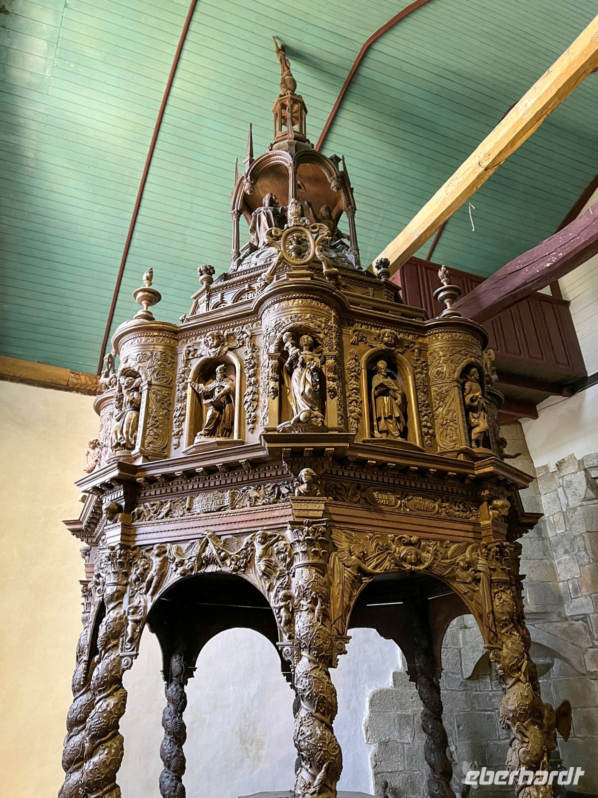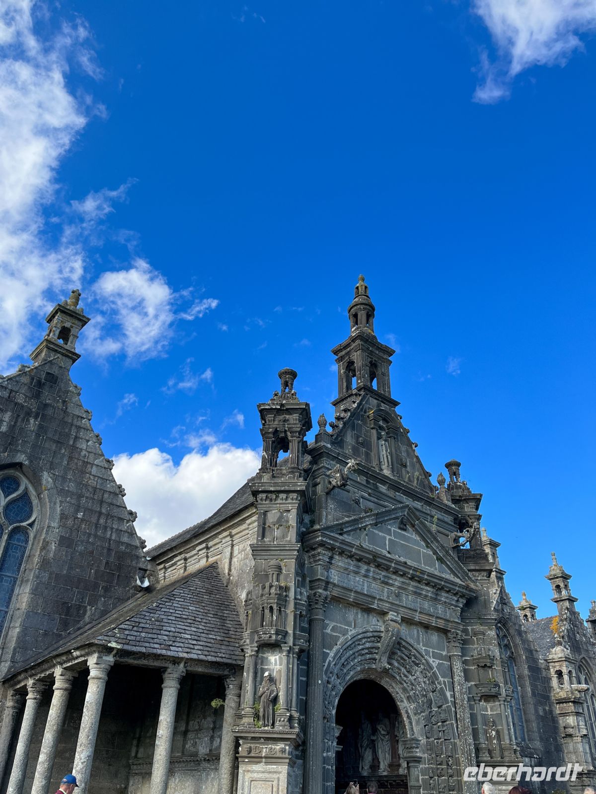 Unseren letzten Stopp für eine Besichtigung machten wir in Guimilliau. Hier befindet sich einer der prunkvollsten „umfriedeten Pfarrhöfe“ in Frankreich. Die Anlage umfasst eine Mauer mit Triumphbogen, der das Reich der Lebenden von den Toten trennt, ein Beinhaus und einen Kalvarienberg, eine steinerne Erhebung, die mit Darstellungen einer Kreuzigungsgruppe verziert ist. Diese Verzierungen stammen aus dem 16. bis 18. Jahrhundert und wurden von der einfachen Bevölkerung in den Stein geschlagen - hier hatte also kein berühmter Künstler oder Bildhauer seine Hände im Spiel.