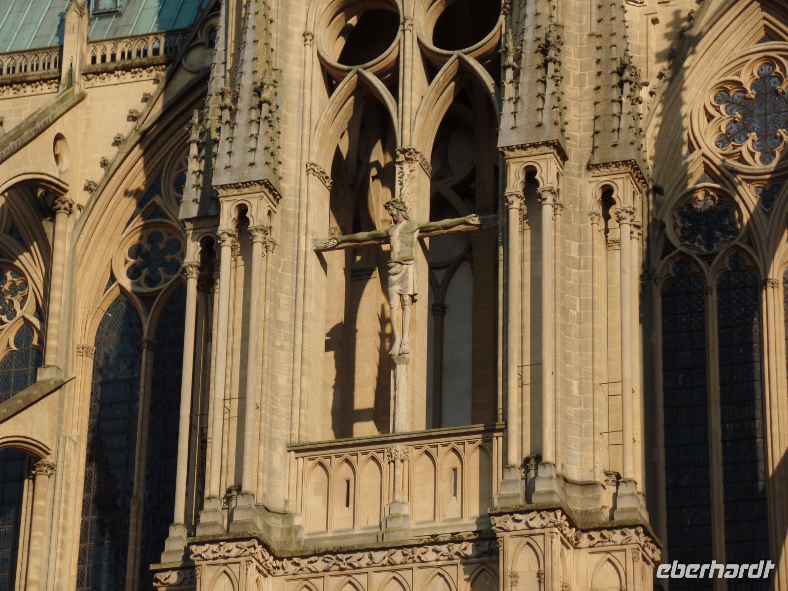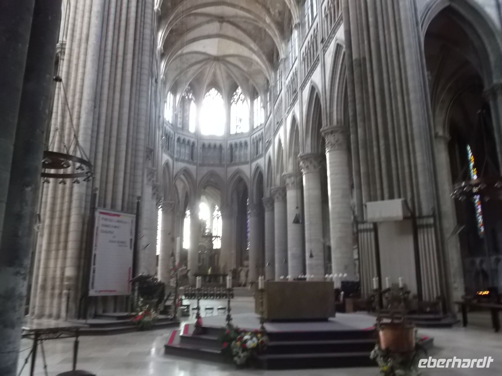 An die Nordseite der Kirche schließen die Ruinen des alten Bischofspalastes an, deren noch bestehenden Überreste von großer Bedeutung für die französische Geschichte sind – denn hier fand der Prozess gegen die historische Heldin und „Nationalheilige“ statt. Jeanne d’Arc, bekannt als die „Jungfrau von Orleans“ hatte während des mörderischen hundertjährigen Krieges Englands gegen Frankreich ihre Landsleute in mehreren Schlachten angeführt und wahrscheinlich entscheidend zur Wende des Krieges zugunsten Frankreichs beigetragen. 1430 konnten die Engländer sie aber gefangen nehmen und sie in einem historischen Schauprozess wegen Ketzerei 1431 in genau dem Gerichtssaal an der Nordwand der Kathedrale von Rouen zum Tode verurteilen und kurz darauf auf dem Scheiterhaufen am alten Markt verbrennen. An dieser Stelle erhebt sich heute ein gewaltiges Gedenk-Kreuz, an dem fast immer frische Blumen liegen ….