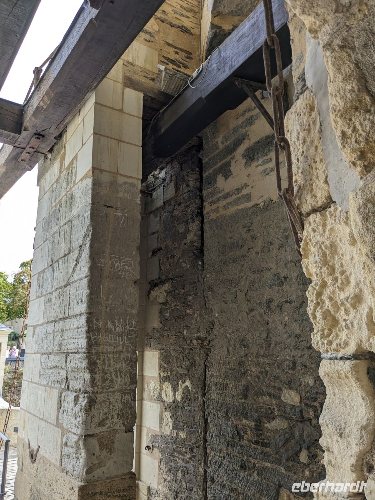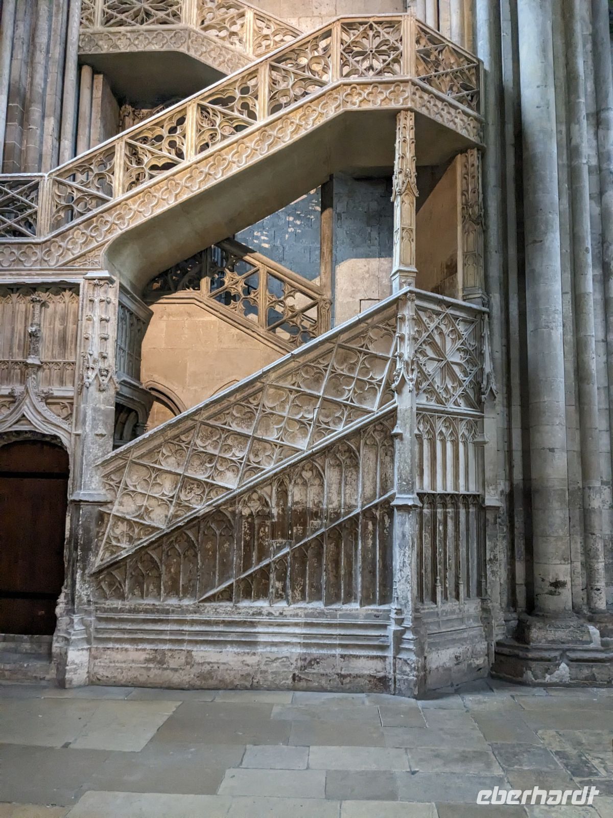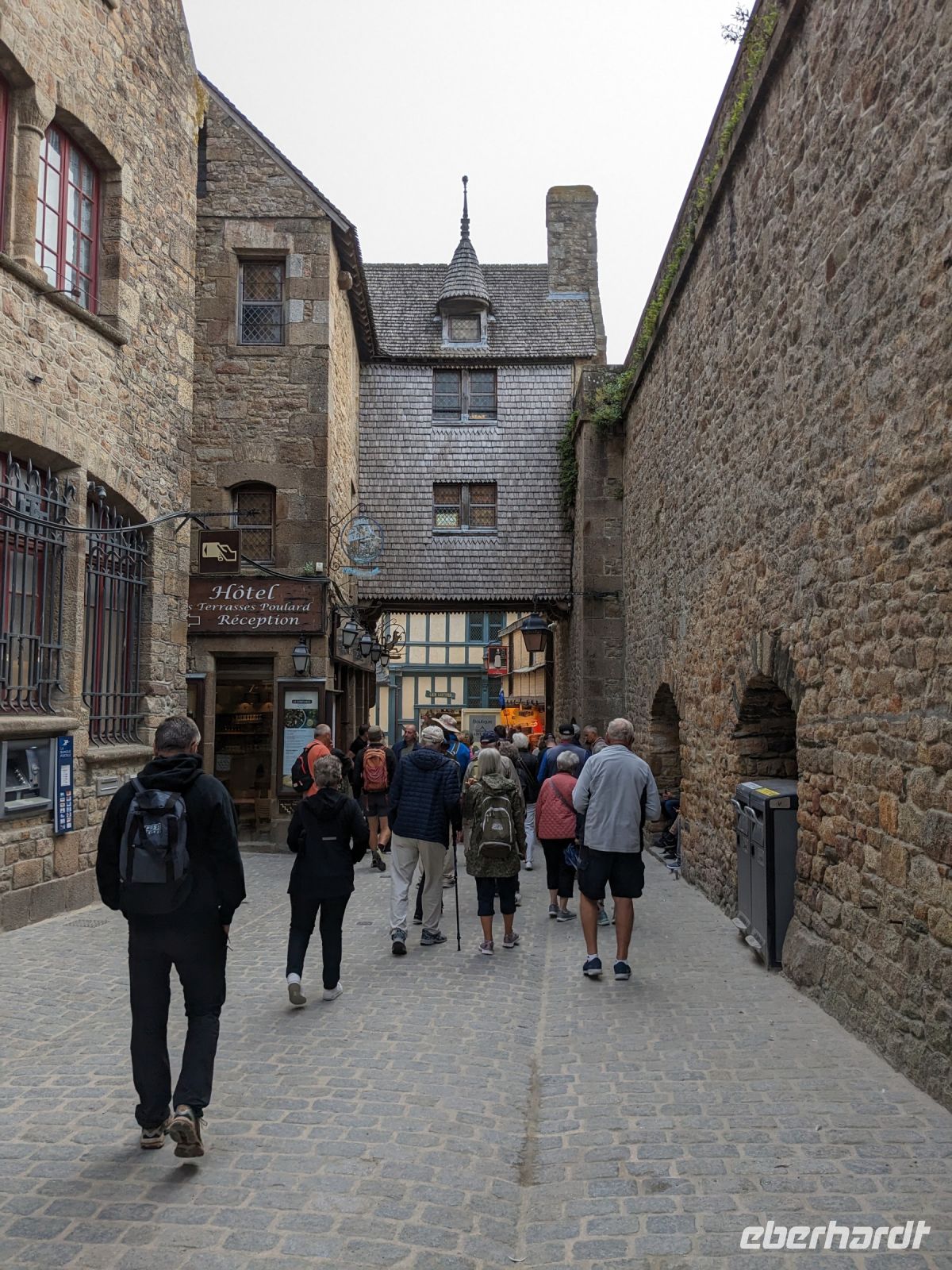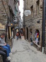 Reiseleiterin Kirstin empfing die Reisegäste am „Stadttor“ und erläuterte schon während des anstrengenden Aufstieges Geschichte und Besonderheiten der Anlage. Direkt neben der Kirche und nach deren Besichtigung folgte eines der „Wunder“ vom Mont St.Michel, der „schwebenden Kreuzgang“. Er ruht auf filigranen Säulen , ist nur mit leichtem Holzdach und hölzernem Tonnengewölbe gedeckt und weist eine zur Bucht hin teilweise offene Seite au. Dadurch kann der Eindruck entstehen, er ende direkt im Himmel und würde gleichsam schweben.