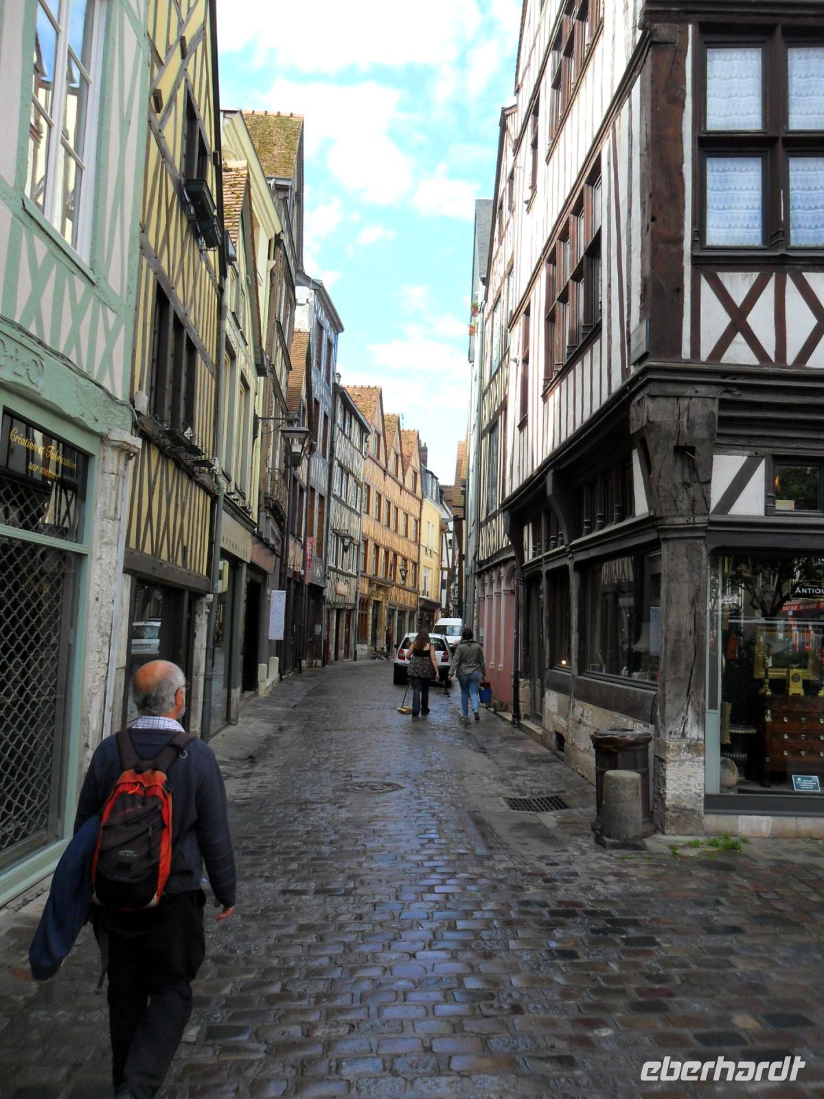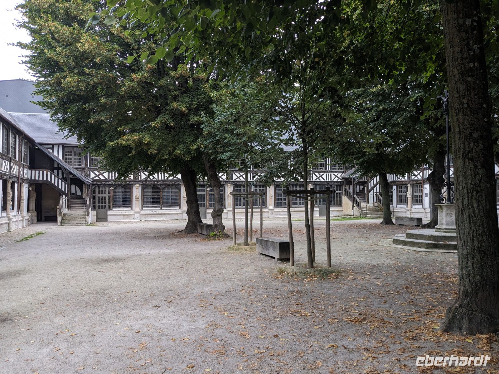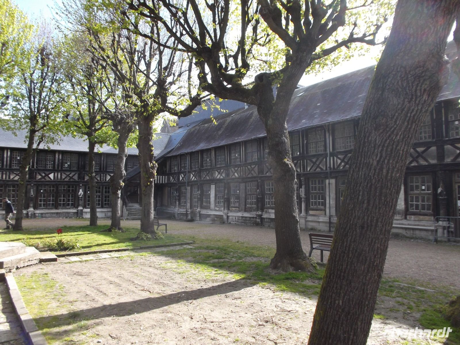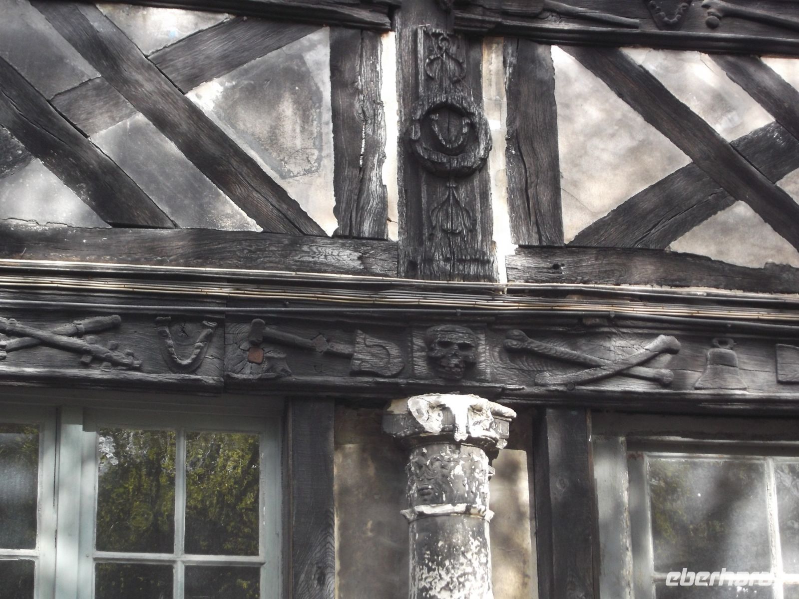 Unser Weg, der später am Rouener Markt enden sollte, führte durch die schmalste (Fachwerk)Straße Rouens zunächst zu einer hübschen Pfarrkirche und dann an pittoresken Fachwerkhäusern vorbei zur vielleicht merkwürdigsten und etwas makaberen Sehenswürdigkeit in der Hauptstadt der Normandie: dem Aitre de Maclou. Der viereckige Hof wird durch zweistöckige, hübsche Fachwerkgebäude umschlossen, die bei näherem Hinsehen makabere uralte Verzierungen und Schnitzereien aufweisen, die Totenköpfe, menschliche Gebeine und Beerdigungswerkzeuge darstellen. Das interessante Bauwerk, übrigens eines der ältesten original erhaltenen Fachwerkensembles in Europa, ist ein alter Pestfriedhof.