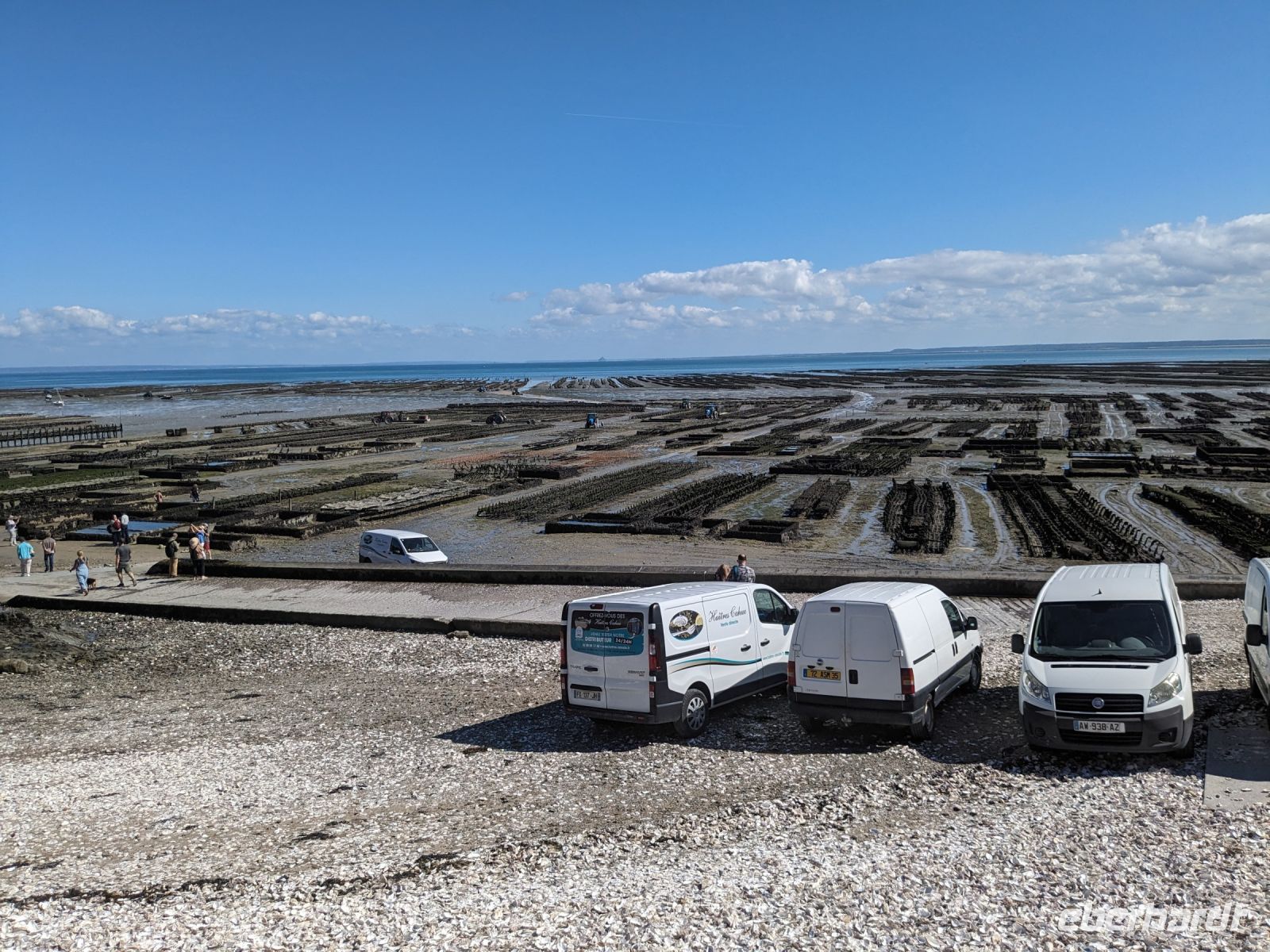 Gegen Mittag trafen wir uns wieder am Bus und setzten unser Besichtigungsprogramm fort. Nach erreichen der Küste der Bucht Mont Saint Michel konnten wir einige für die hier übliche Austern-Ernte genutzten „Austernboote“ fotografieren. Unsere Gäste erfuhren Wissenswertes über diese große Muschelart, die weltweit als teure Delikatesse gilt. Austern nur geerntet und in Feinschmeckerlokale verschickt werden, wenn man sie vorher in einer besonderen Becken-Anlage, einer sogenannten „Austernschule“ an einen veränderten Ebbe-und-Flut-Rhythmus gewöhnt, damit sie sich sehr lange geschlossen halten. Eine der wichtigsten Regeln beim Austern-Essen ist, dass man nur eine geschlossene Auster genießen kann, da sie Vergiftungserscheinungen hervorruft. Etwas später erreichten wir Cancale, den berühmtesten der französischen Austernorte, von dem schon die Römer diese Muschel-Köstlichkeit bezogen haben sollen. Der malerische Fischerort mit vielen Restaurants und einem großen, bei Ebbe leergelaufenen Hafen hat gleich neben seinem kleinen Leuchtturm einen bekannten, wenn auch überschaubaren Austernmarkt. An einigen Ständen werden dort frische Austern verkauft und wir wollten hier die begehrten Meeresfrüchte frisch vom Händler kaufen und kosten. Das Schlürfen, Kauen und Schlucken einer lebenden Auster – nur so ist es stilecht – ist vielleicht nicht jedermanns Sache, aber viele unserer Gäste haben sich – manche das erste Mal -getraut, Austern zu kosten.