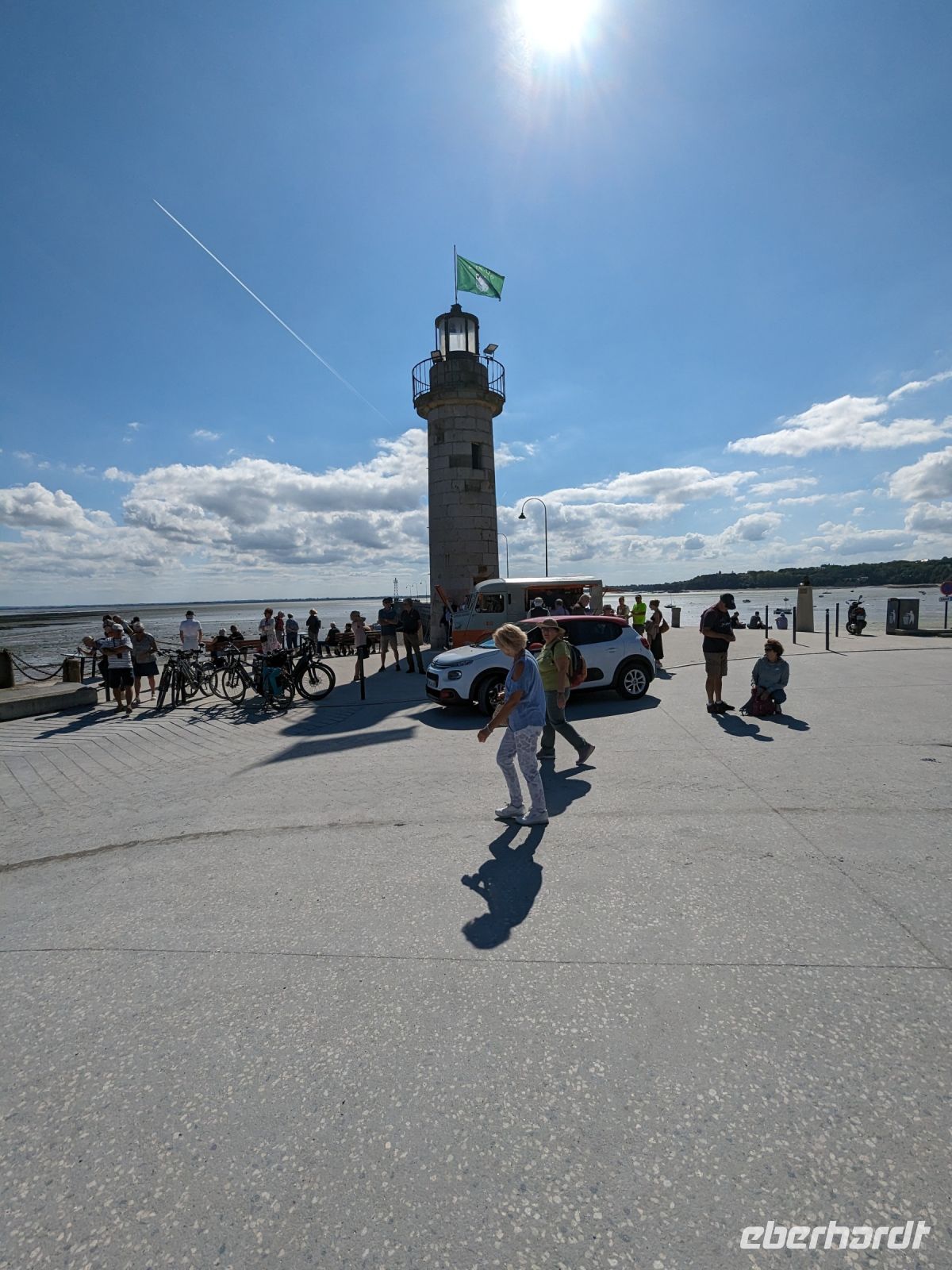 Eigentlich war er programmfrei, dieser Tag. Aber wir uns in so herrlicher Umgebung befanden, wollten wohl alle noch mehr sehen, und so schlossen sich alle Gäste dem Angebot eines fakultativen Ausflugs auf die Halbinsel Cornouaille an. Auf der – fast wie Deutschland durch Baustellen und Umleitungen erschwert passierbaren - Landstraße erreichten wir durch den bekannten Marktort Audierne fahrend die Westspitze der Halbinsel Cornouaille, die durch ihre ersten Besiedler die französische Version des Namens des südenglischen Halbinsel Cornwall erhalten hatte, deren vielbesuchtes Ziel die Felsenspitze der „Pointe du Raz“ mit starker Meeresströmung, viel Brandung und vorgelagerten Inseln ist. Während unsere Gäste eine Wanderung zu diesem Ort unternahmen, fuhren Chauffeur Roberto Thun und ich mit dem Bus zum Einkaufen. So konnten wir den Reisegästen bei der Rückkehr ein kleines Picknick als Mittagsimbiss anbieten – mit marktfrischen Spezialitäten und Käse und frischem Baguette aus der Region. Und die Gäste ließen es sich schmecken und es wurde auch alles alle – sogar der Rotwein. Zum Schluss waren sich alle einig, dass so ein Picknick, in schöner Landschaft bei zwar bedecktem, aber warmem Wetter ohne Regen unter freiem Himmel mit einfachen, rustikalen regionalen Erzeugnissen eine gute Idee gewesen war.