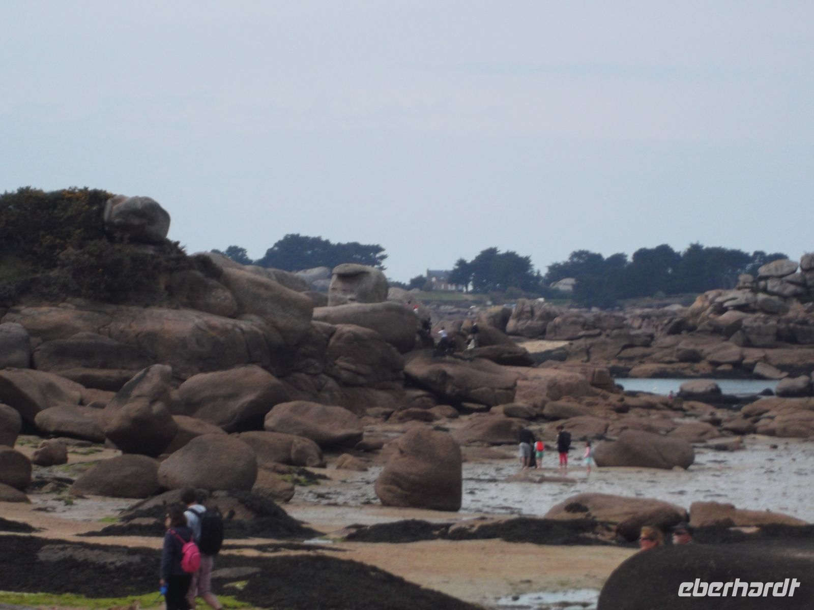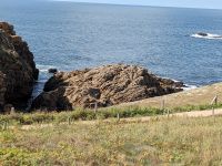 Von hier ging es zum nächsten landschaftlichen Höhepunkt: der rosa Granitküste. Wir mussten ein ganzes Stück fahren, bevor wir das beliebte Feriengebiet erreichten. Die relativ kurze „Côte de granit rosé“ beginnt nahe dem beliebten Ferienort Perros-Guirec und ist für ihre rasafarben bis rot – je nach Beleuchtung und Meerwasserstand hell oder dunkel schimmernd - Felsformationen bekannt. Nach einer Fahrt durch die verwinkelten Gassen des ebenfalls beliebten Nachbarstädtchens von Peros Guirec parkte der Bus in Ploumanach. Von dem hübschen Fischer- und Touristenort aus kann man ganz nach Wunsch längere oder kürzere Wanderungen zu den Felsformationen unternehmen, vor allem entlang dem „Sentier des douaniers“, des alten „Zöllnerpfades“. Wir hatten hier genügend Zeit, so dass jeder gemäß eigenen Ansprüchen und Vorstellungen Hafenszenerie, Küste, Felsgebilde und Zöllnerpfad erkunden konnte.