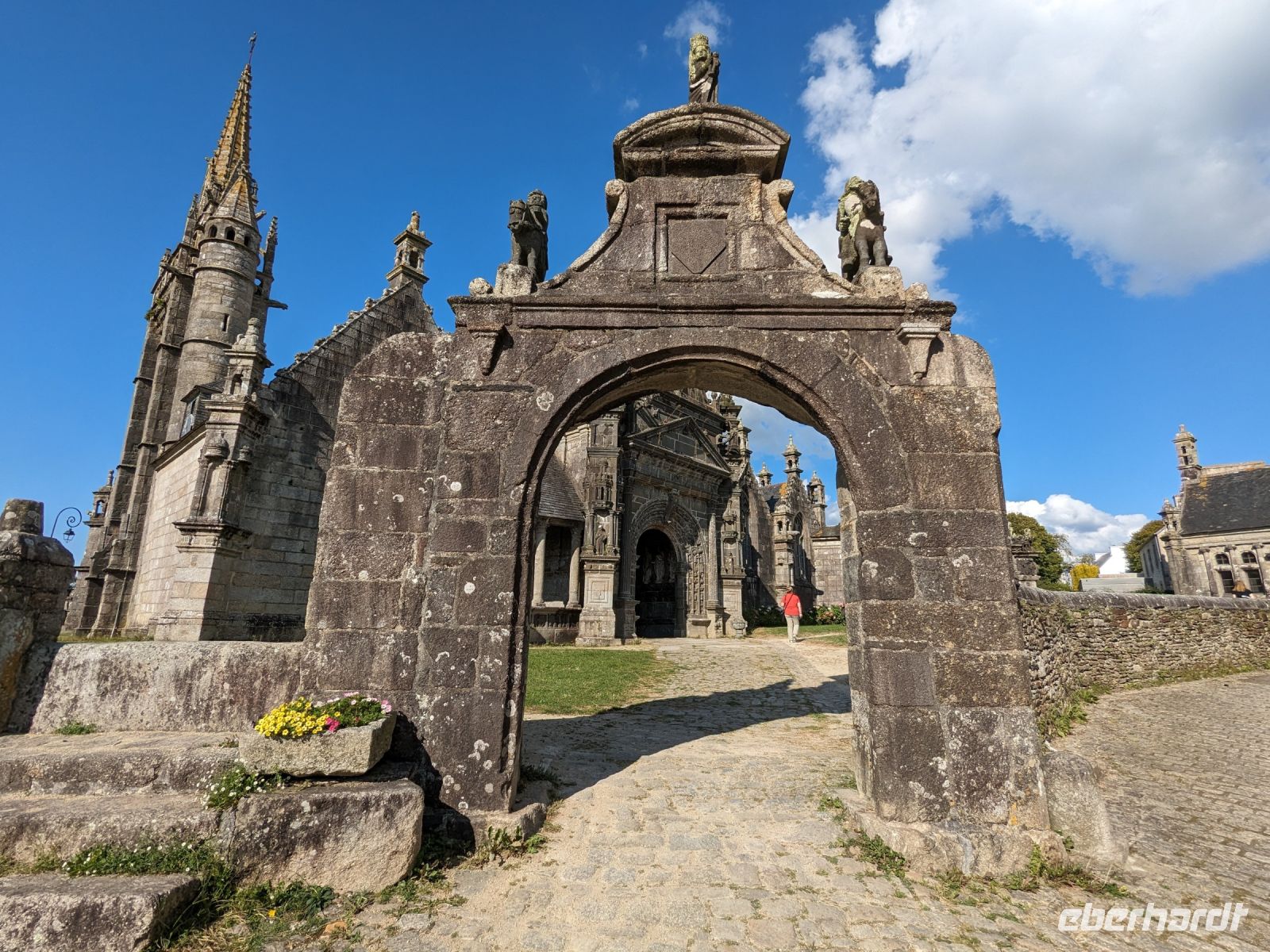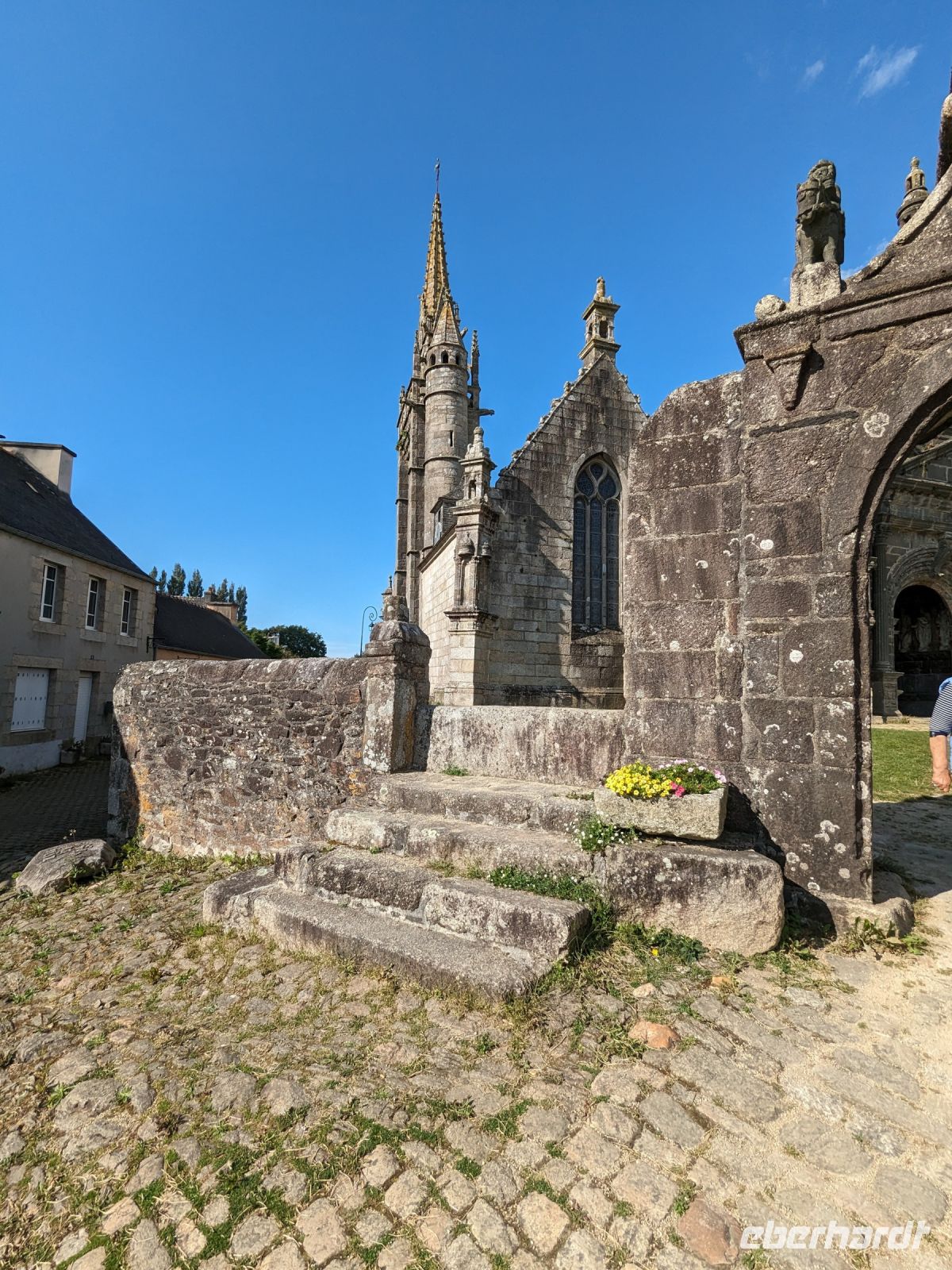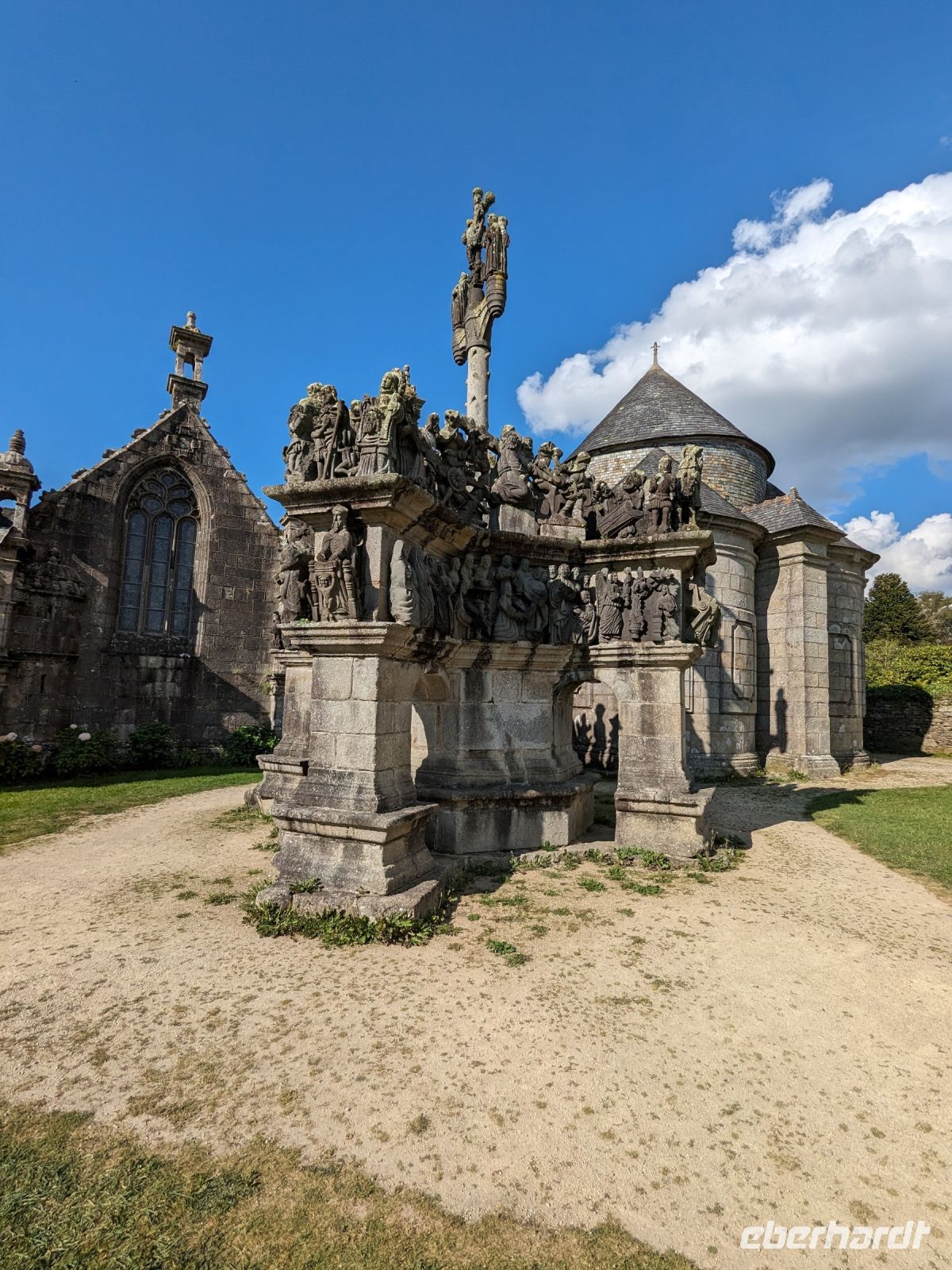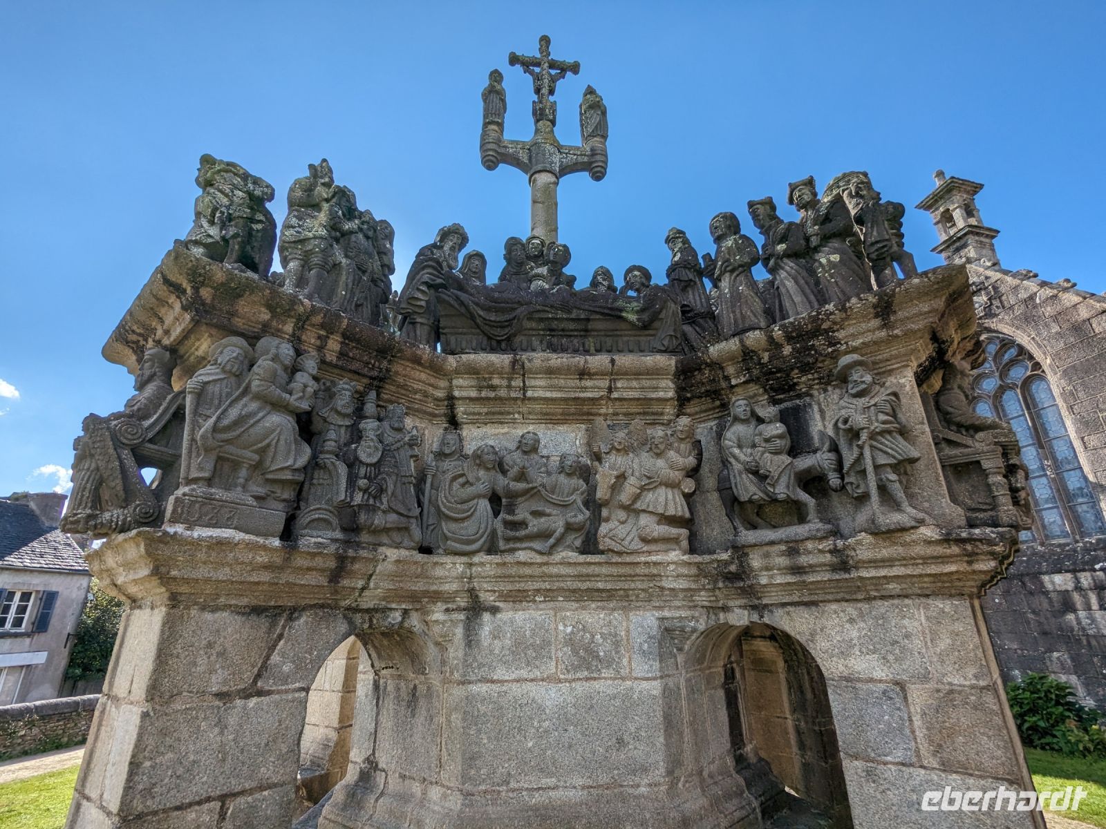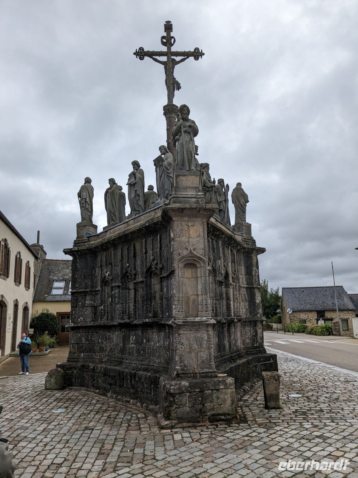 Am Nachmittag dasuerte es dann wieder etwas, bevor wir das Dorf Guimiliau erreichten. Wie die meisten Orte der bretonischen Küstenregion und des Hinterlandes ist die Gegend eine der am stärksten religiös geprägten Teile der Bretagne. Eine Besonderheit fast aller Dörfer hier sind „umfriedete Pfarrhöfe“ – kunstvoll von namenlosen Könnern und Handwerkern der Bauernarchitektur aus hartem Granit gestalte Kirchenensembles mit besonderen Details wie Beinhäusern, Triumphtoren, Ummauerungen sowie üppig mit „naivem“ Schmuck versehene Dorfkirchen und vor allem den einzigartigen „Kalvarienbergen“. In ihnen verweben sich seit dem 15. Jahrhundert Legenden und vorchristlicher Totenkult mit dem Christentum und der Bibelverehrung und ihre Gestaltung ist vor allem für die einfache Bevölkerung, des Lesens und Schreibens unkundig, gedacht gewesen.