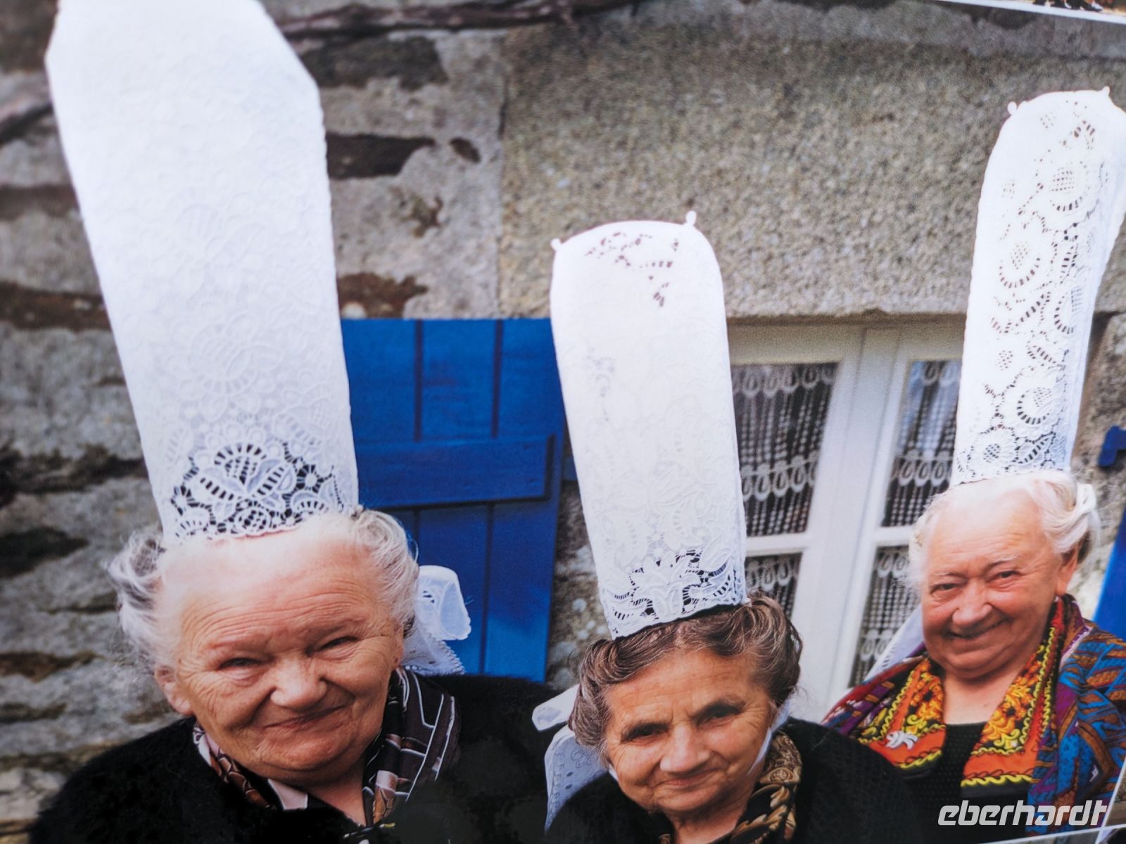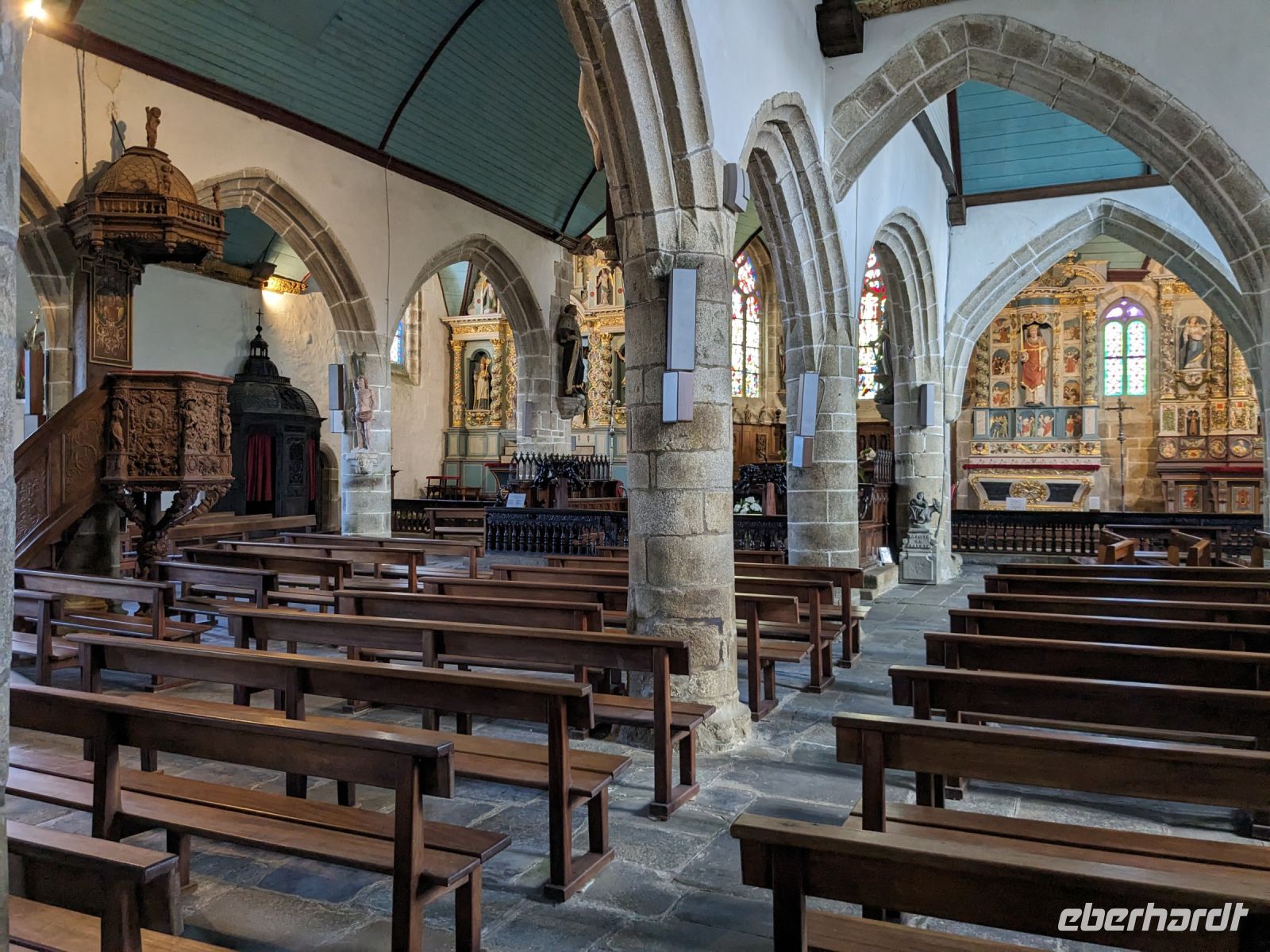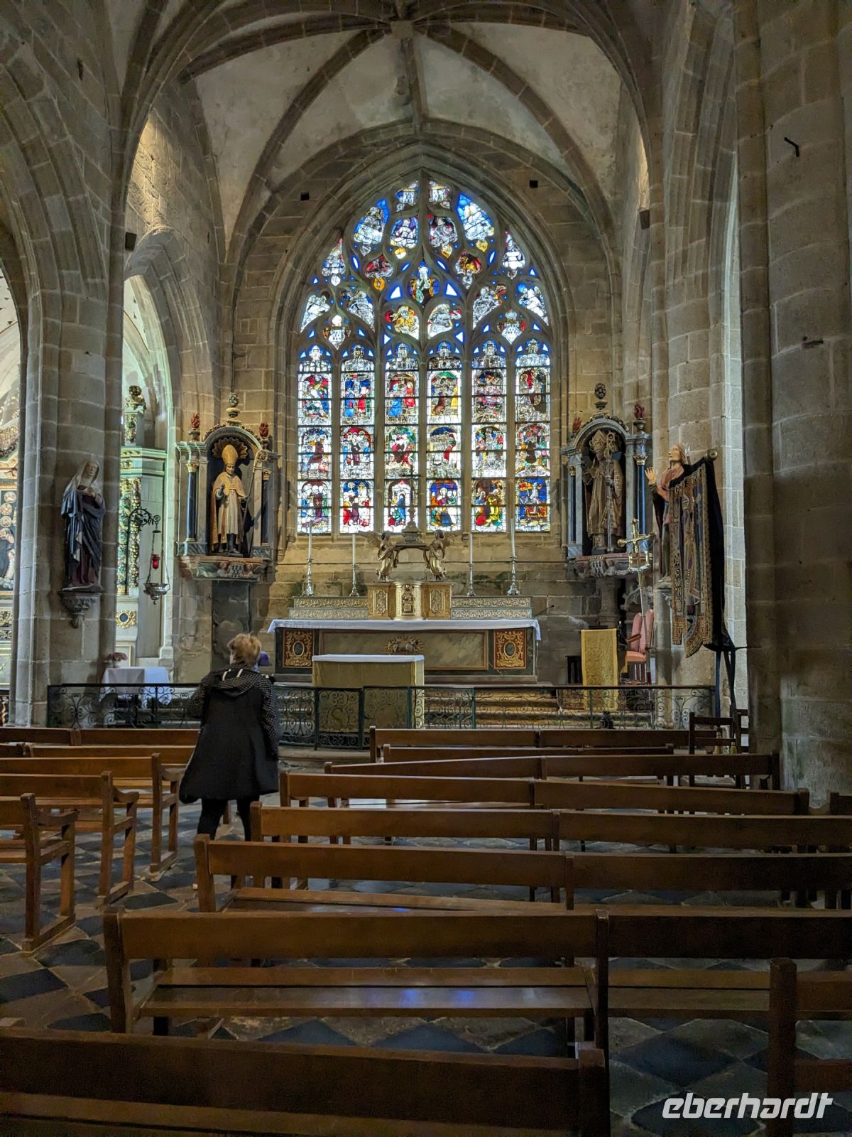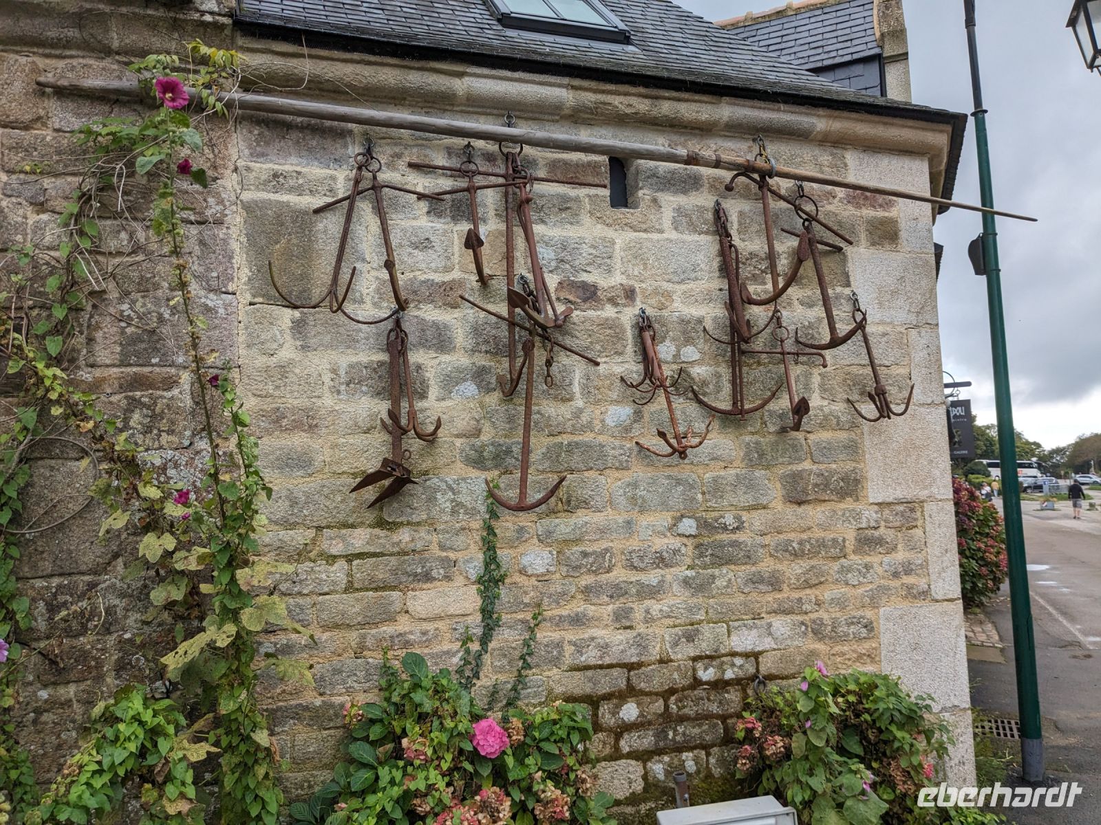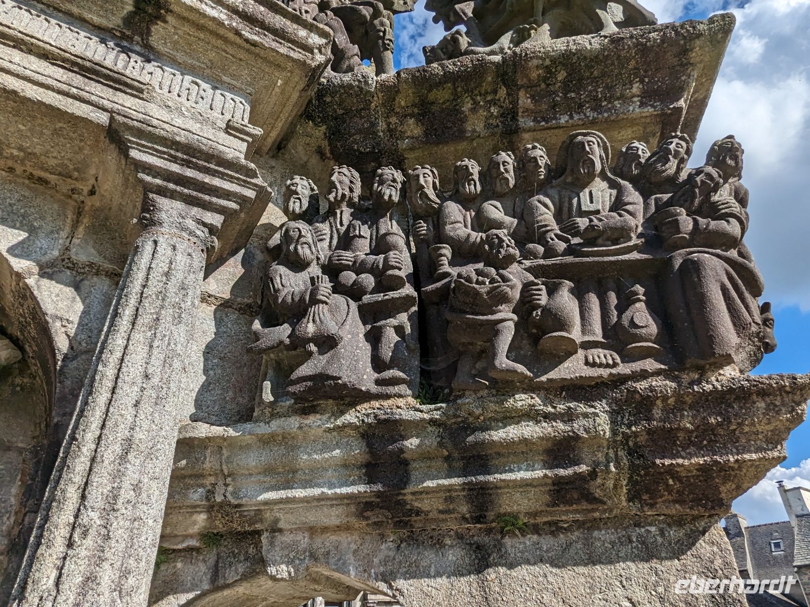 Am Nachmittag dasuerte es dann wieder etwas, bevor wir das Dorf Guimiliau erreichten. Wie die meisten Orte der bretonischen Küstenregion und des Hinterlandes ist die Gegend eine der am stärksten religiös geprägten Teile der Bretagne. Eine Besonderheit fast aller Dörfer hier sind „umfriedete Pfarrhöfe“ – kunstvoll von namenlosen Könnern und Handwerkern der Bauernarchitektur aus hartem Granit gestalte Kirchenensembles mit besonderen Details wie Beinhäusern, Triumphtoren, Ummauerungen sowie üppig mit „naivem“ Schmuck versehene Dorfkirchen und vor allem den einzigartigen „Kalvarienbergen“. In ihnen verweben sich seit dem 15. Jahrhundert Legenden und vorchristlicher Totenkult mit dem Christentum und der Bibelverehrung und ihre Gestaltung ist vor allem für die einfache Bevölkerung, des Lesens und Schreibens unkundig, gedacht gewesen.