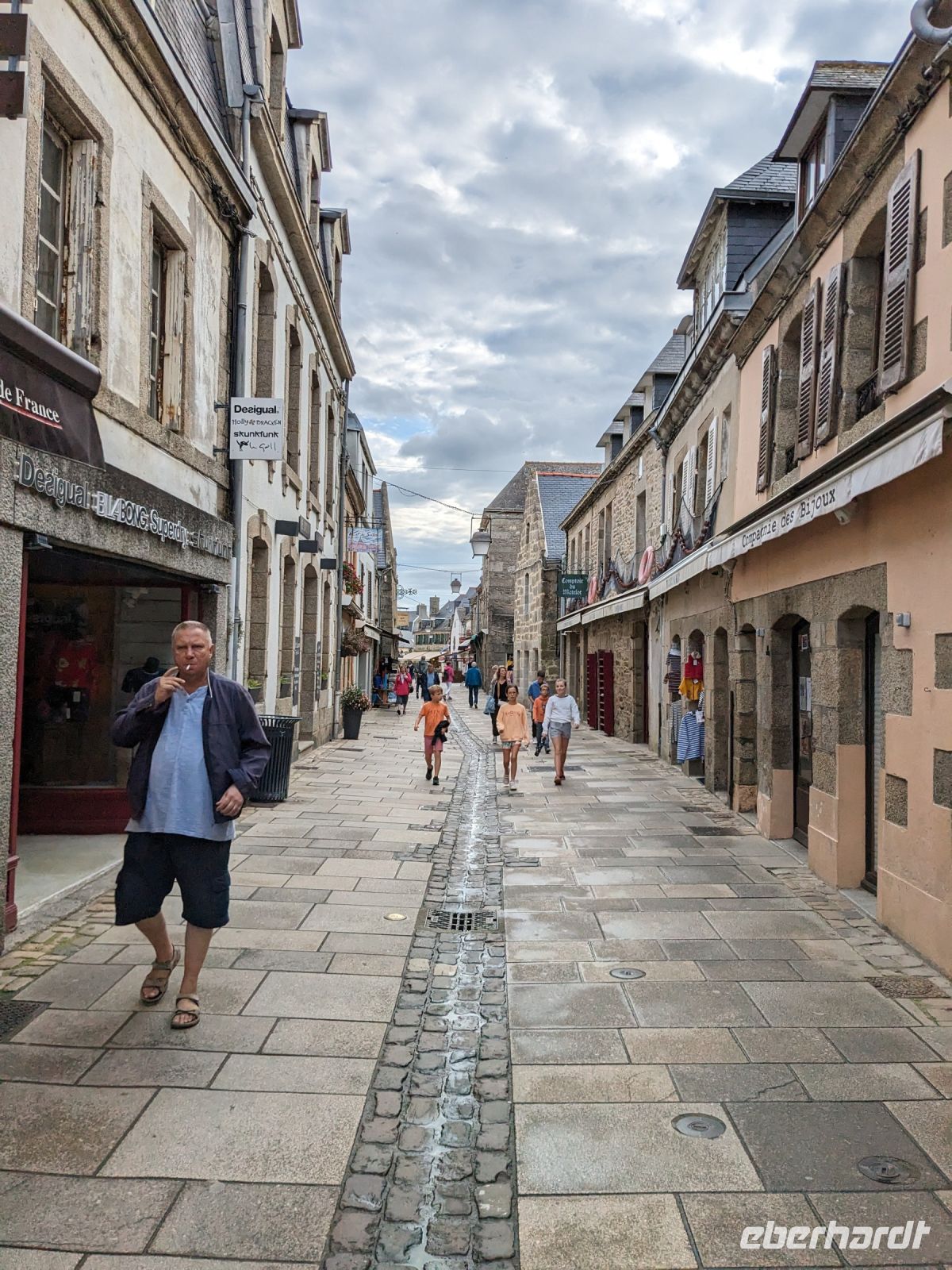 Am Nachmittag dieses schönen Tages besuchten wir noch Locronan, ein komplett unter Denkmalschutz stehendes Städtchen, das ganz hervorragend sein mittelalterliches Flair bewahren konnte. Dadurch entdeckte man es bereits in den 50er Jahren des 20. Jh. als Drehort historischer Filme. Locronan, einst bekannt für das hier erzeugte Segeltuch, stieg so zur Kulisse vieler sogenannter „Mantel-undf-Degen-Filme“ auf – mit berühmten französischen Schauspielern wie Gerard Philippe, Jean Marais, Alain Delon und Jean Paul Belmondo. Auch mehrere „Musketiere“-Klassiker wie der mit Michael York und Oliver Reed in den Hauptrollen (und mit dem als „Dracula-Darsteller“ bekanntem Christopher Lee als finsterem, einäugigen Grafen Rochefort) wurden hier gedreht. Wir hatten nach einem kurzen Gang zur Kirche Gelegenheit zu einem ausgiebigen Spaziergang in den malerischen Straßen und auf dem Marktplatz des autofreien Ortes.