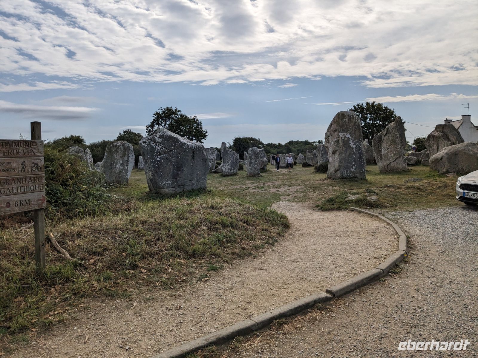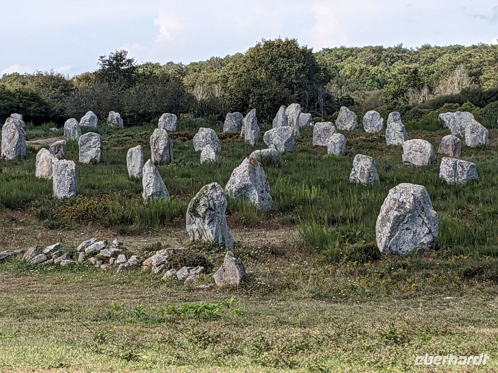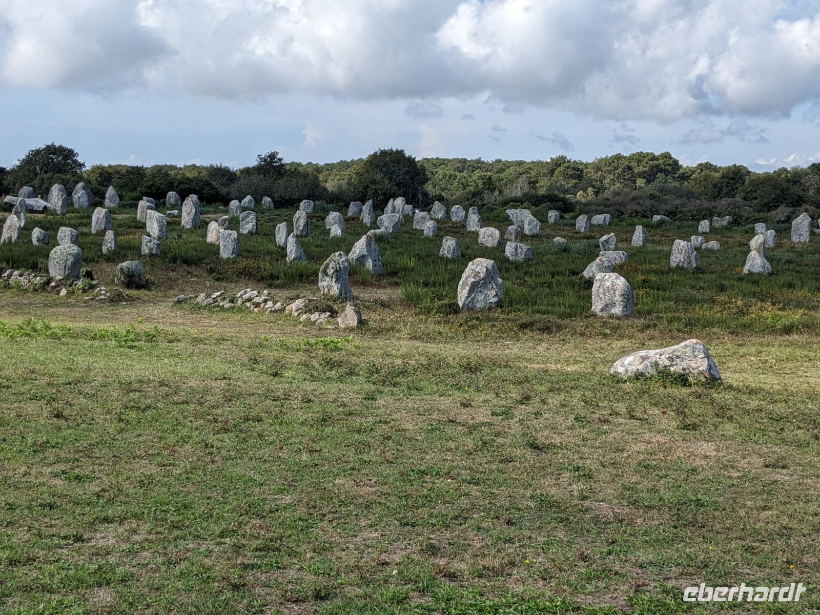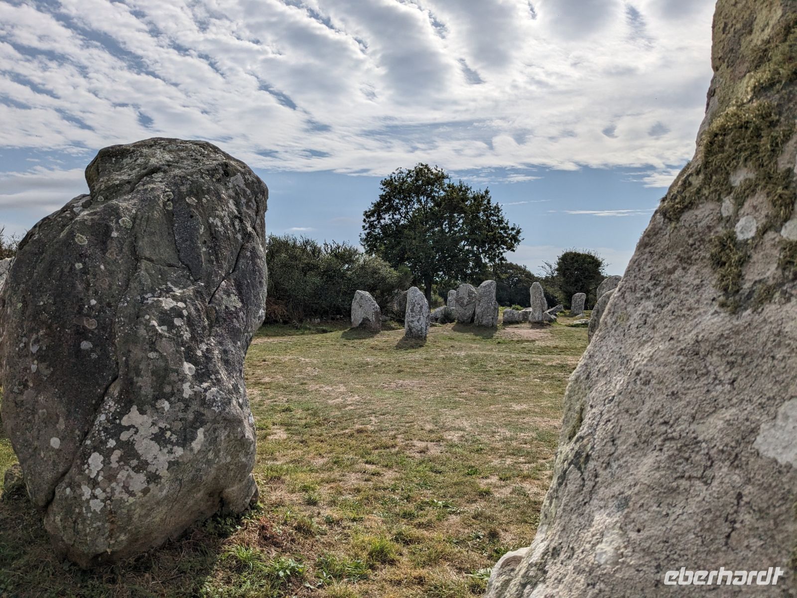 Nach etwas Freizeit, die sich außer der Altstadtbesichtigung auch lohnte, weil die Markthalle offen hatte und die ganze Stadt wegen eines Sportereignisses auf den Beinen war, fuhren weiter in Richtung Golf von Morbihan, in dessen Bereich sich auch das „Gebiet der großen Steine“ befindet. Zeugnisse der Megalithkultur findet man in vielen Ländern Europas, aber nirgends sind sie so eindrucksvoll wie in Großbritannien, Irand und der Bretagne. Hier in der südlichen Bretagne gibt es neben den überall weltweit zu findenden „stehenden Steinen“, den Menhiren, eine ganz besondere Art von Großsteinmonumenten: die Alignements genannten Steinreihen, parallele Setzungen riesiger Steine, oft kilometerlang in mehreren Reihen nebeneinander. Die ersten davon, bestehend aus tonnenschweren Felsbrocken, die immer noch etwas Mystisches ausstrahlen, sahen wir bei einem Fotostopp an den Alignements von Kerzhero, bei denen man noch direkt zwischen den stehenden Kolossen herumlaufen kann.