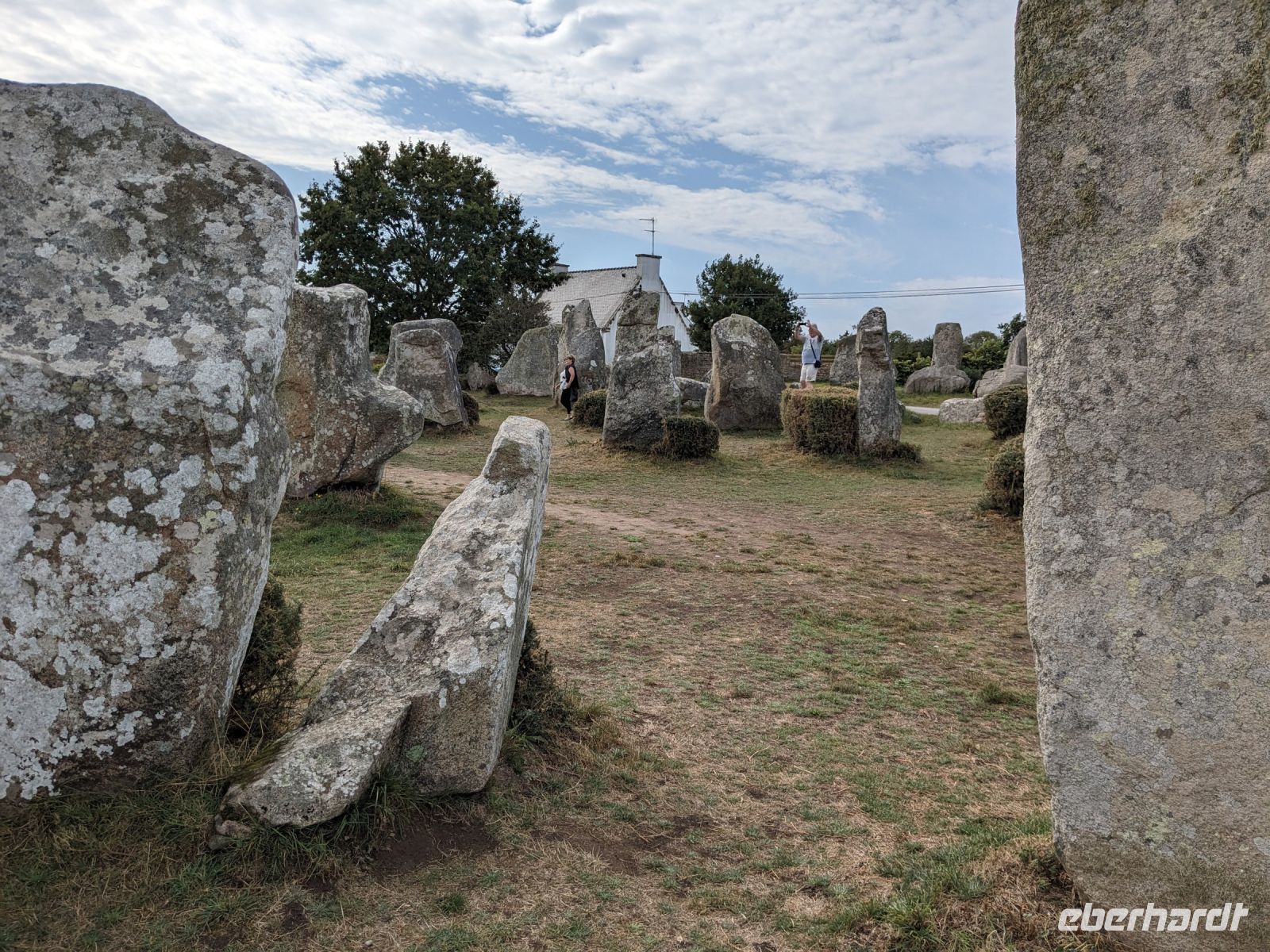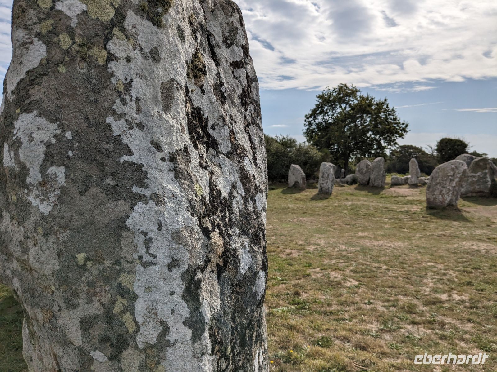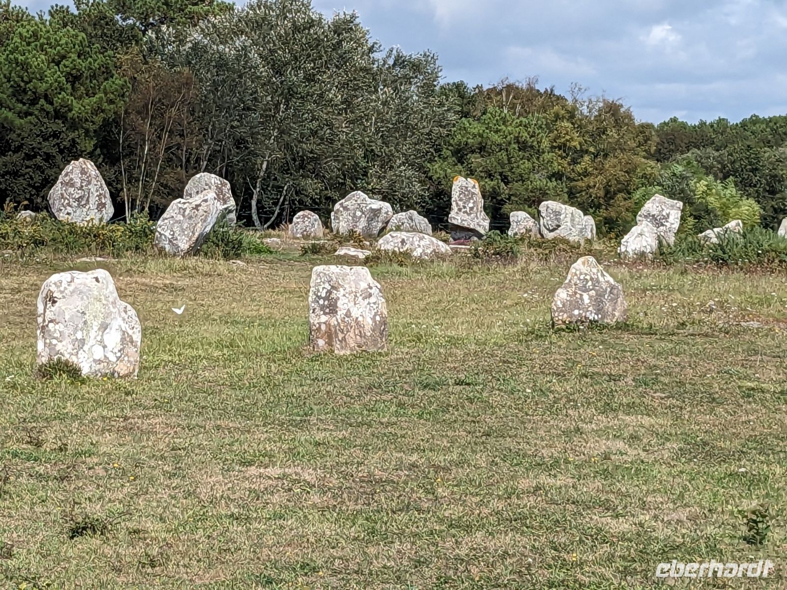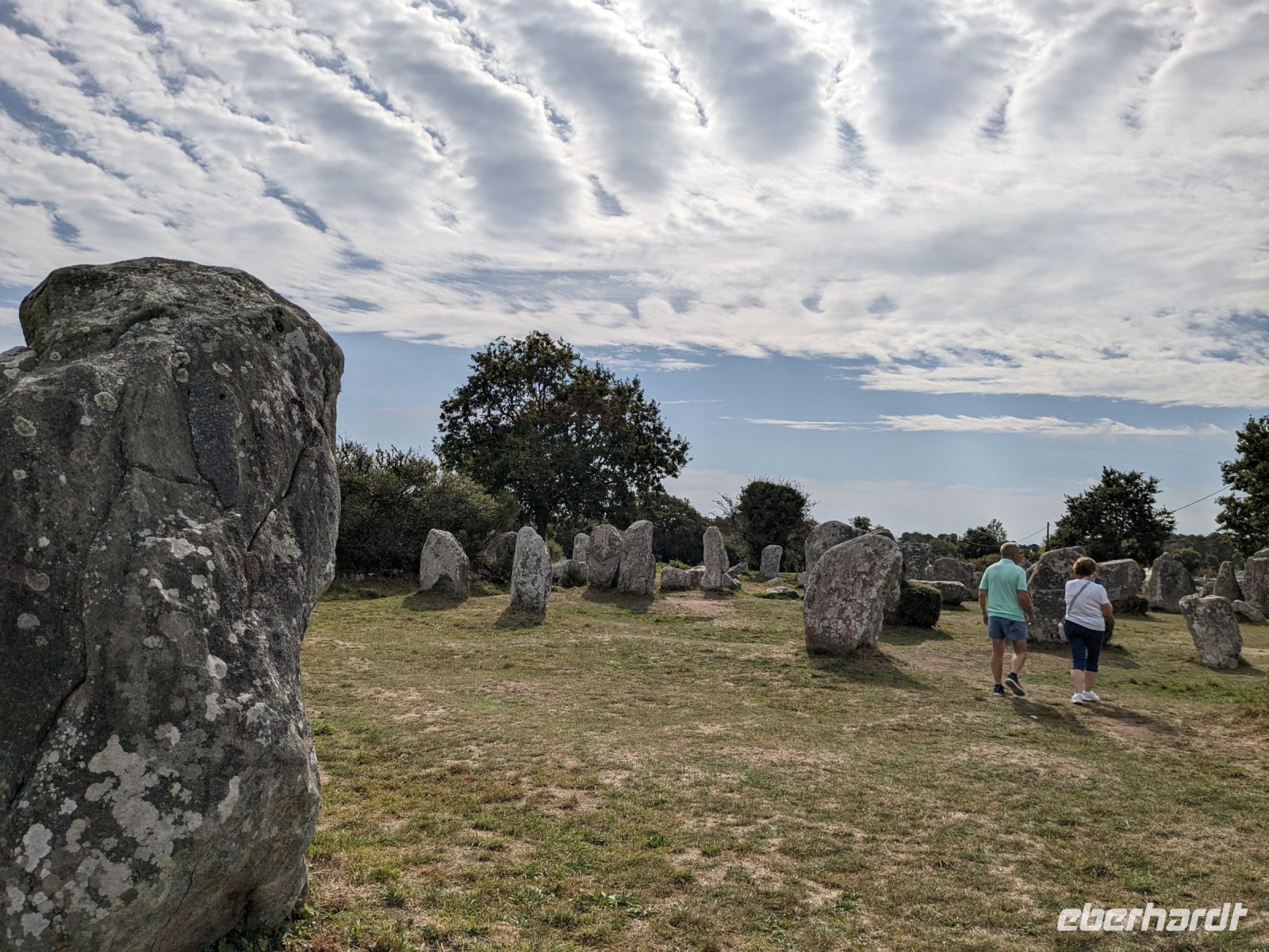 Nach etwas Freizeit, die sich außer der Altstadtbesichtigung auch lohnte, weil die Markthalle offen hatte und die ganze Stadt wegen eines Sportereignisses auf den Beinen war, fuhren weiter in Richtung Golf von Morbihan, in dessen Bereich sich auch das „Gebiet der großen Steine“ befindet. Zeugnisse der Megalithkultur findet man in vielen Ländern Europas, aber nirgends sind sie so eindrucksvoll wie in Großbritannien, Irand und der Bretagne. Hier in der südlichen Bretagne gibt es neben den überall weltweit zu findenden „stehenden Steinen“, den Menhiren, eine ganz besondere Art von Großsteinmonumenten: die Alignements genannten Steinreihen, parallele Setzungen riesiger Steine, oft kilometerlang in mehreren Reihen nebeneinander. Die ersten davon, bestehend aus tonnenschweren Felsbrocken, die immer noch etwas Mystisches ausstrahlen, sahen wir bei einem Fotostopp an den Alignements von Kerzhero, bei denen man noch direkt zwischen den stehenden Kolossen herumlaufen kann.