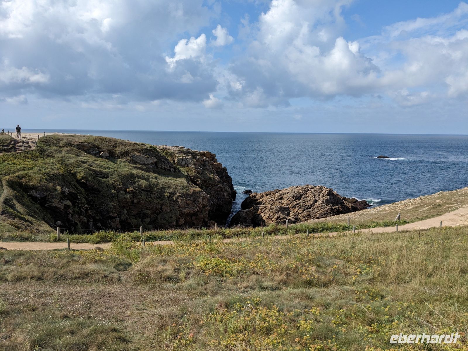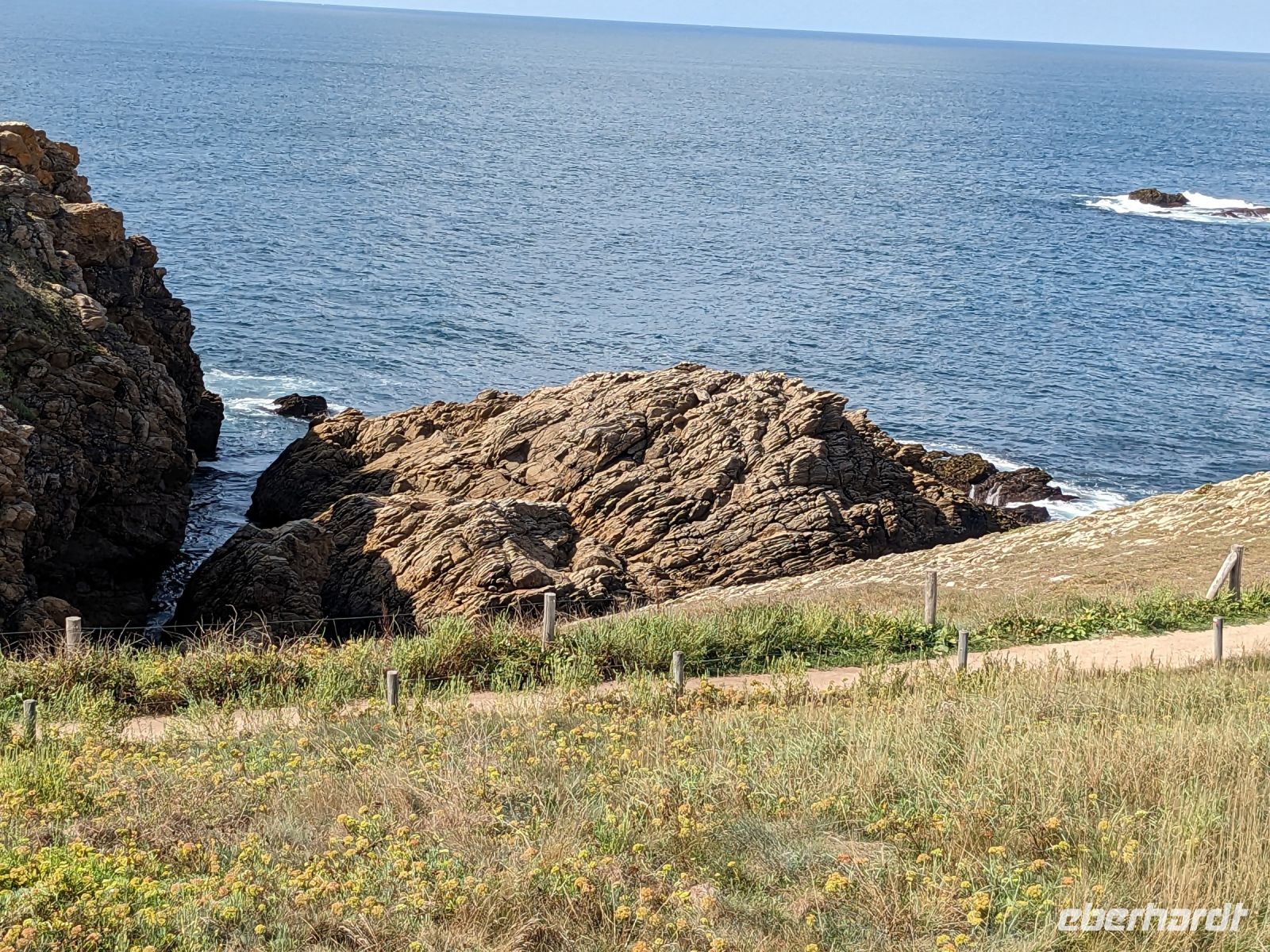 Danach gab es eine kleine Rundfahrt auf der Halbinsel Quiberon, die kurz vor Carnac liegt. , Nur durch eine schmale Sandbank mit dem bretonischen Festland verbunden, zeigt sie wie ein langer Finger nach Süden, an dessen Spitze sich das bekannte Seebad Ouiberon befindet. Wir sahen bei dieser Rundfahrt, bei der wir die Hafen- und Seestadt Quiberon nur streiften, die „cote sauvage“, die sogenannte wilde Küste, eine der schönsten Felsenküsten der Bretagne.