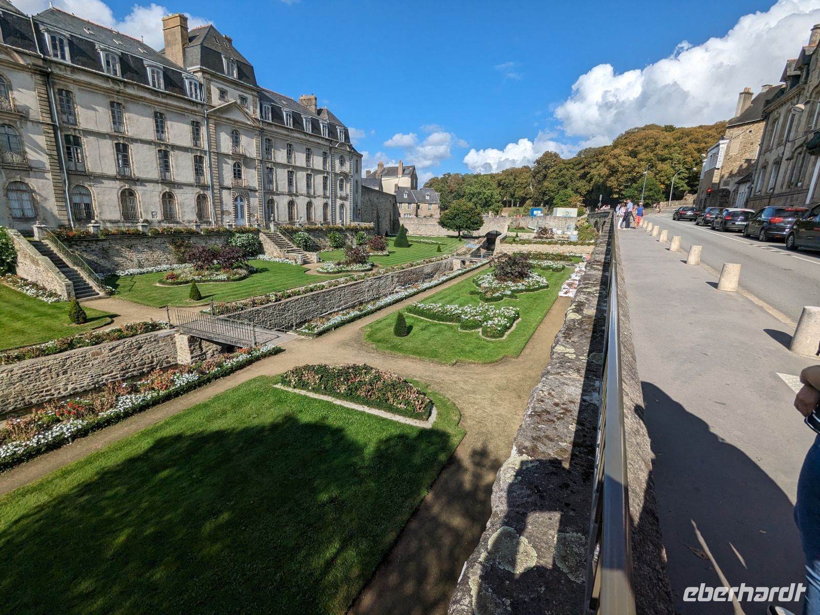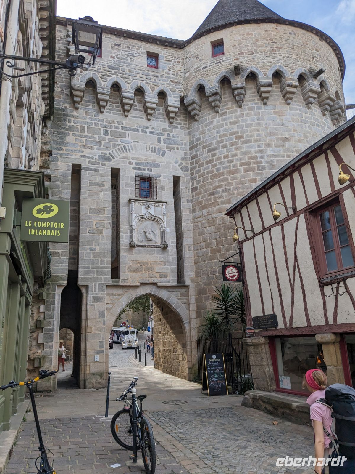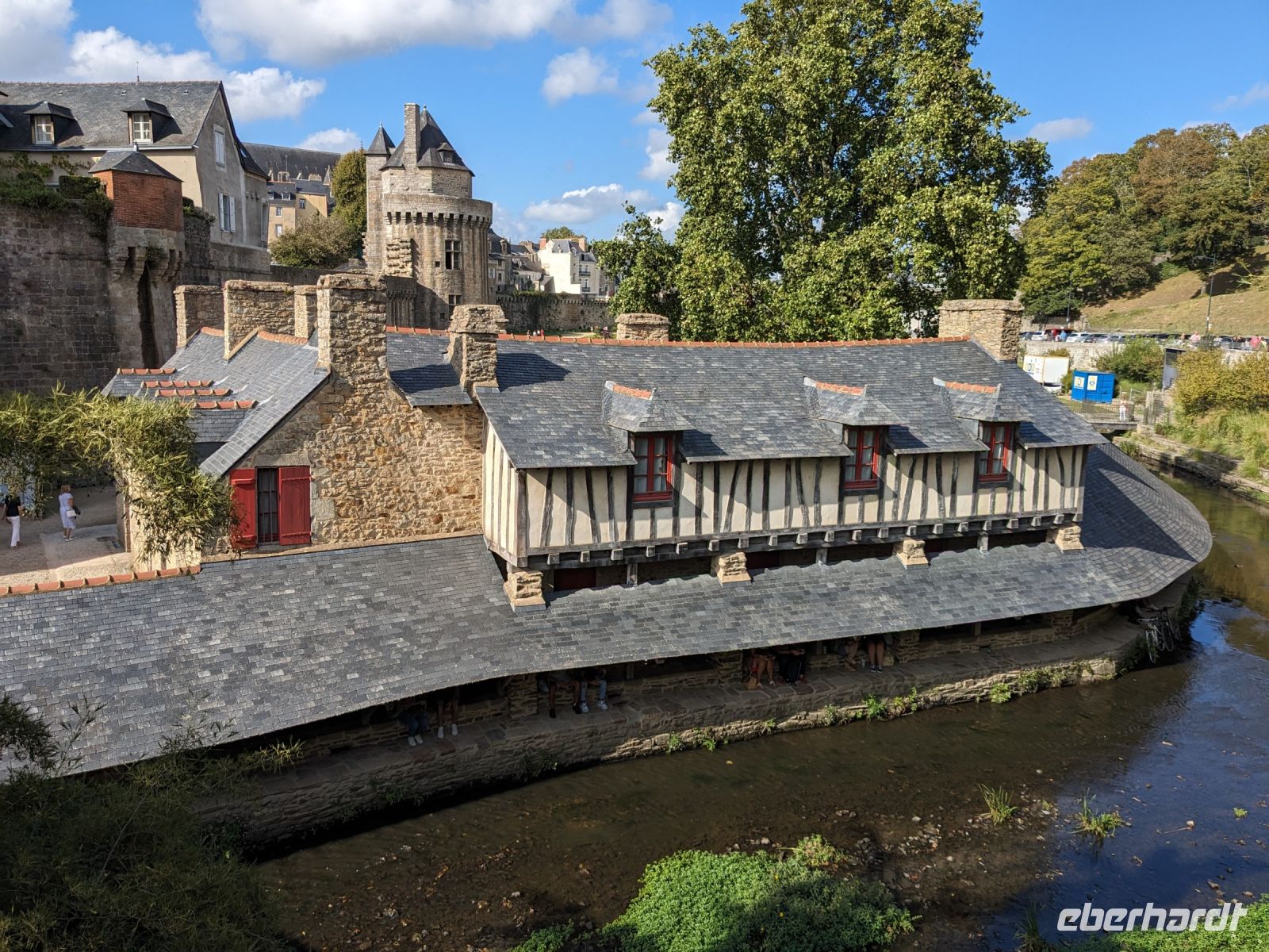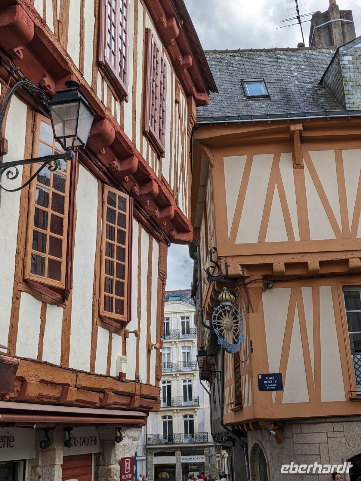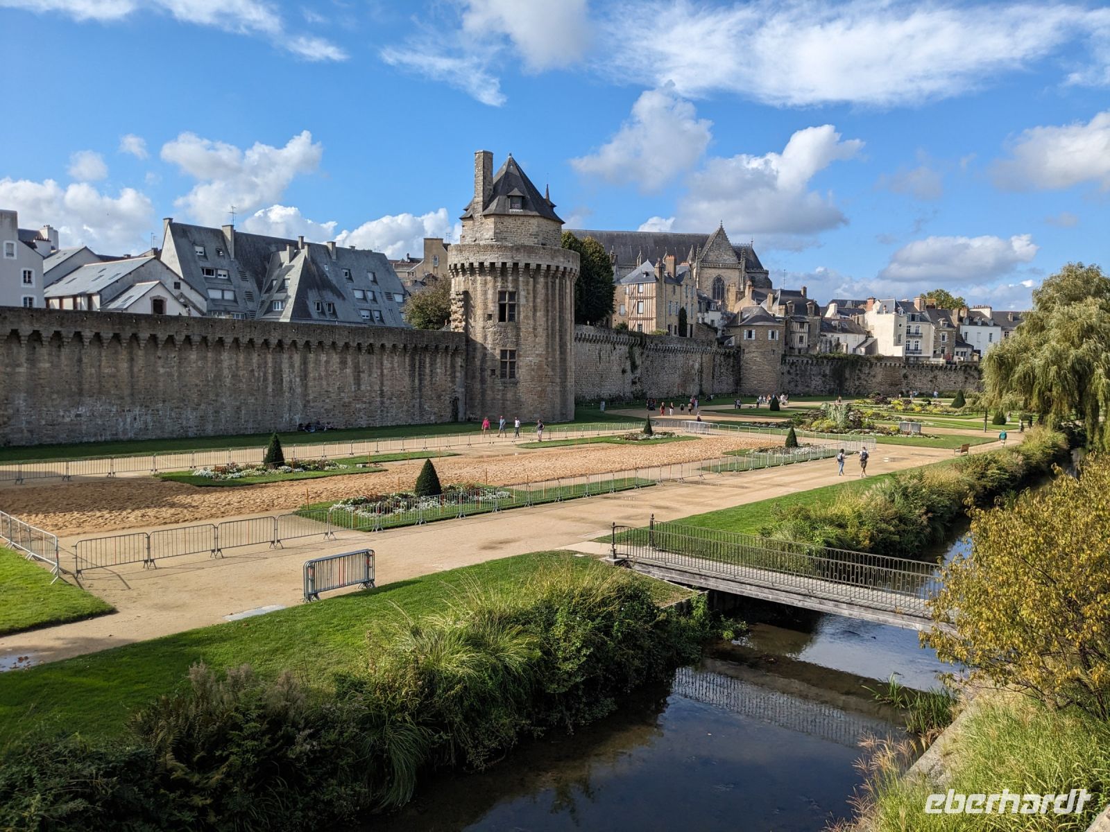 Später fuhren wir zur Übernachtung nach Vannes, aber nicht ohne uns dieses hübsche Städtchen vorher anzuschauen. Vom Hafen aus umrundeten wir, am alten Stadttor St.-Vincent beginnend, die Stadt zur Hälfte am äußeren Mauerring. Zunächst sahen wir das Tor mit dem Wachturm Calmont, dann das Stadtschloss „L’Hermine“ von außen sowie die Grabenanlagen vor der Stadtmauer. Einen wunderschönen gepflegten Garten haben die Bewohner von Vannes aus den Gräben ihrer einstigen Stadtbefestigung gemacht. Prunkstück der besonderen Sehenswürdigkeiten ist neben den alten Befestigungen das berühmte historische Waschhaus. Dann ging es durch das alte Gefängnis-Stadttor ins Innere der Altstadt, wo wir Gelegenheit hatten, uns die Kathedrale St. Pierre im Stil der Spätgotik und der Frührenaissance anzusehen sowie die interessanten alten Fachwerkhäuser und den zentralen, von Fachwerk umstandenen Platz Henri IV.