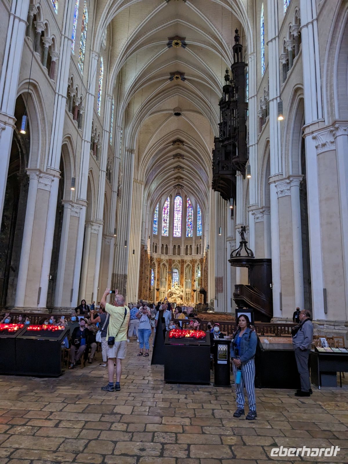 Heute würden wir bereits die erste Etappe der Heimreise antreten. Am späten Vormittasg erreichten wir Angers. Die alte Hauptstadt des Anjou spielt in der französischen Geschichte eine bedeutende Rolle und mit ihr das höchst wehrhaft wirkende Schloss. Man sieht es schon von weitem, stolz über der Maine, die hier kurz vor ihrer Mündung in die Loire ist, erhoben. Das gebürtige Geschlecht der einstigen Herrscher von Anjou, stellten lange Zeit die französischen Könige und wurden auch mit anderen Besitzungen belehnt oder erheirateten sie. Hier im Schloss befindet sich einer der größten Kunstschätze Frankreichs, der als Textilkunstwerk in einer Reihe mit dem „Teppich von Bayeux“ steht und mit der Altstadt von Angers zum UNESCO-Welterbe gehört. Während des hundertjährigen Krieges hatte der Herzog von Anjou einen „köstlichen Bildteppich“ in Auftrag gegeben, gefertigt nach den Illustrationen einer reichbebilderten Ausgabe der „Offenbarungen des Johannes“. Die aus mehreren Teilen bestehenden und von einem berühmten Pariser Gobelin-Künstler gefertigten „Teppiche der Apokalypse“ sind Europas größter gewebter und gewirkter Bildteppich-Zyklus aus dem Mittelalter. Da er bereits um 1382 fertiggestellt wurde ist er zugleich auch das älteste erhaltene Kunstwerk seiner Art in Europa. Zwar sind die Ängste und der Aberglauben der mittelalterlichen Menschen vor den Schrecken eines Weltunterganges, den der Evangelist Johannes in seinem Spätwerk schilderte, sind das Bildmotiv, aber vermutlich drücken sich hier aber wohl auch die Situation zur Zeit der Entstehung und die Schrecken des nicht enden wollenden „hundertjährigen“ Krieges aus. Die Freizeit in Angers reichte aus, um auch noch einen Blick in die Altstadt des historischen Ortes zu werfen. . Später ging es wieder auf die Autobahn, aber vor der letzten Übernachtung im Raum Paris war noch Zeit für einen weiteren Stopp, da wir dicht an der berühmten Kathedrale von Chartres vorbeifuhren. Wir besuchten – nach ehrfürchtigem Staunen vor ihrer eindrucksvollen Westfassade mit dem berühmten Königsportal – eines der vielleicht bekanntesten gotischen Sakralbauwerke weltweit. Seit langem steht diese Kathedrale, für deren Fenster die Glaskünstler der Legende nach extra ein besonderes, nur hier zu findendes geheimnisvolles Blau geschaffen haben, als UNESCO-Weltkulturerbe unter besonderem Schutz. Da die Figuren ihres sogenannten Königsportals, gefertigt zwischen 1145 und 1150 den Brand der ersten gotischen Kathedrale überlebt haben, gelten diese Statuen damit als die ältesten erhaltenen gotischen Skulpturen der Kunstgeschichte! Im Inneren konnten wir die Raumwirkung, die herrlichen Glasfenster und die strahlende Fensterrose der Fassade bewundern. Das berühmte Labyrinth von Chartres im Fußboden der halbdunklen Kirche, das allein alljährlich viele Pilger anzieht und das man zu den Mythen von Chartres zählt, war leider von der Bestuhlung verdeckt. Es blieb noch Zeit für einen raschen kleinen Altstadtbummel, bevor uns der Bus zum letzten Übernachtungsort unserer Reise, brachte, ins südöstlich von Paris gelegene Ferrières-en-Brie.