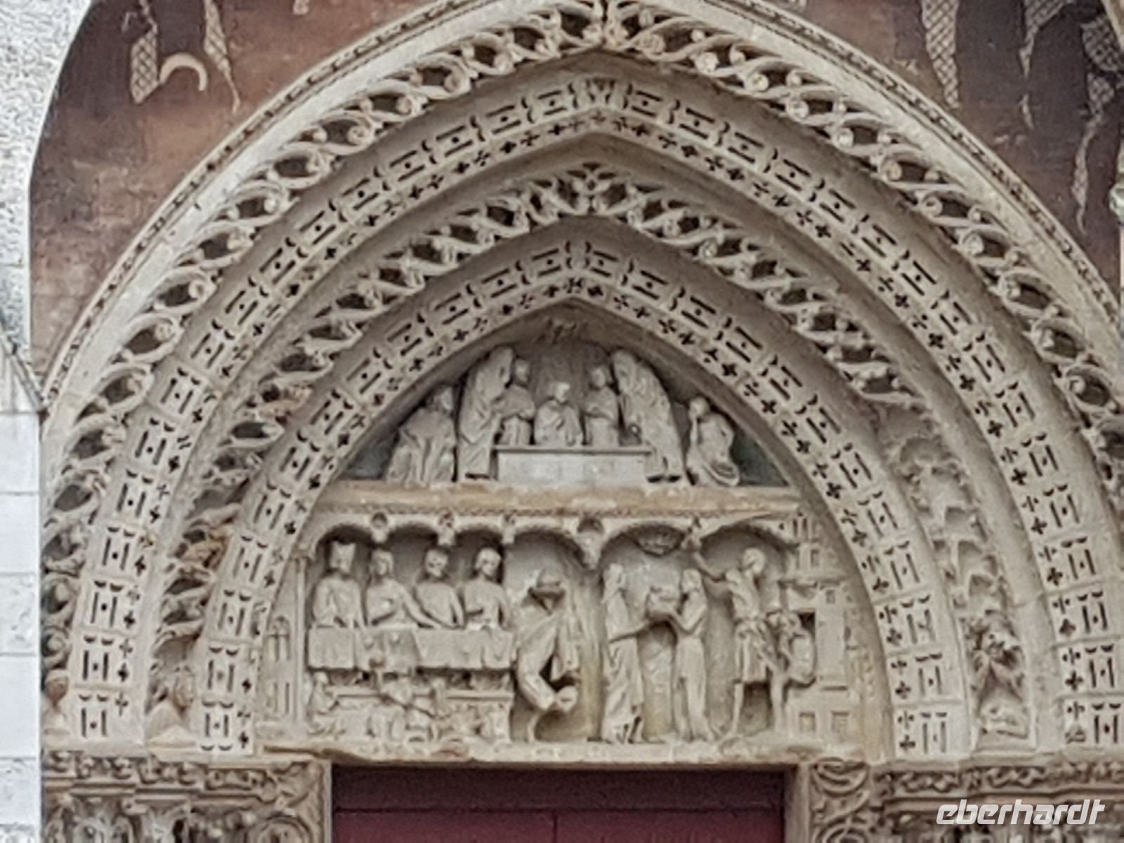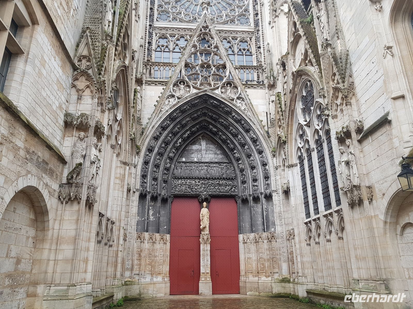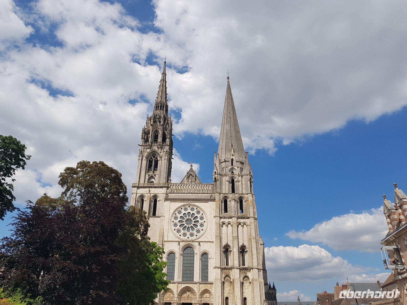 Nach der Mittagspause in Angers ging es weiter nach Norden, wo noch eine bedeutende Sehenswürdigkeit erwartete. Südlich von Paris bogen wir ab nach Chartres und besichtigten dort die weltberühmte Kathedrale. Abgesehen von ihrem Nordturm ist sie seit ihrer Errichtung vollkommen erhalten geblieben. Sie wurde nach dem Brand ihres Vorgängerbaus in sage und schreibe 26 Jahren errichtet und verfügt über den größten und ältesten Bestand an mittelalterlicher Glasmalerei in Frankreich. Architektonisch nimmt sie eine Schlüsselstellung unter den Kathedralen Frankreichs ein und ist seit 1979 UNESCO Weltkulturerbe. Darüber hinaus zeigt ihre Westportal die ältesten Zeugnisse der mittelalterlichen Bauplastik.