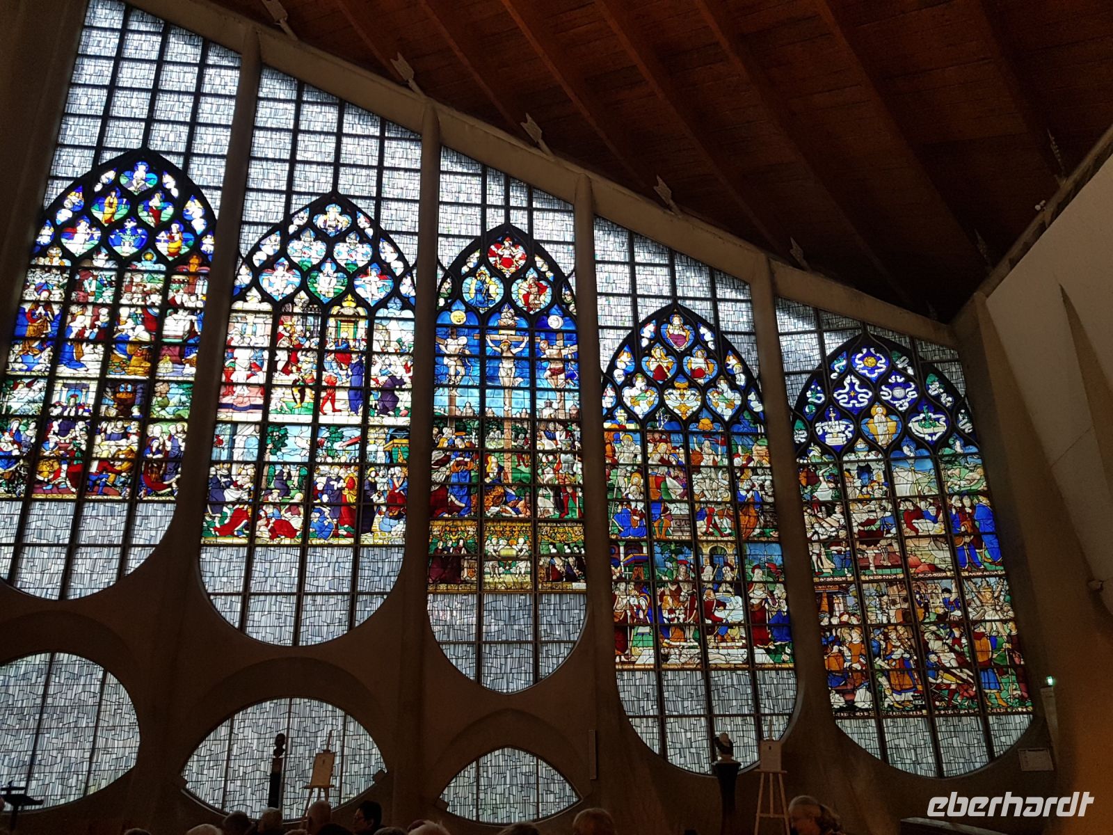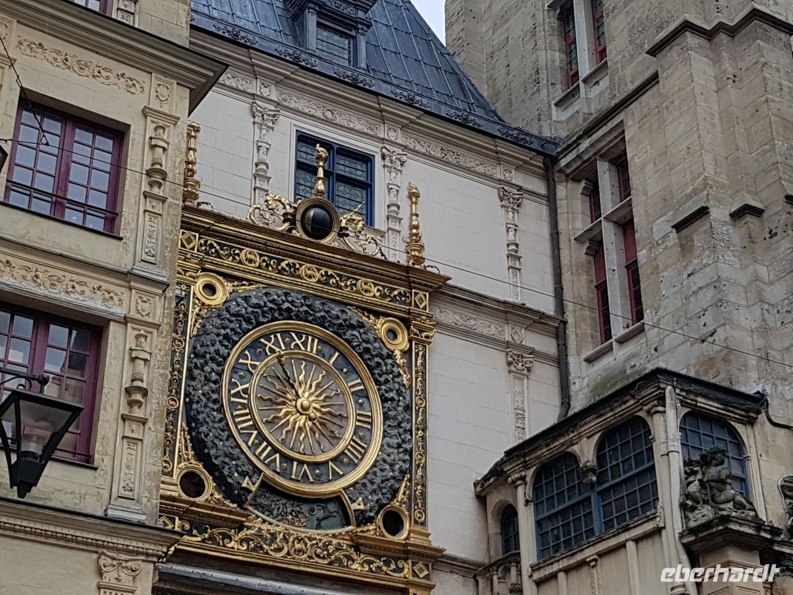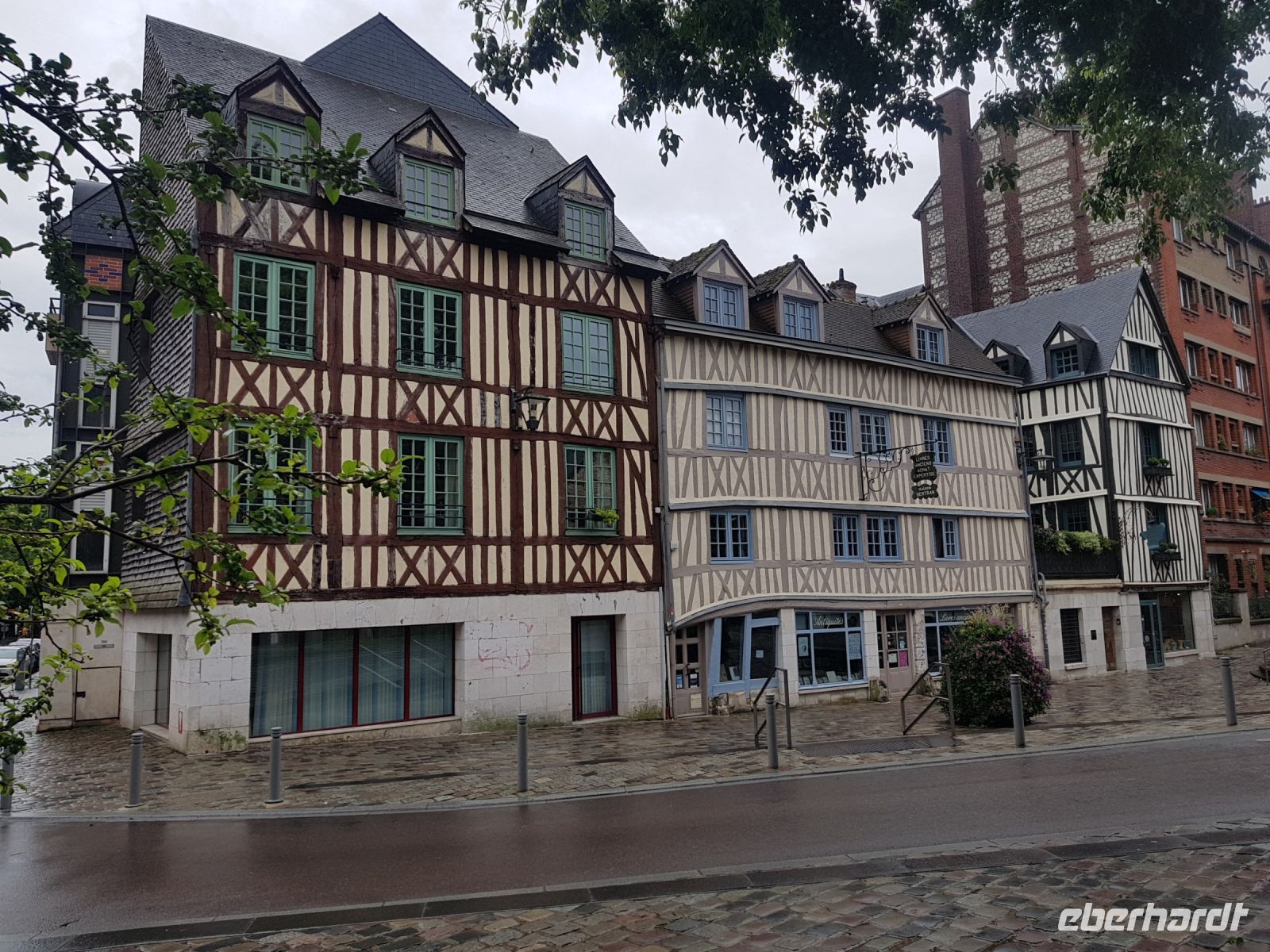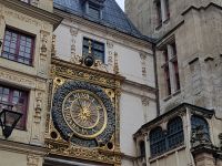 Gespannt auf Normandie fuhren wir nach dem Frühstück und der Einladung unserer Koffer nach Rouen. Unsere Entdeckung von Normandie begann mit einer Stadtführung in Rouen durch die örtliche Führerin Madame Françoise Marchand. Sie brachte uns nahe, was die Normandie von Frankreich unterscheidet und zeigte uns die Kathedrale, die Gräber von den frühen Herzogen der Normandie, den alten Pestfriedhof, die Altstadt mit ihren hoch aufragenden Fachwerkbauten und die astronomische Uhr. Am Alten Markt erzählte sie uns die Geschichte von Jeanne d'Arc, deren Leben am 30. Mai 1431 hier auf dem Scheiterhaufen auf grausame Art endete. An ihren Tod erinnert das 20 m hohe Kreuz und die 1979 erbaute, ihr gewidmete Kirche, die Eglise Jeanne'Arc. Hier hinein flüchteten wir vor dem plötzlichen, starken Regen und lauschten Madame Marchand, die über die Kirche und ihre wunderschönen Glasfenster aus der 1944 zerstörten Kirche St. Vincent sprach. Nach einer kleinen Pause gingen wir wieder zum Bus, der uns nun an die Normannische Küste bringen sollte.