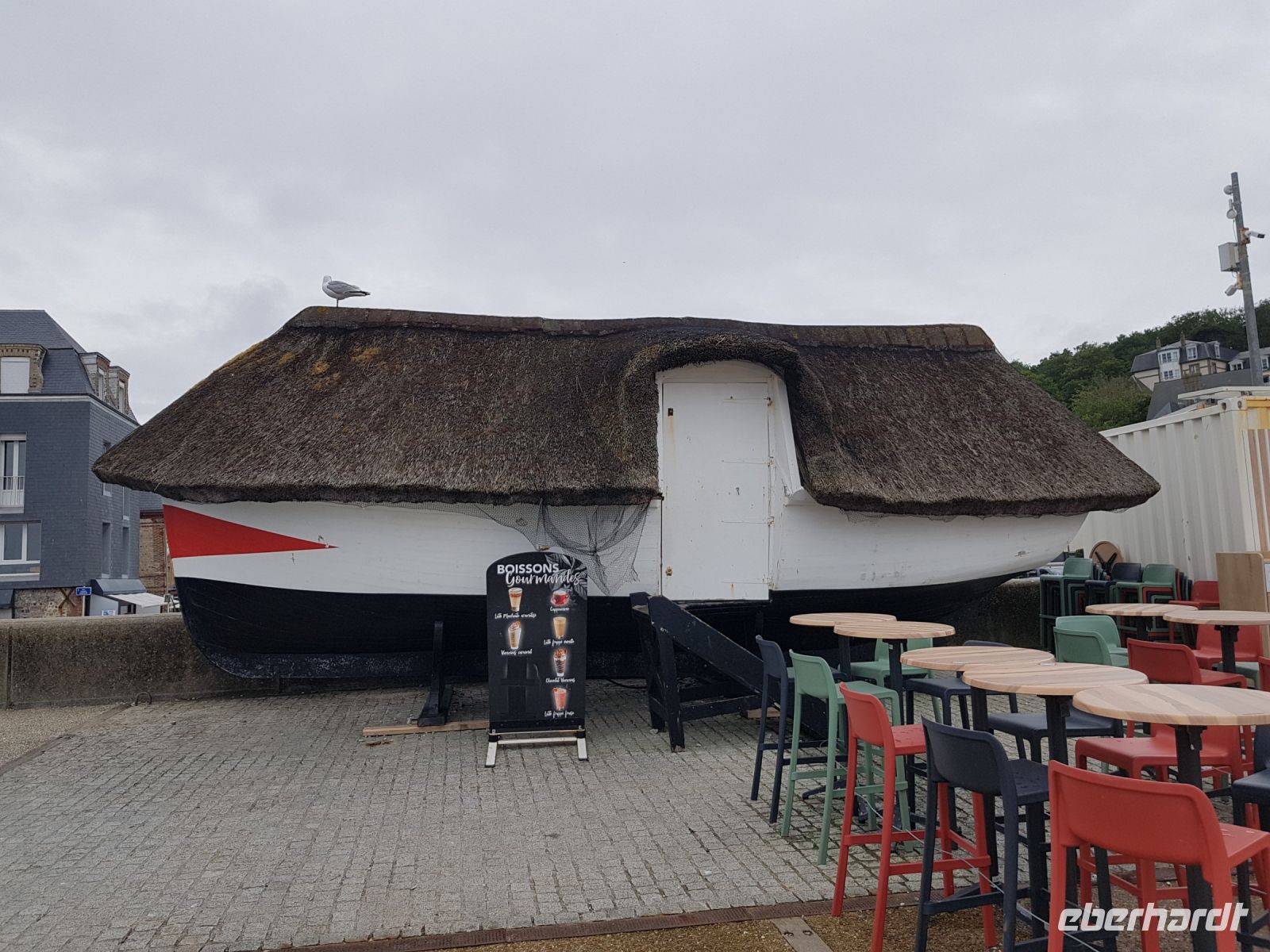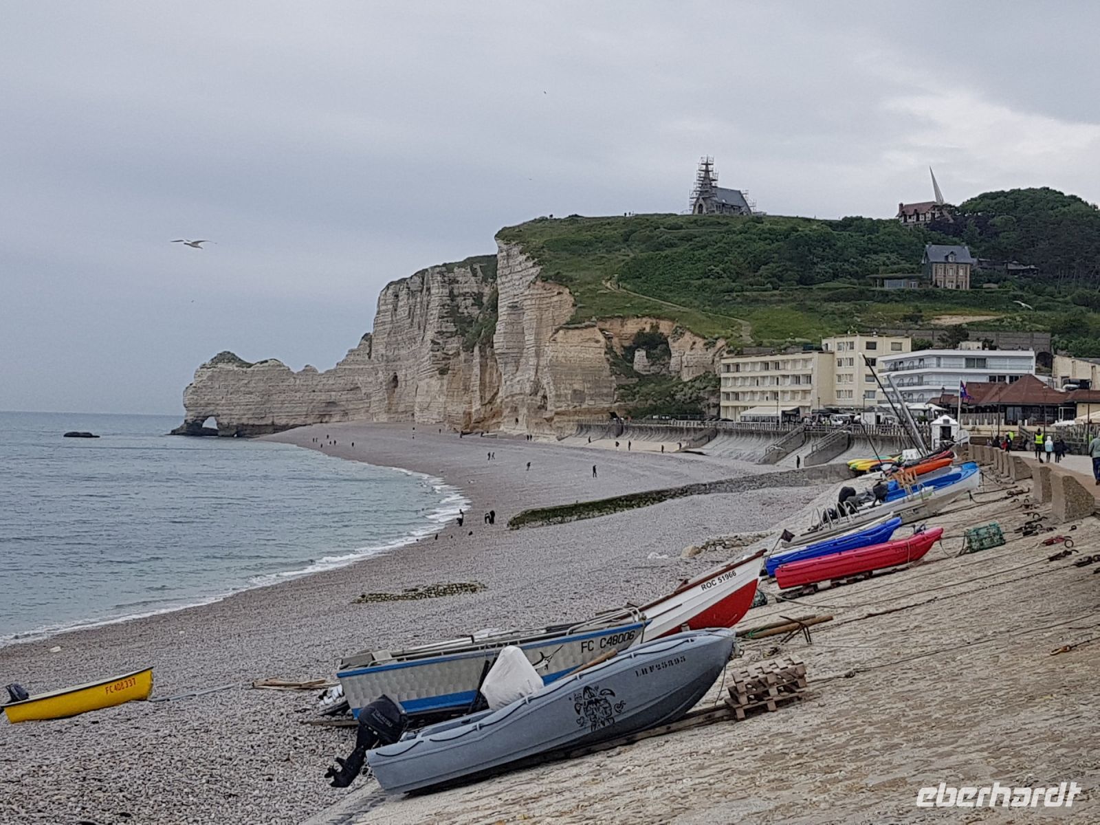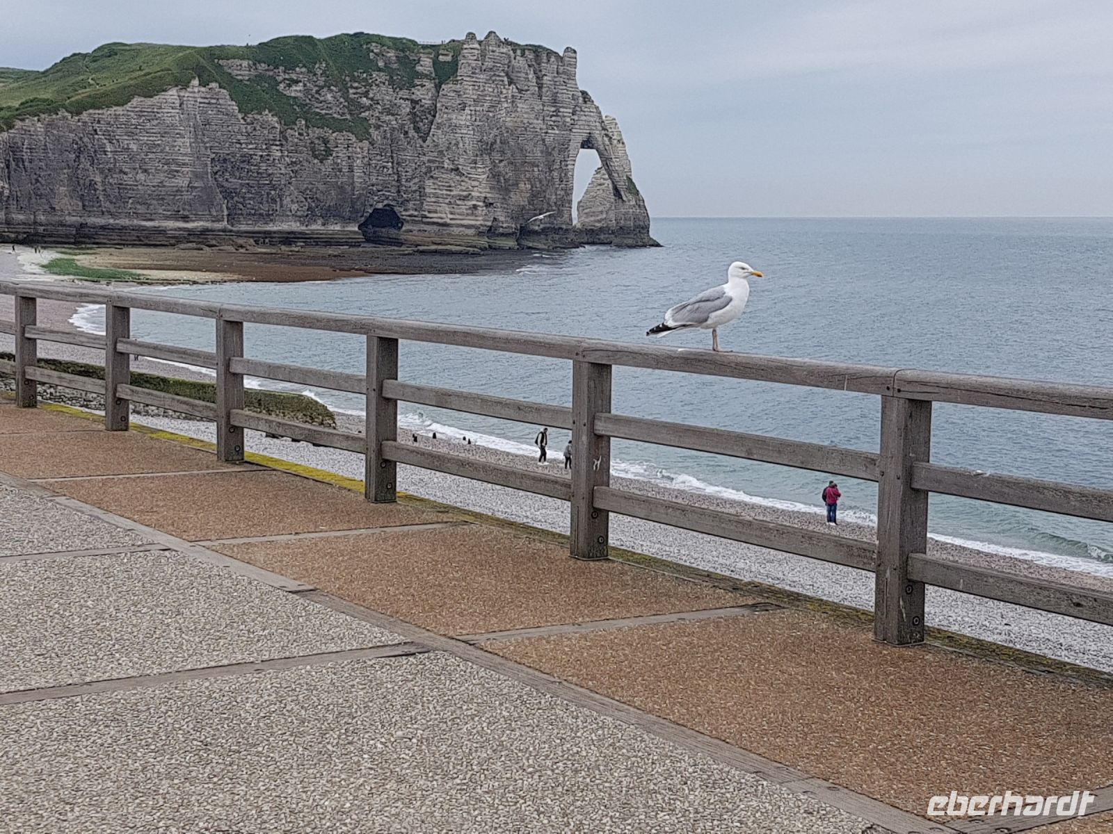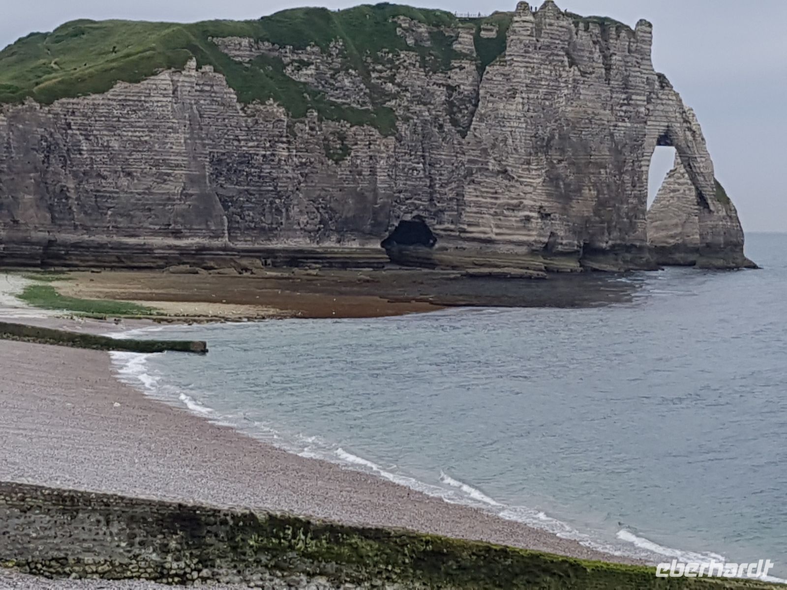In Étretat an der Cote d'Abattre, der Kreideküste der Normandie, hatte sich der Regen inzwischen verflüchtigt, so dass einige von uns mit großen Vergnügen die Kreideküste erwandern konnten, während andere die Strandpromenade bevorzugten oder in einem der Restaurants einkehrten. Diese imposante Küste, eingerahmt von der hellen Felswand der „Falais d'Aval“ links und der Steilküste der „Falaise d'Amont“ rechts, beeindruckt bei jedem Wetter, so auch bei tiefhängenden Wolken wie heute.