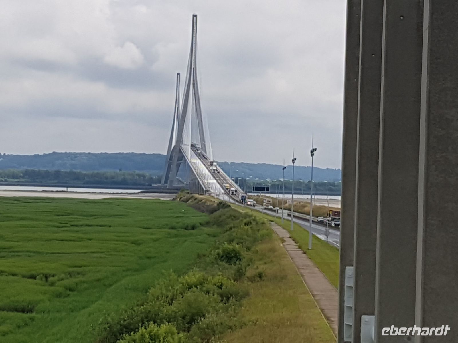 Im Laufe des Nachmittags setzten wir unsere Reise durch die Normandie fort, erreichten die Seine und mit ihr die 1994 eingeweihte „Pont du Normandie“. Sie ist insgesamt 2,241 Meter lang und war im Jahr ihrer Einweihung mit einer Hauptspannweite von 854 Meter die größte Schrägseilbrücke der Welt. Wir hielten an der Brücke und besichtigten sie von der über der Mautstelle eingerichteten Besucherbrücke. Welch ein Blick war das zur ca. 10 km langen Mündung der Seine über die weite Wiesenlandschaft hinweg ! Wie wunderbar leicht wirkte die „Pont de Normandie“, wenn man sie aus dieser Perspektive betrachtet ! Dann fuhren wir gespannt über die Brücke und erreichten einige Minuten später das alte Hafenstädtchen Honfleur.