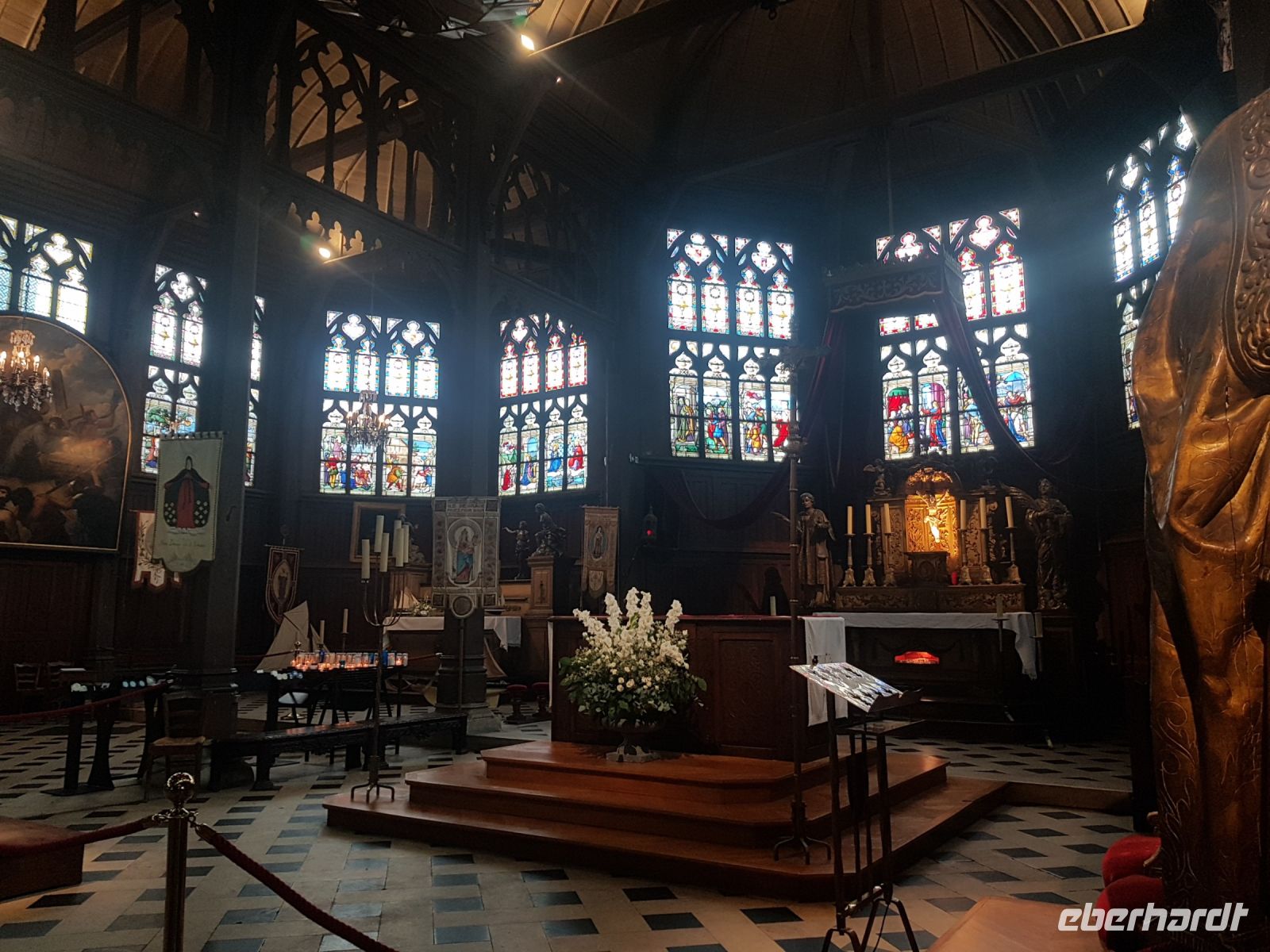 Hier legten viele Jahrhunderte lang die Handelsschiffe ab, um die Küsten Kanadas und Brasiliens anzusteuern. Auch der Seefahrer Samuel de Champlain stach von diesem Hafen aus in See bevor er 1608 am Sankt-Lorenz-Strom die erste Siedlung der späteren kanadischen Stadt Québec gründete. Im 19. Jahrhundert entdeckte eine jung Malergeneration aus Paris das malerische Städtchen, die hier eine neue Art der Malerei einwickelte. Sie sollte später unter dem Namen „Impressionismus“ weltbekannt werden. Um die Wende des 19. zum 20. Jahrhundert war es umgekehrt ein Sohn Honfleurs, nämlich Eric Satie, der als genialer Musiker und Komponist das Pariser Musikleben stark prägen sollte. Wir gingen zusammen zum Alten Hafen und besichtigten später die von Schiffszimmermeistern vollkommen aus Holz errichtete Kirche Ste Catherine. Dann blieb noch etwas Freizeit, in der wir die idyllische Stimmung in dem malerischen Städtchen genossen.