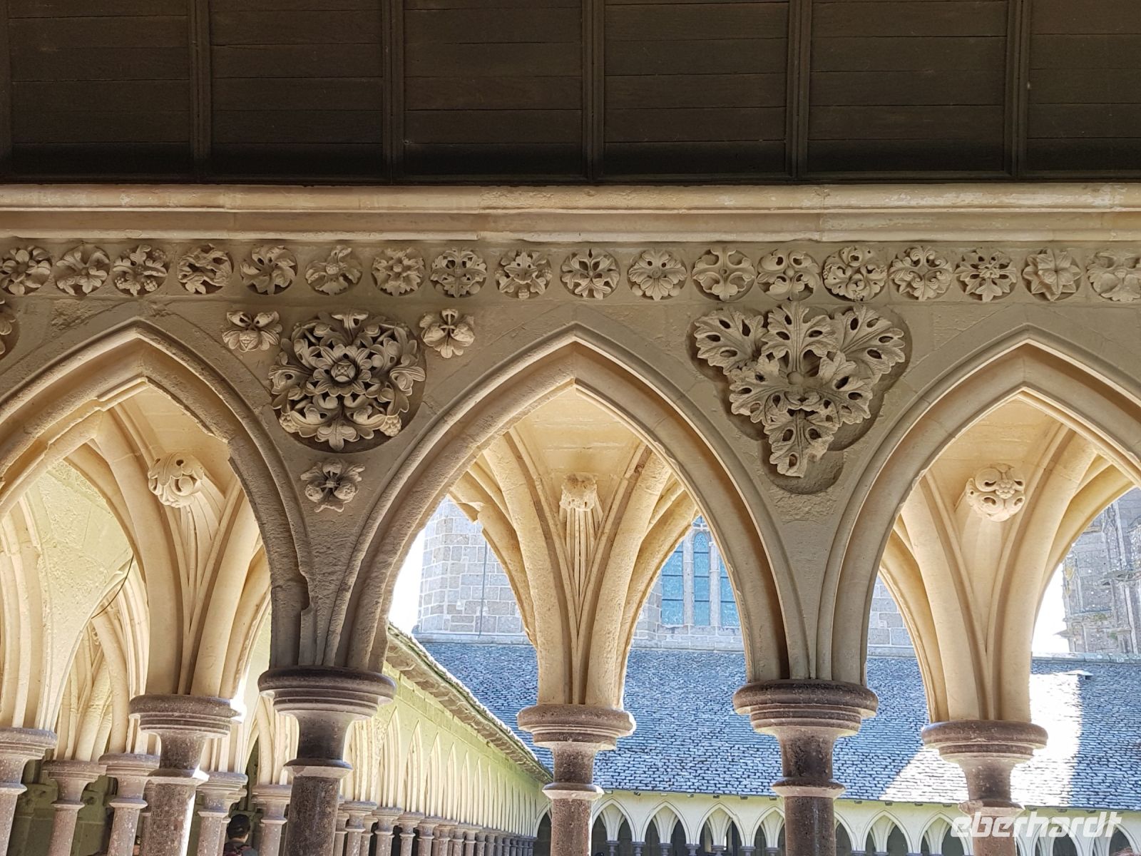 Leider wurde unser Besuch jedoch durch die schlechte Organisation der Shuttles, die vom Besucherzentrum zum Mont-Saint-Michel fahren, lange verzögert. Trotzdem die Shuttles nur halb besetzt waren, durfte unsere Gruppe nicht einsteigen. Zudem mussten wir, obwohl wir eine Reservierung hatten, den Schulklassen dort den Vortritt lassen. Nachdem wir endlich in einem mit Schulklassen überfüllten Shuttle am Mont-Saint-Michel ankamen, gingen wir gemeinsam hinauf zur Abtei. Nach einem weiteren umständlichen Prozedere am Eingang der Abtei, konnten wir mit den Tablets, die wir für unseren Besuch bekamen, unseren Rundgang durch die Abtei beginnen. Raum für Raum erschlossen wir uns das legendäre Kloster, in dem der Normannenherzog Richard II. Judith de Bretagne heiratete und das von französischen Königen und Pilger aus ganz Europa aufsucht wurde. Da es im 100jährigen Krieg den Engländern nie gelang sie zu erobern, hatte sie seitdem für Frankreich eine enorm hohe Bedeutung.