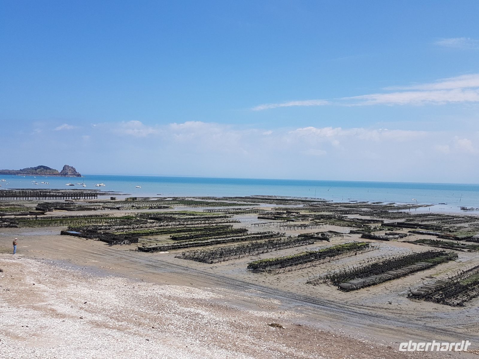 Voll von Eindrücken vom Mont-Saint-Michel fuhren wir am Nachmittag wieder zurück in die Bretagne, wo wir die Austernhauptstadt der Nordbretagne Cancale erreichten. Hier konnten wir einen riesigen Austernpark überblicken, der bei Ebbe gerade gut zu sehen war. Wir sahen die Tische mit den darauf liegenden Säcken voller Austern, die hier wunderbar im Wechsel der Gezeiten gedeihen. Von der Qualität der hiesigen Austern konnten wir uns gleich bei einer Austerverkostung erfreuen. Unmittelbar am Meer probierten verschiedene Austernarten wie Huitre creuse (Pazifische Felsenauster) oder Huitre plat (Europäische Auster), die wir von an den Ständen der Austernverkäufer erwarben. Mit Baguette, einem guten Wein und, wer wollte, einigen Zitronen probierten wir die frischesten Austern, die man bekommen kann, da sie erst vor Kurzem von den Austernfischern geliefert wurden. Für einige unter uns waren die Austern eine Entdeckung, für andere, die bereits zu den Kennern zählten, ein wahrer Genuss.