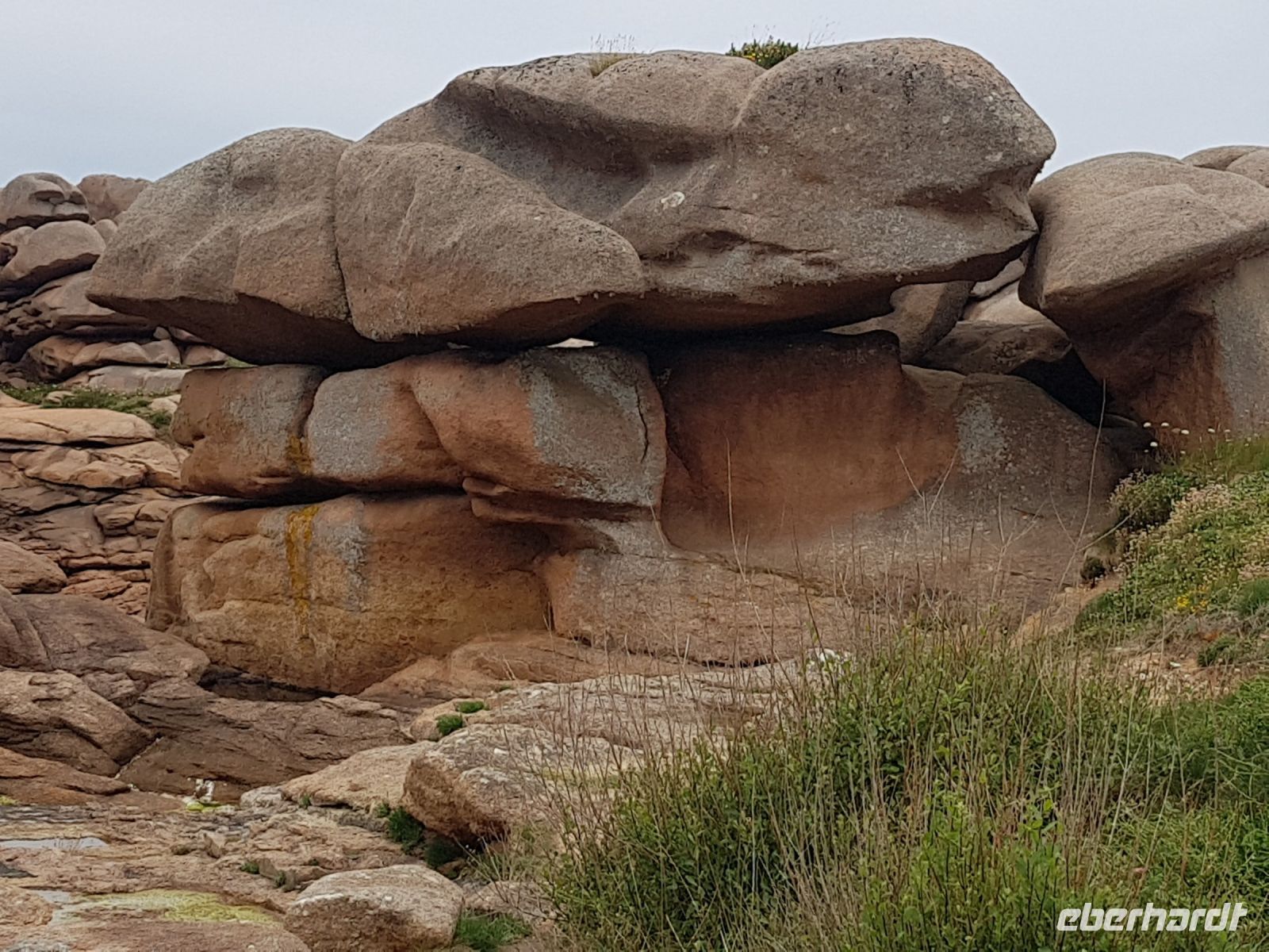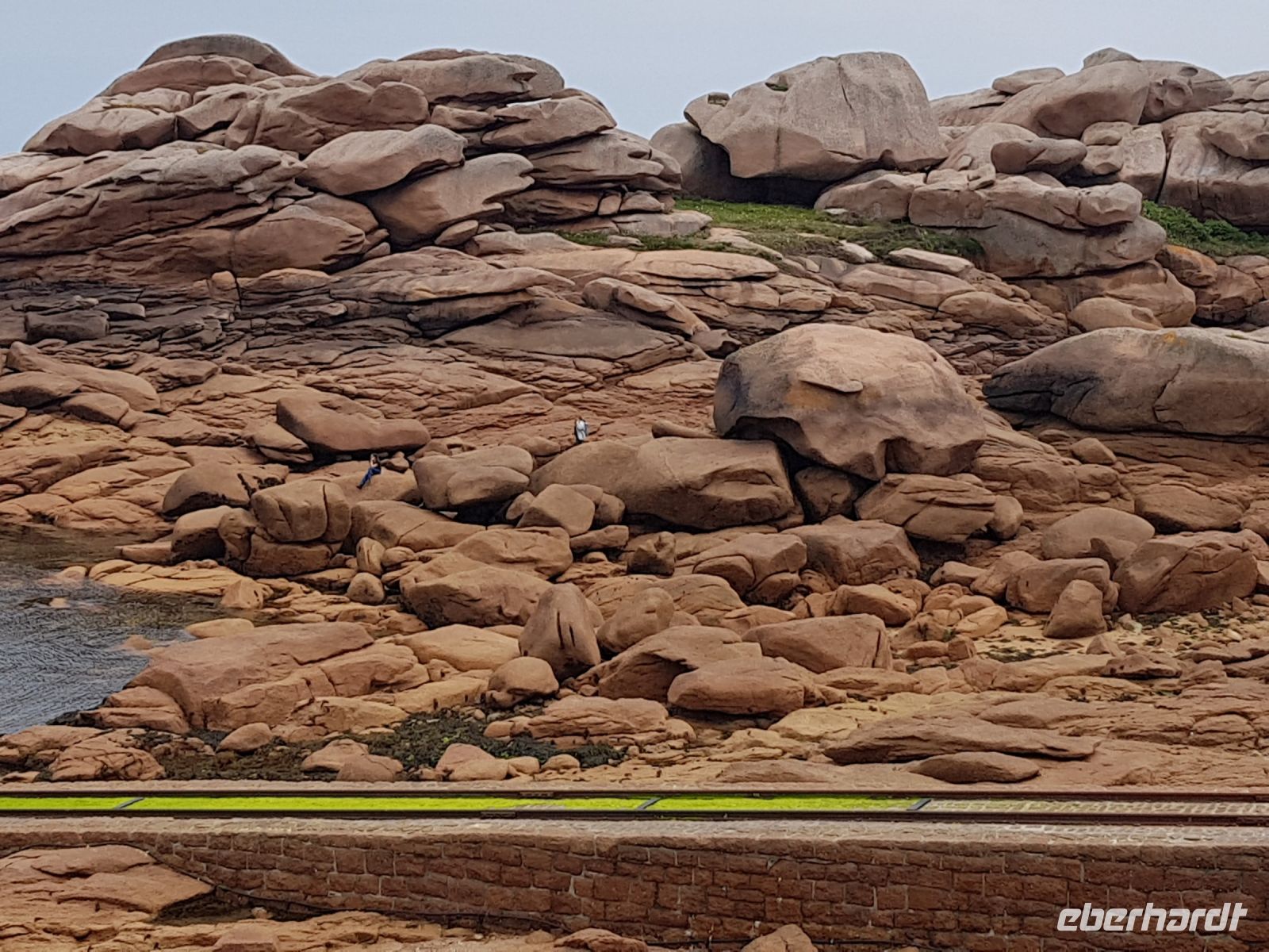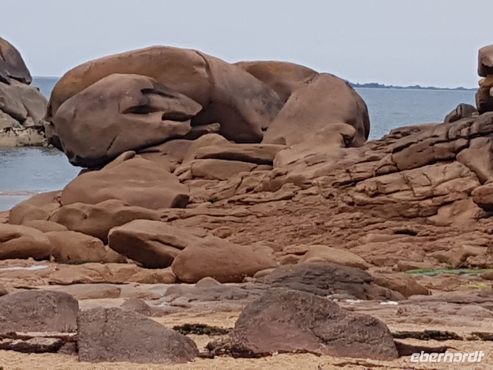 Anschließend nahmen wir Kurs auf die nächste bretonische Küste. Es sollte nun die Côte de Granit Rose, die rosafarbene Granitküste, sein. Hier angekommen, machten wir zuerst unsere Mittagspause, wobei einige Gäste von uns unser „Bordmenü“ nutzten, während andere im Ort einkehrten. Dann wanderten wir entlang des alten Zöllnerpfades an bizarren Granitfelsen entlang, entdeckten hier einen schlafenden Hasen, dort ein schlangenhaftes Untier, ganz nach Belieben unserer Fantasie.