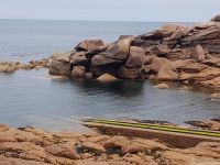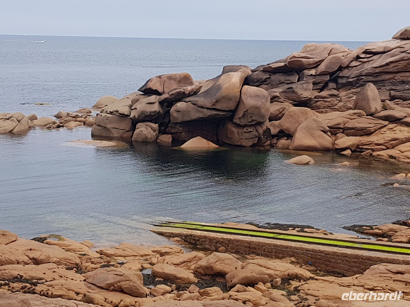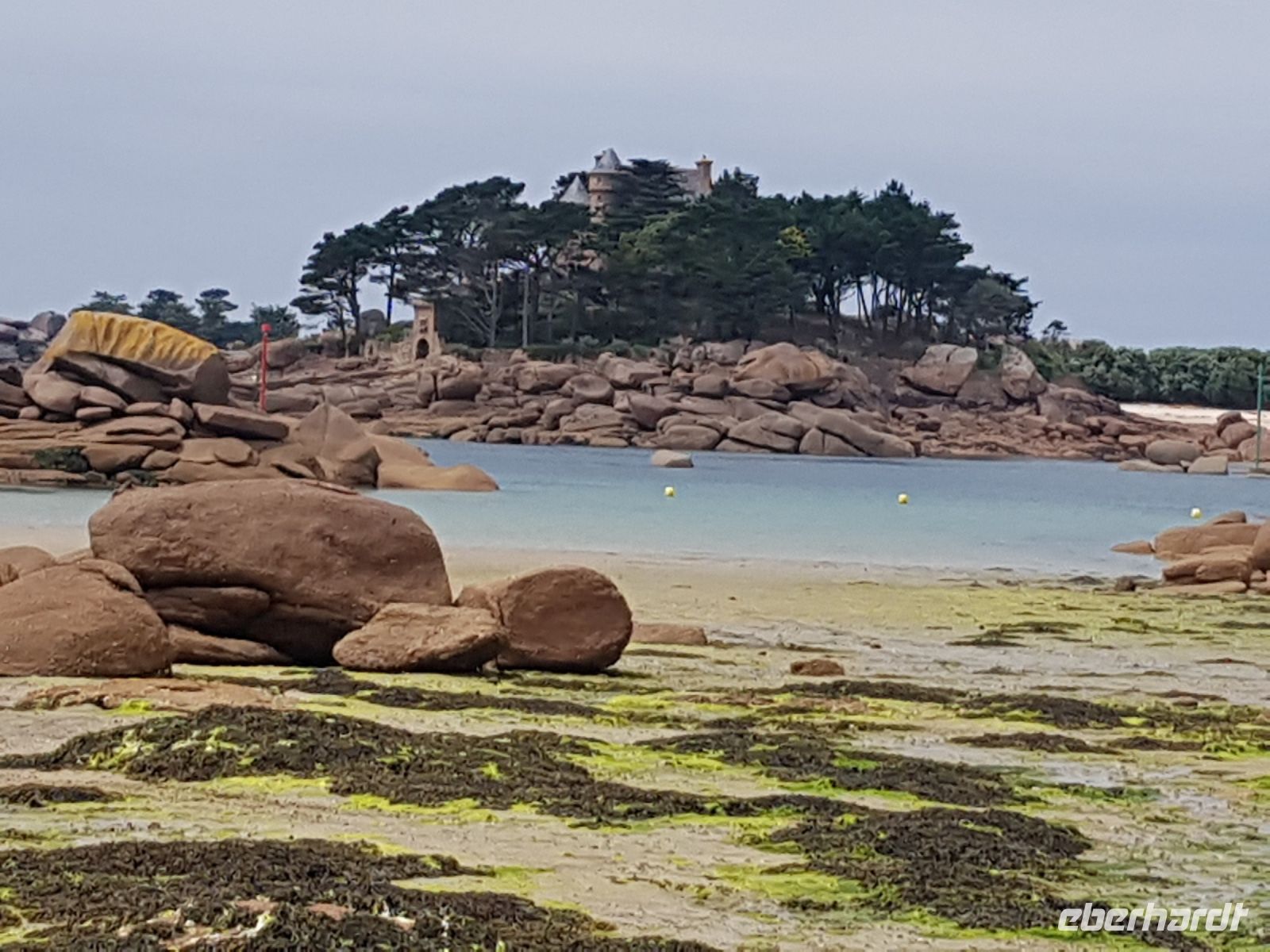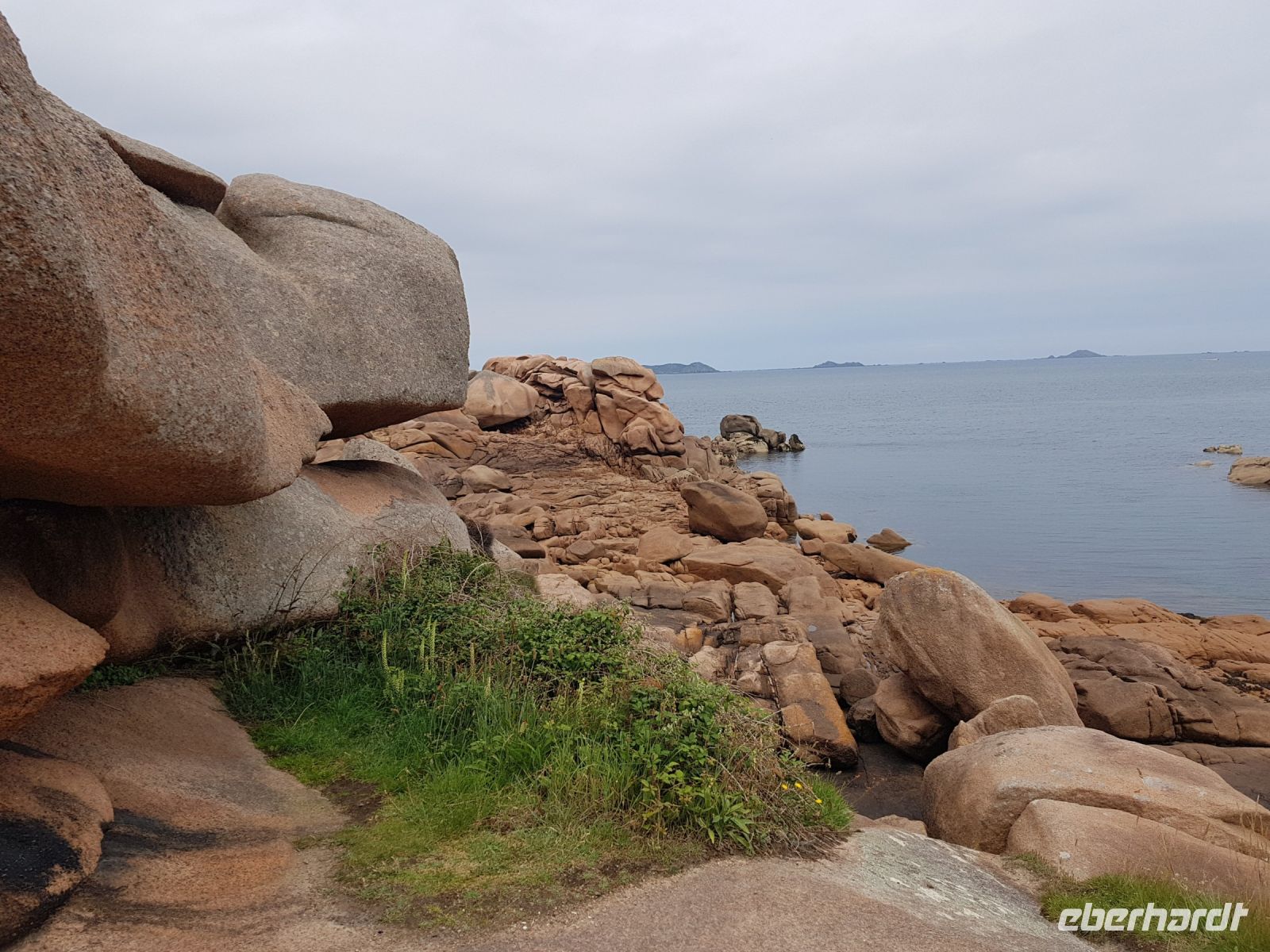 Anschließend nahmen wir Kurs auf die nächste bretonische Küste. Es sollte nun die Côte de Granit Rose, die rosafarbene Granitküste, sein. Hier angekommen, machten wir zuerst unsere Mittagspause, wobei einige Gäste von uns unser „Bordmenü“ nutzten, während andere im Ort einkehrten. Dann wanderten wir entlang des alten Zöllnerpfades an bizarren Granitfelsen entlang, entdeckten hier einen schlafenden Hasen, dort ein schlangenhaftes Untier, ganz nach Belieben unserer Fantasie.