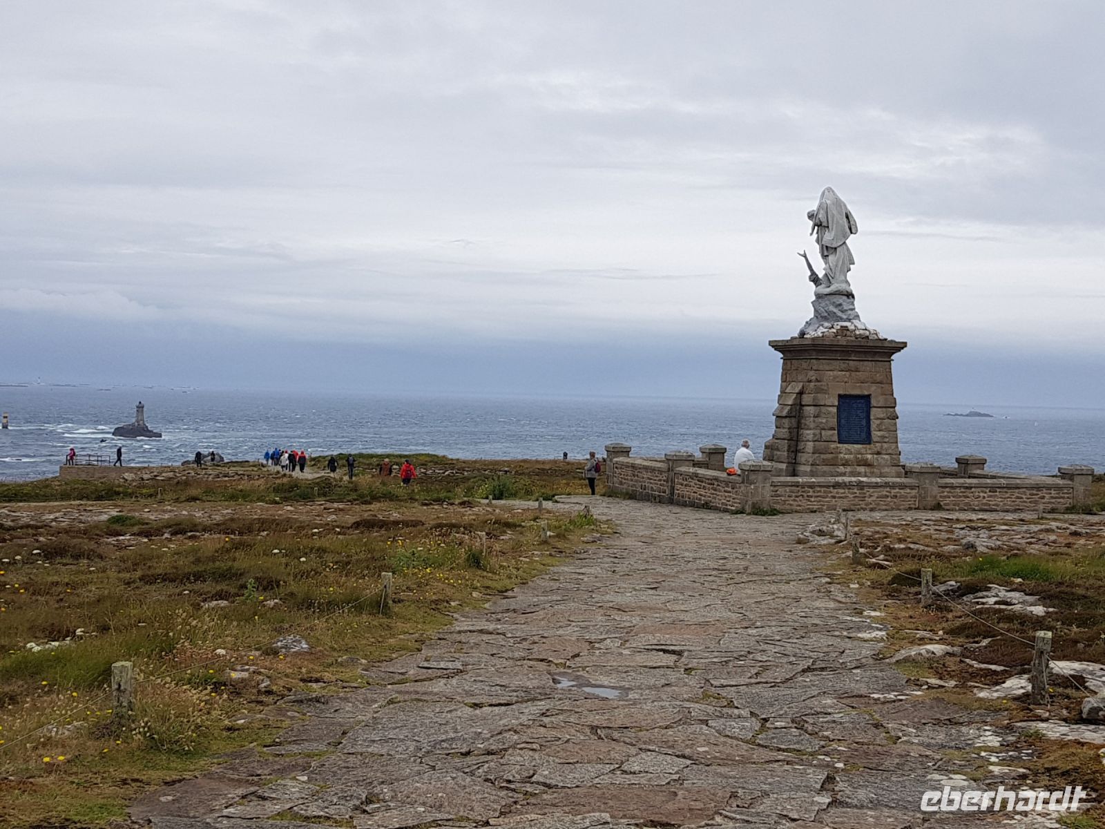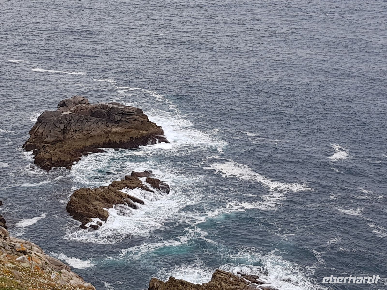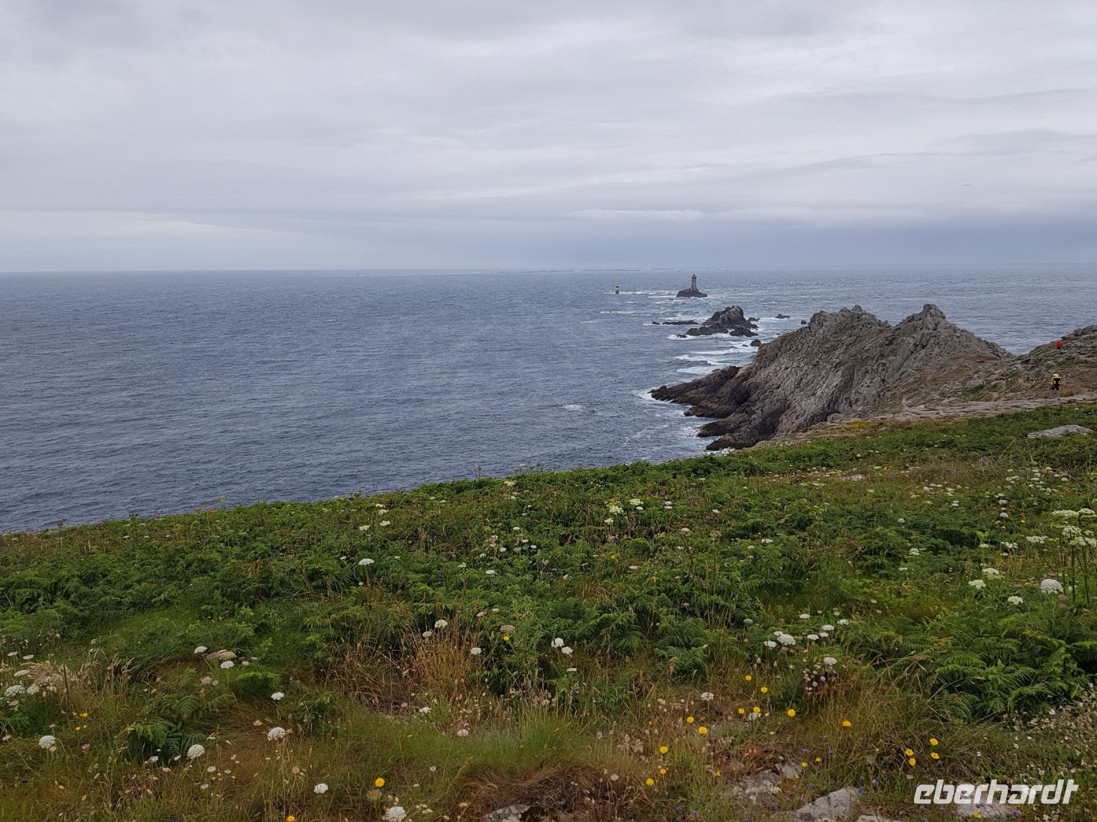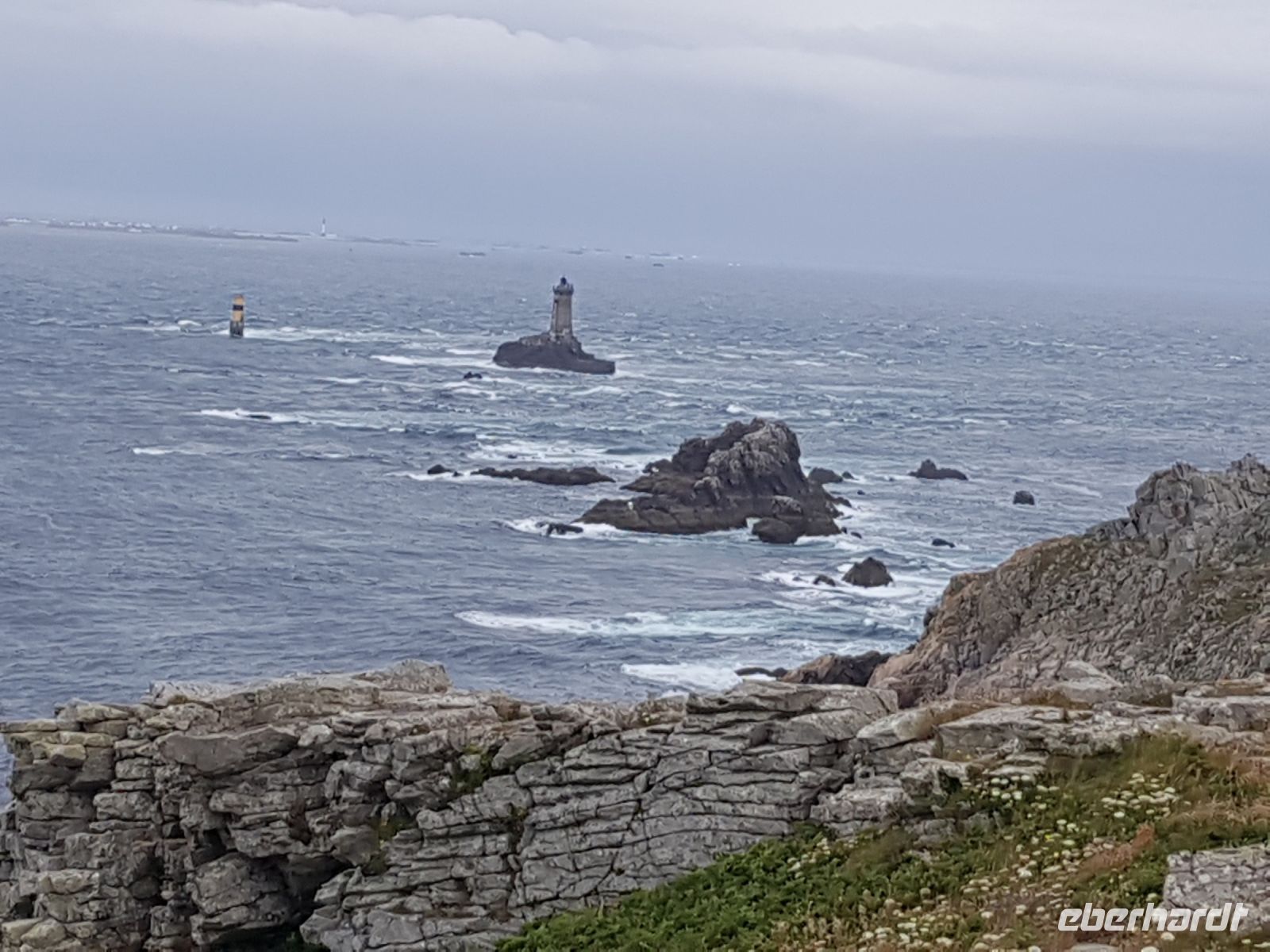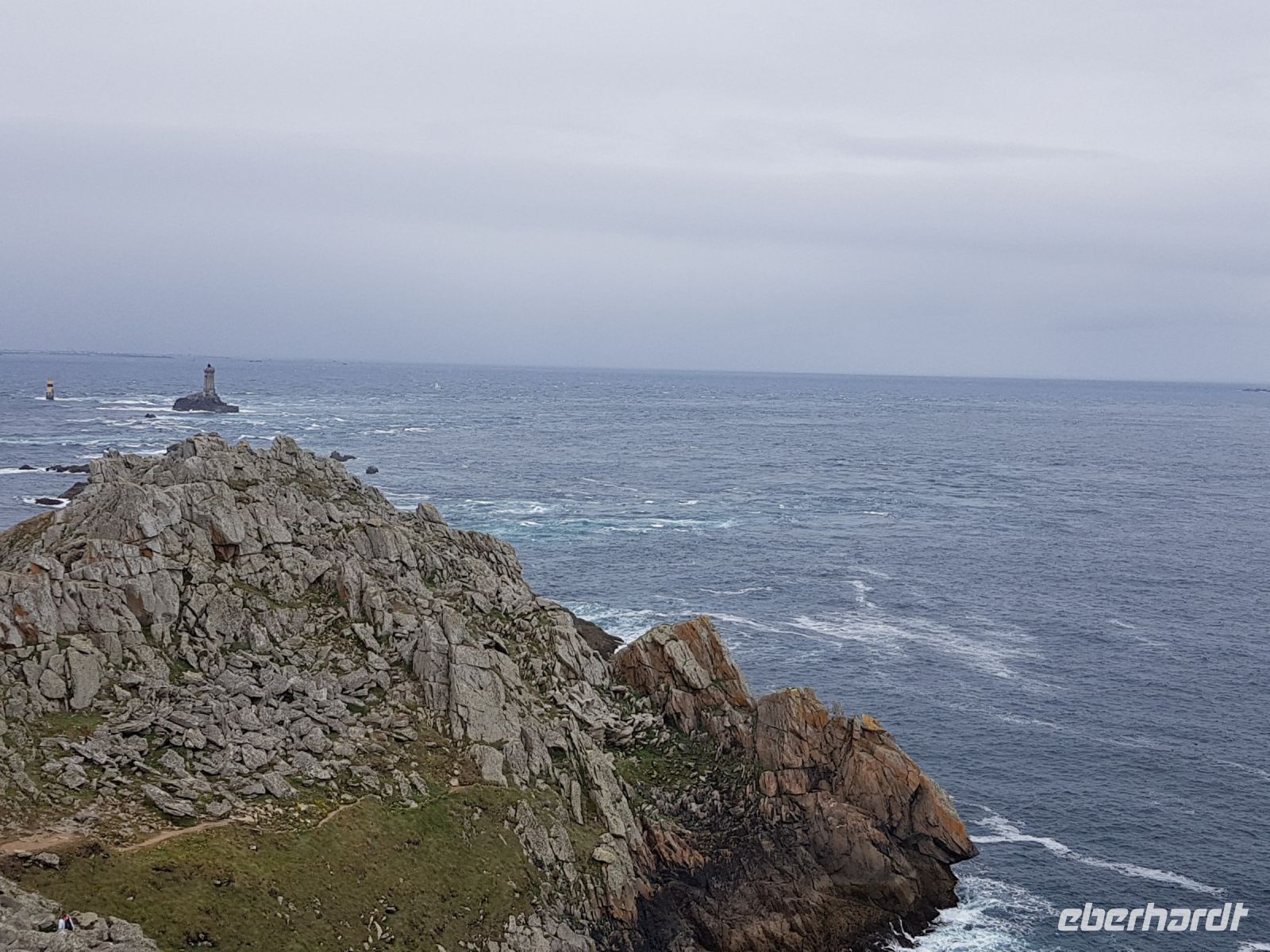 Dann errichten wir den Parkplatz an der Pointe du Raz und nahmen uns Zeit, um die bizarre Pointe du Raz auf einen ca. 15 minütigen Fußweg zu erwandern. Fantastischer Weise sahen wir sogar die Ile de Sein mit ihren Häusern für einige Minuten, dann war sie wieder hinter einem Wolkenschleier verborgen. Die vielen Felsriffe an der Küste und die gefährlichen Strömungen im Meer verursachten in der Vergangenheit hier sehr viele Schiffsbrüche. Um sie zu verringern errichtete man seit Ende des 19. Jahrhunderts zwei Leuchttürme. Heute ist die Passage der Pointe du Raz für den Schiffsverkehr gesperrt.