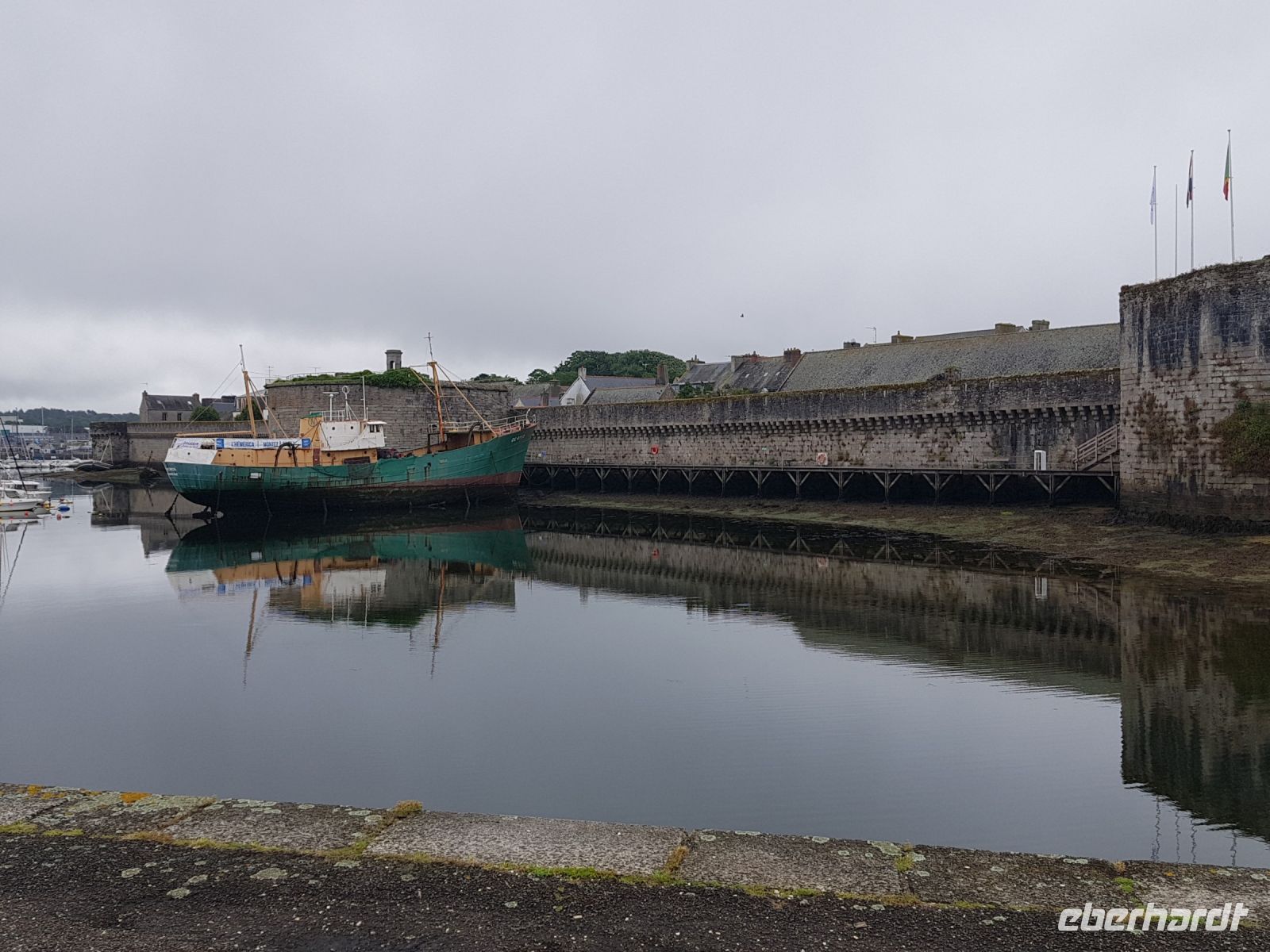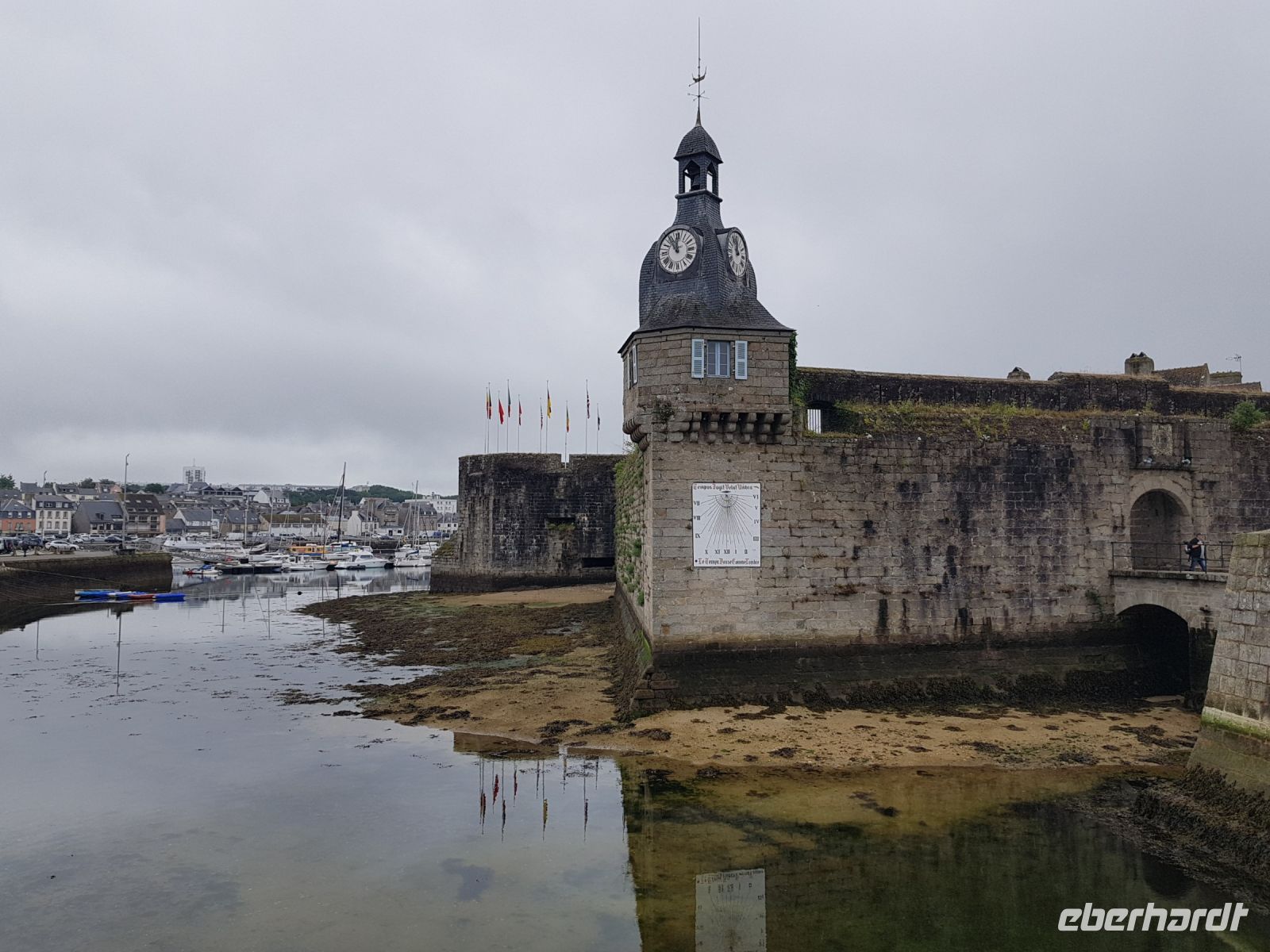 Zuerst erreichten wir die Hafenstadt Concarneau, die in den letzten Jahren durch die Krimiserie von Jean-Luc Bannalec hochberühmt geworden ist. Wir erkundeten gemeinsam die Altstadt, die einst eine wichtige Festung an der bretonischen Küste war und sich heute ganz auf den Tourismus eingestellt hat. Die Fischerei erlitt 1905 einen tiefen Einbruch, als die Sardinenschwärme plötzlich ausblieben und die Fischer keine Arbeit mehr hatte. Künstler aus dem nahe gelegenen Pont-Aven kamen in dieser Situation auf die Idee, eine Wohltätigkeitsveranstaltung für die Fischerfamilien zu veranstalten. Daraus ging die Fête des Filets Bleus, Festival der blauen Netze, hervor, das heute jedes Jahr Mitte August großartig gefeiert wird.