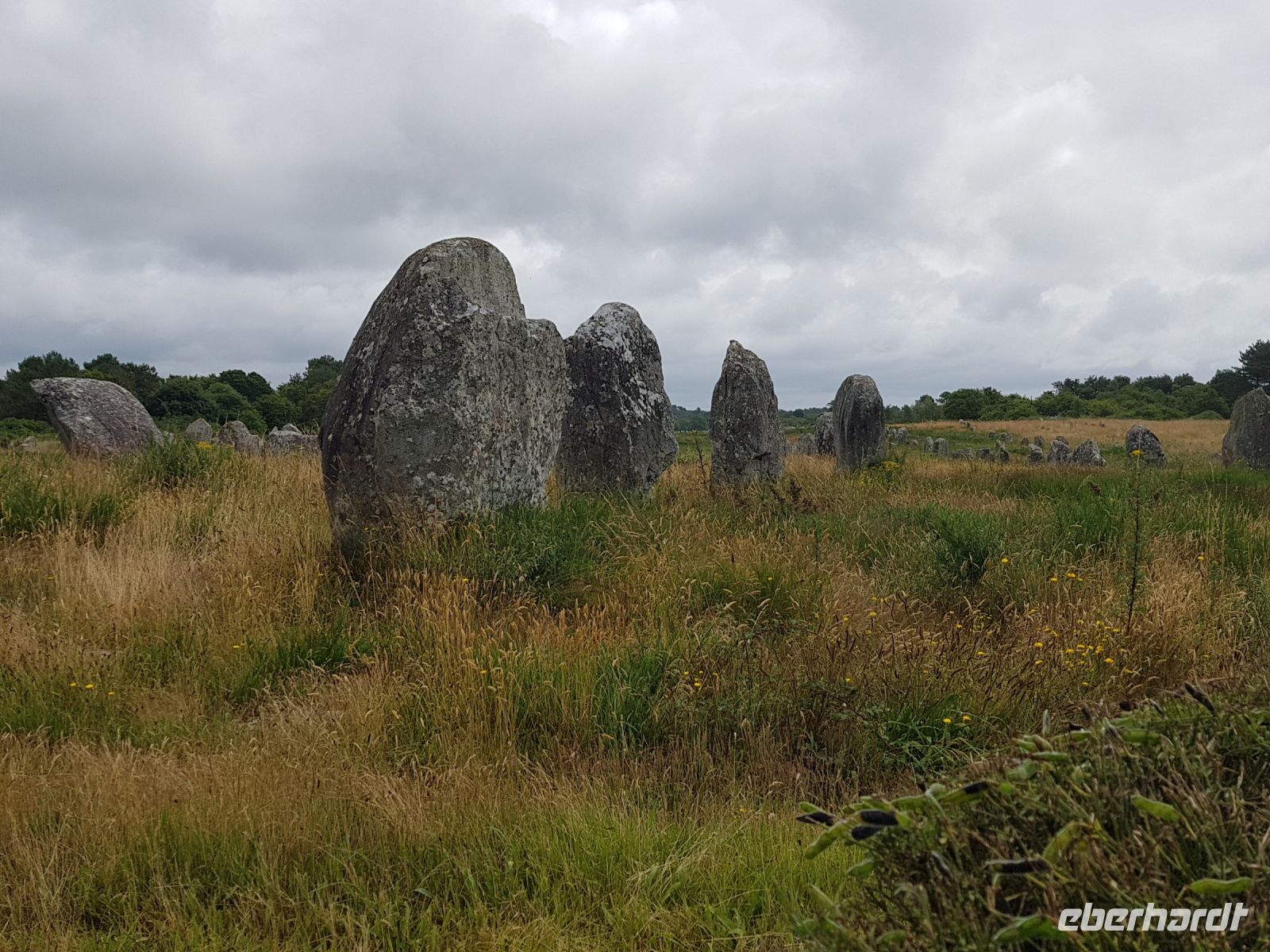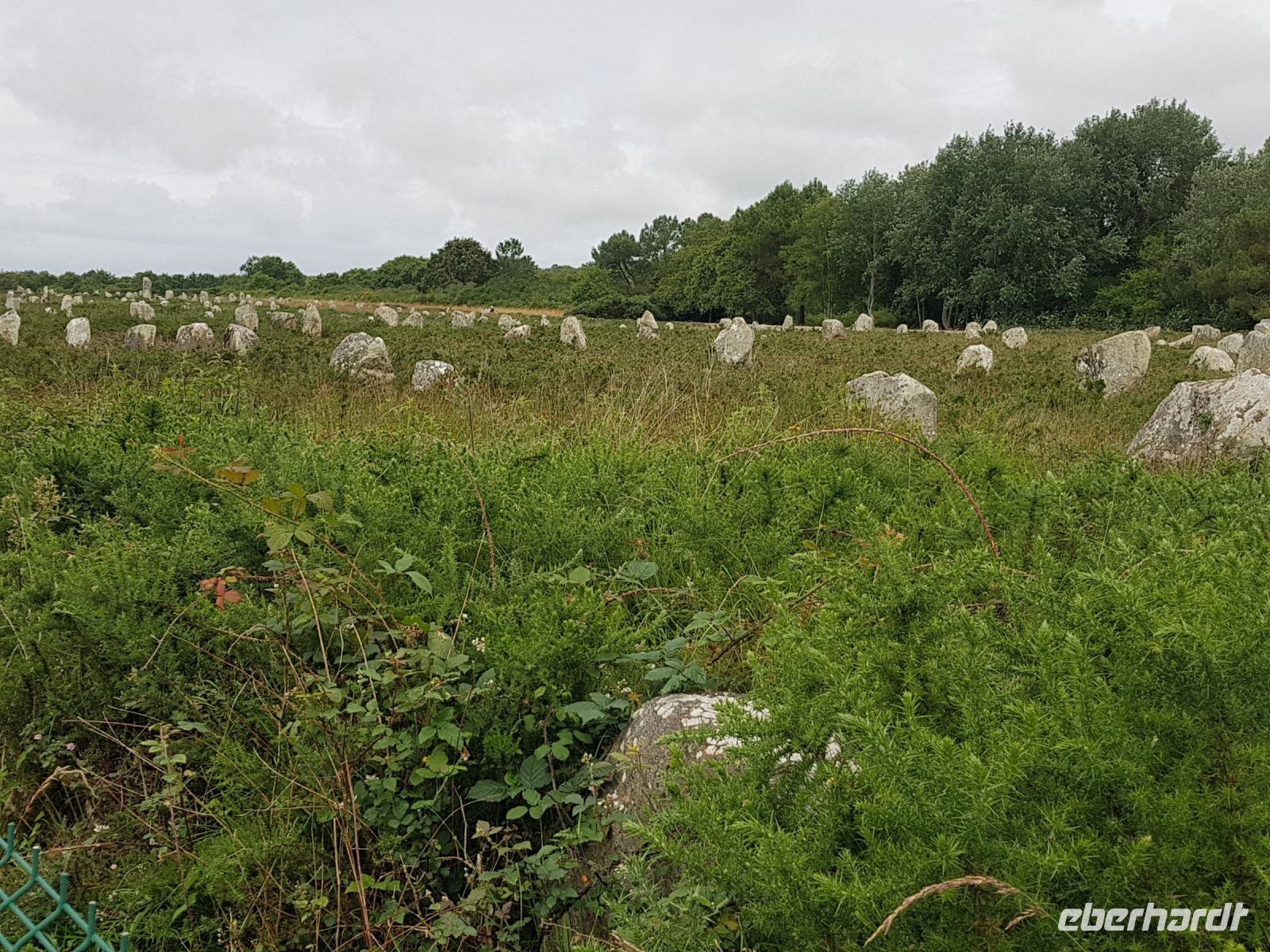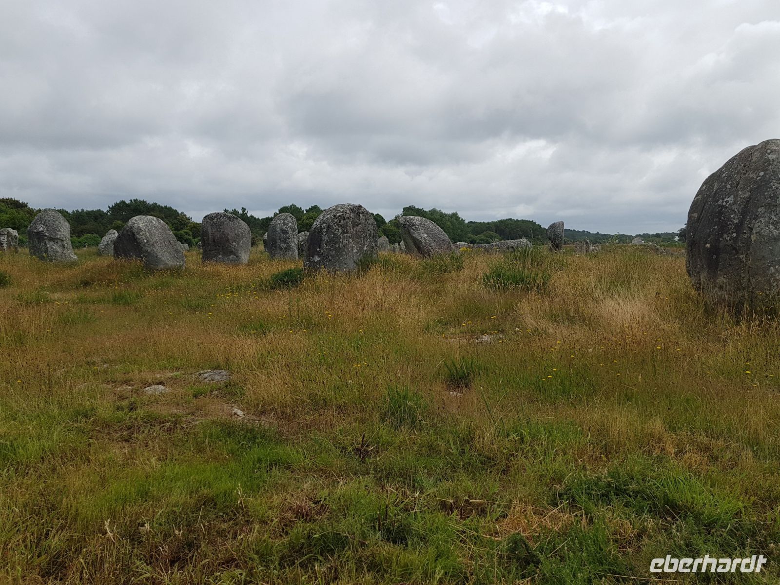 Gegen Mittag kamen wir in das Departement Morbihan, wo wir die weltberühmten Megalithanlagen von Carnac besuchten. Die Steinreihen von Le Menec, wo wir unseren Bus parkten, erstrecken sich über 11 Steinreihen von bis zu 3 m hohen Menhiren auf einer Fläche von einem Kilometer. Die gesamte, aus der Jungsteinzeit stammende Anlage ist ca. vier Kilometer lang und erstreckt sich über mehrere Abschnitte. Wenn eine schlüssige Erklärung für diese 6000 Jahre alte Anlage noch nicht gefunden wurde, so kann man zumindest vermuten, dass es sich hier um die älteste bisher bekannte Kultstätte der Menschheit handelt.