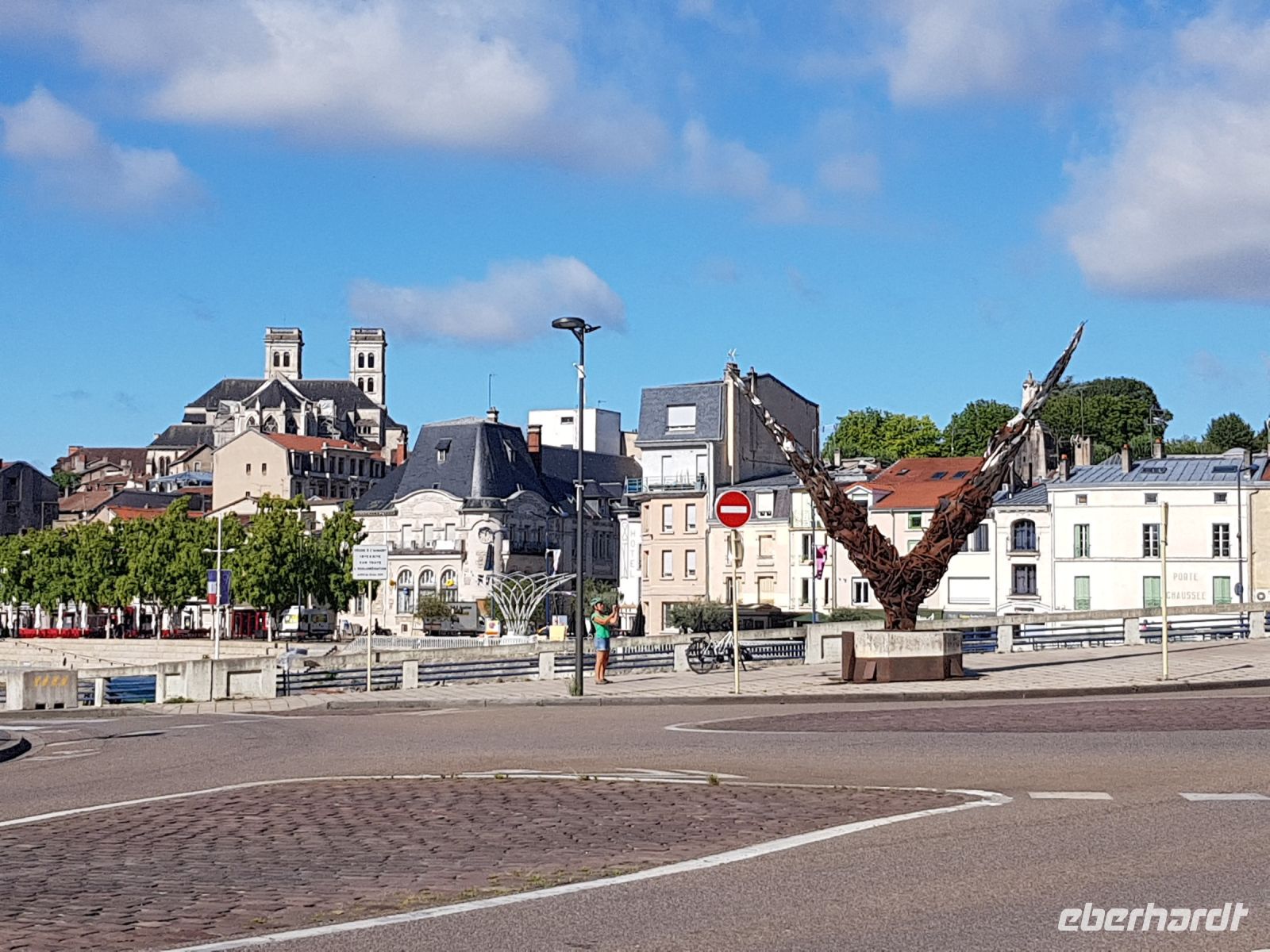 Nach weiteren Zustiegen von Reisegästen in Sachsen und Thüringen erreichten wir im Laufe des Vormittags die Autobahnraststätte Rimberg, wo unsere Busfahrer die Plätze tauschten. Während der eine Busfahrer Michael, der uns vom Dresdener Flughafen hier her gefahren hatte, mit dem PKW wieder zurück fuhr, begann der andere Michael nun gemeinsam mit uns unsere 10tägige Rundreise. Im Laufe des Nachmittags erreichten wir die deutsch-französische Grenze und kamen wenig später in Metz an, der einstigen Hauptstadt der französischen Region Lorraine (Lothringen) und heutigen Metropole in der Großregion Grand Est. Im milden Licht des Nachmittags, das den Sandstein der historischen Gebäude in ein sattes Gelb tauchte, unternahmen wir hier einen kleinen Rundgang. So sahen wir zunächst die Place de la commedie (dem Theaterplatz) und den Temple neuf (Protestantische Kirche) auf der Moselinsel, spazierten dann über eine der Moselbrücken zur Kathedrale und besichtigten diese. Was für ein imposantes Bauwerk ! Sie ist mit ihren 42 m Gewölbehöhe nicht nur eins der höchsten Kathedralen Frankreichs sondern besitzt eine Reihe außergewöhnlicher, prachtvoller Glasfenster. Darunter die Renaissancefenster des Straßburger Meisters Valentin Bousch, die faszinierenden Glasfenster von Marc Chagall, die uns am stärksten beeindruckten sowie weitere wunderbare Fenster von Glaskünstlern des 20. Jahrhunderts wie Jacques Villon und Roger Bissière.