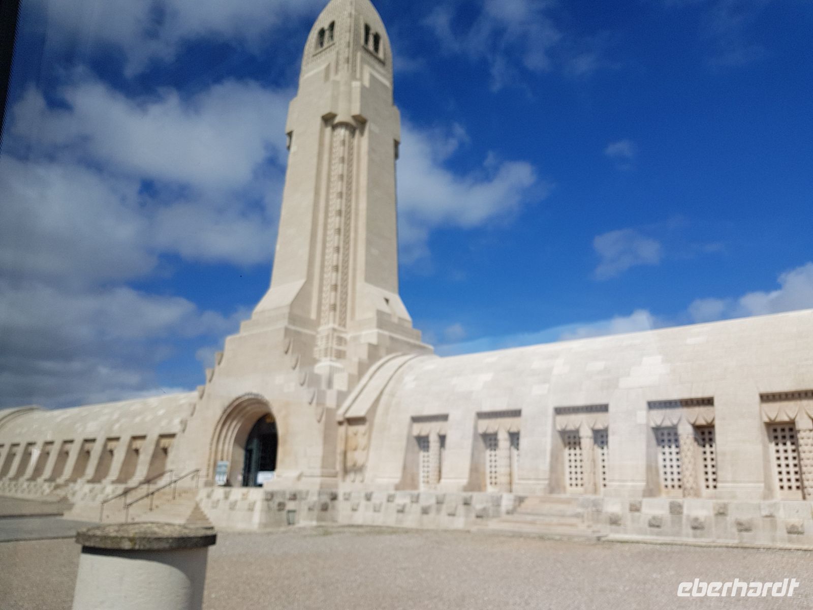 Nach einem guten Frühstück brachten wir unsere Koffer zum Bus um unsere Reise fort zusetzten. Unser Ziel hieß heute Verdun, die Jahrhunderte alte Stadt, die als Handelsstadt und Kunstzentrum einst eine glanzvolle Vergangenheit hatte. Diese großartige Vergangenheit wurde jedoch im 20. Jahrhundert infolge der Kriegsereignisse des Jahres 1916 in ihrer unmittelbaren Nähe durch ein düsteres, schmerzliches Kapitel ergänzt. Wir erreichten unseren Treffpunkt etwas eher und konnten so vom Stadttor, der Stadtmauer und dem Ufer der Maas noch ein paar Fotos machen. Dann begann unsere Besichtigung der Schlachtfelder von Verdun, wo uns Madame Ursula Mériot, unsere örtliche Fremdenführerin, sehr sachkundig, feinfühlig und kenntnisreich führte. Wir sahen zuerst das Fort Douaumont, an dem vom Februar bis November 1916 erbittert und unter ungeheuren Opfern an Menschenleben gekämpft wurde. Die feuchten Gänge und düsteren Funktions- und Mannschaftsräume dokumentieren bis heute den Schrecken des Krieges. Später fuhren wir zum Beinhaus, das auf Initiative des Bischofs Charles-Marie-André Ginisty von den Architekten Léon Azéma, Jacques Hardy und Max Edrel von 1920 an errichtet und nach 12 Jahren Bauzeit 1932 feierlich eingeweiht wurde. Seine Architektur erinnert an ein Schwert, das bis zum Knauf in den Boden gerammt ist. Im Untergeschoss des längliche Baukörpers befinden sich die sterblichen Überreste von ca. 130.000 nicht identifizierten französischen und deutschen Soldaten. Über ihm erhebt sich eine langgestreckte Krypta, in deren Mauern die Namen und die Lebensdaten der identifizierten Gefallenen eingraviert sind. Später sahen wir hier einen sehr eindrucksvollen Film über die Schlacht von Verdun zwischen Frühjahr und Herbst 1916. Vor unserer Abfahrt legten wir vor dem Beinhaus noch einen Fotostop ein. Hier vor dem Eingang zum Beinhaus begegneten sich im September 1984 der damalige deutsche Bundeskanzler Helmut Kohl und der französische Staatspräsident François Mitterrand zu einer großen Versöhnungsfeier. Während dieser Feier entstand ein Foto das zeigt, wie sich die beiden Staatsmänner die Hände reichen. Diese Foto ging um die Welt und hat bis heute für die deutsch-französischen Beziehungen eine enorme Bedeutung.